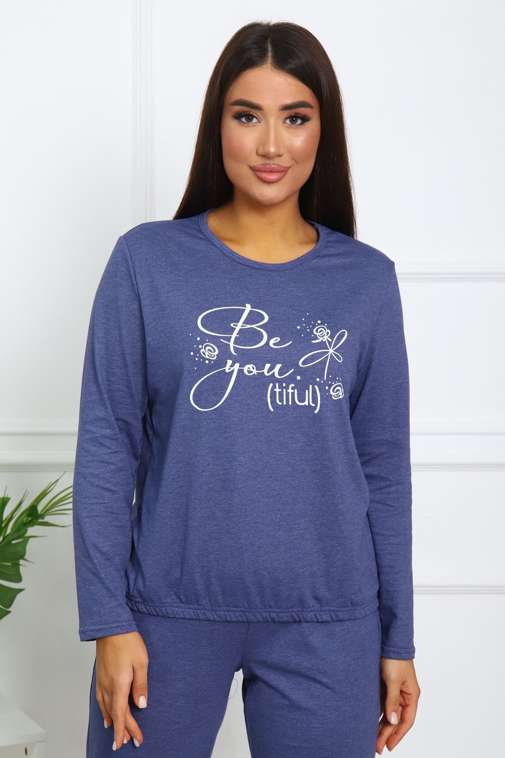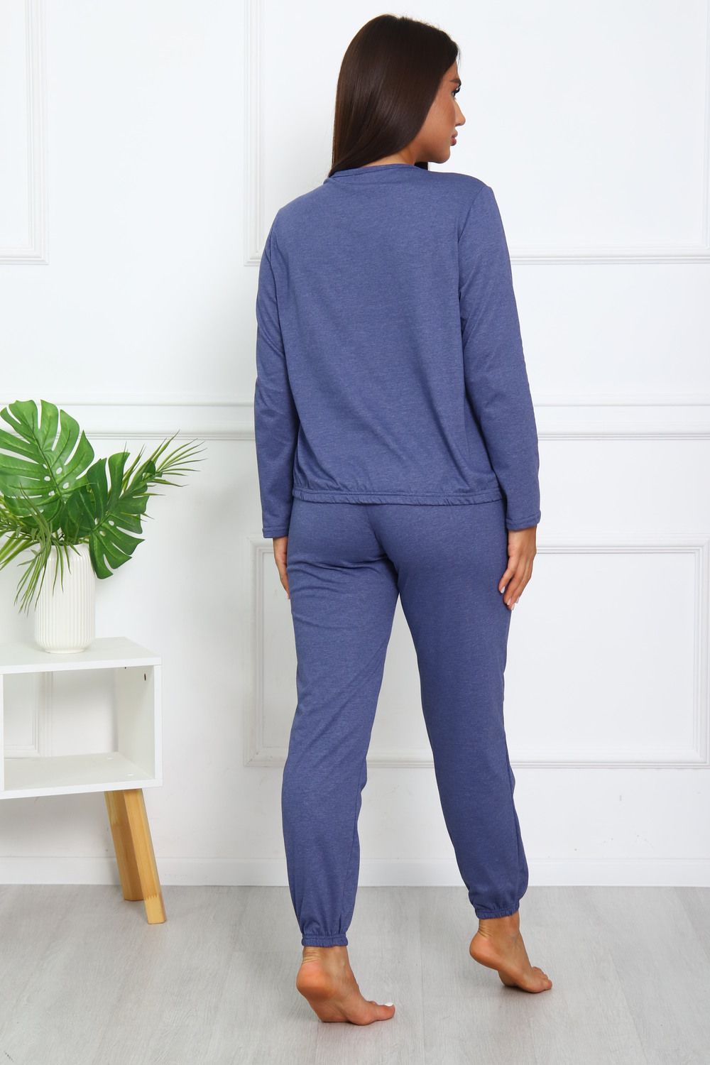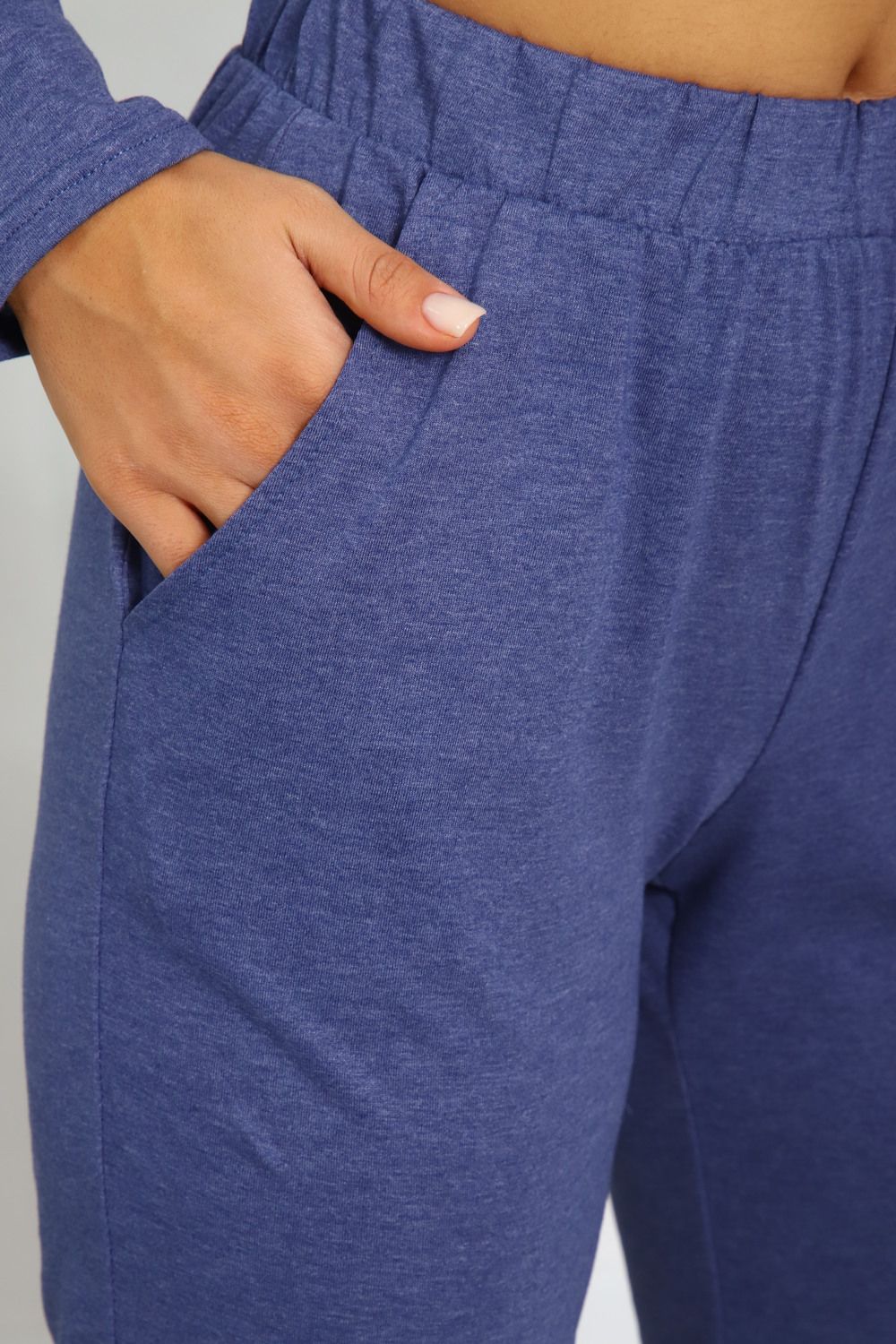 Костюм женский выполнен из меланжированной кулирки. Кофта с длинным рукавом снизу на резинки, горловина окантована, на полочке выполнена печать. Брюки свободного силуэта, по бокам карманы, низ брюк на резинке.