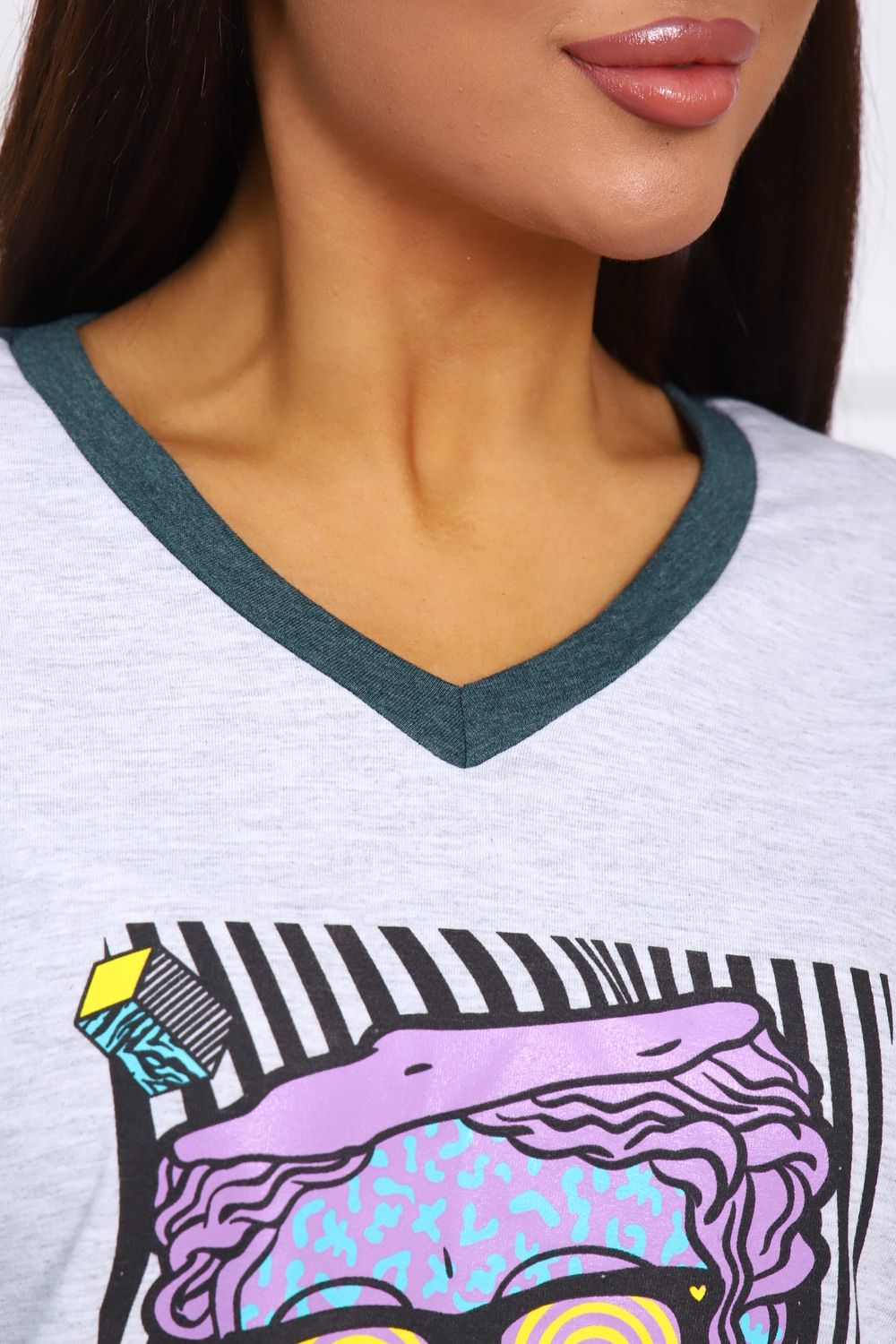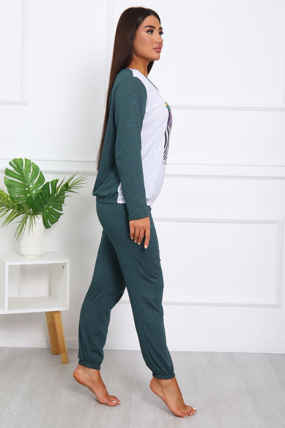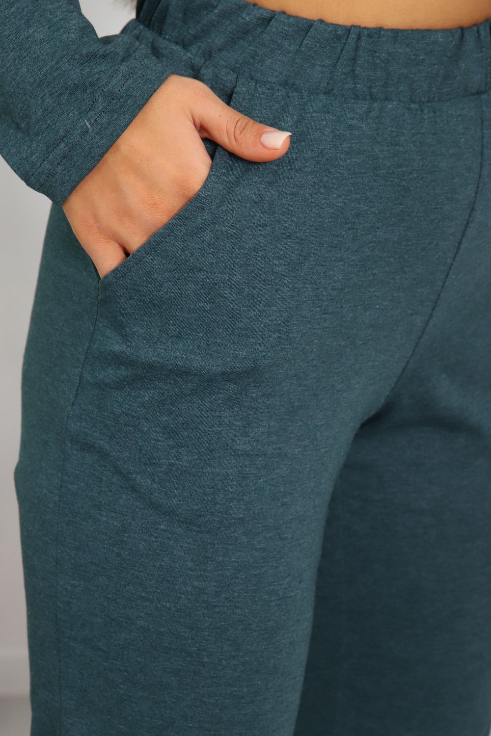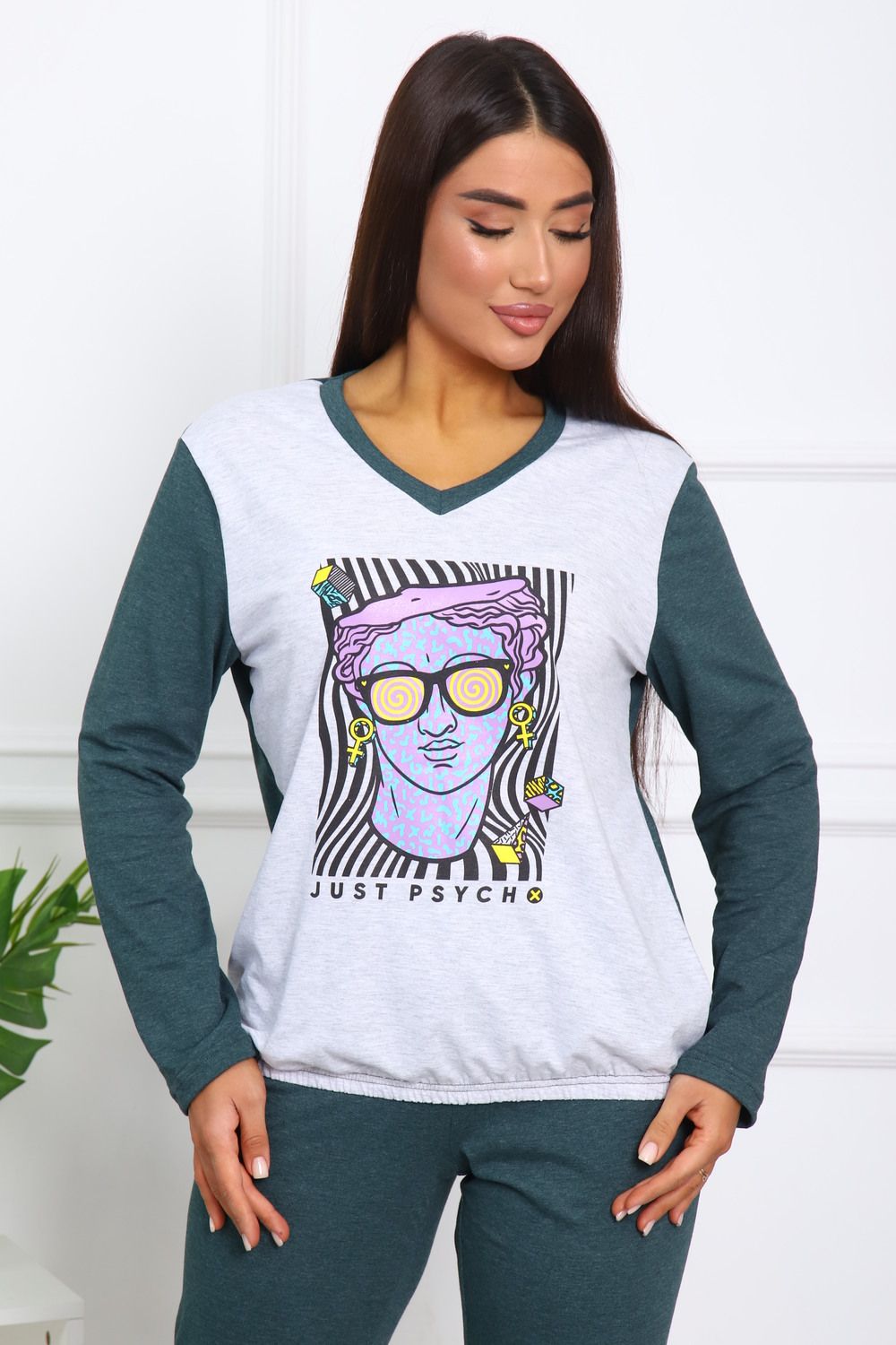 Костюм женский выполнен из меланжированной кулирки. Кофта с длинным рукавом снизу на резинки, на полочке выполнена печать. Брюки свободного силиэта, по бокам карманы, низ брюк на резинке