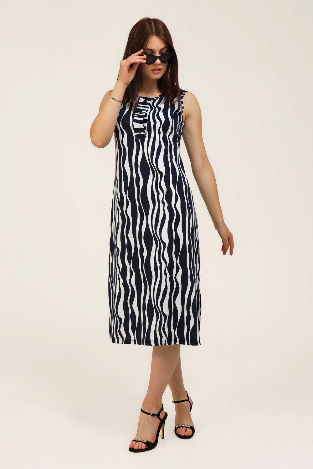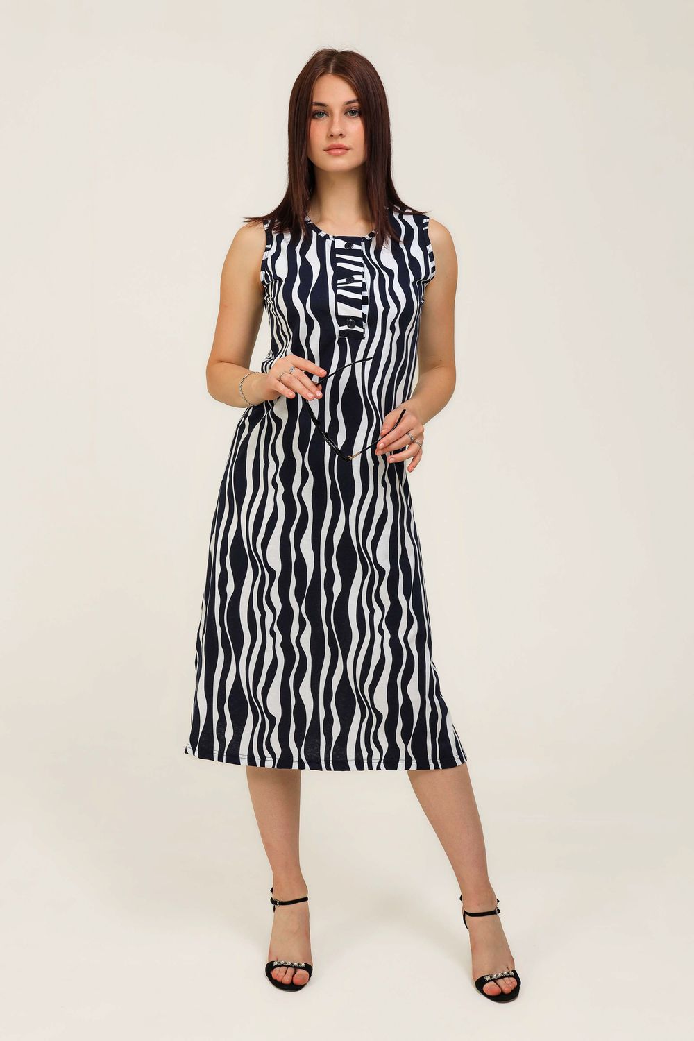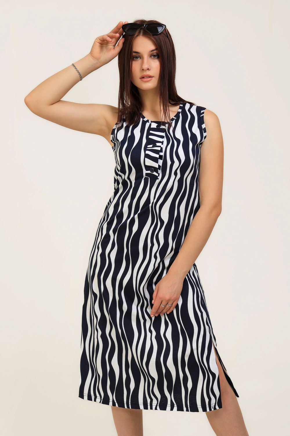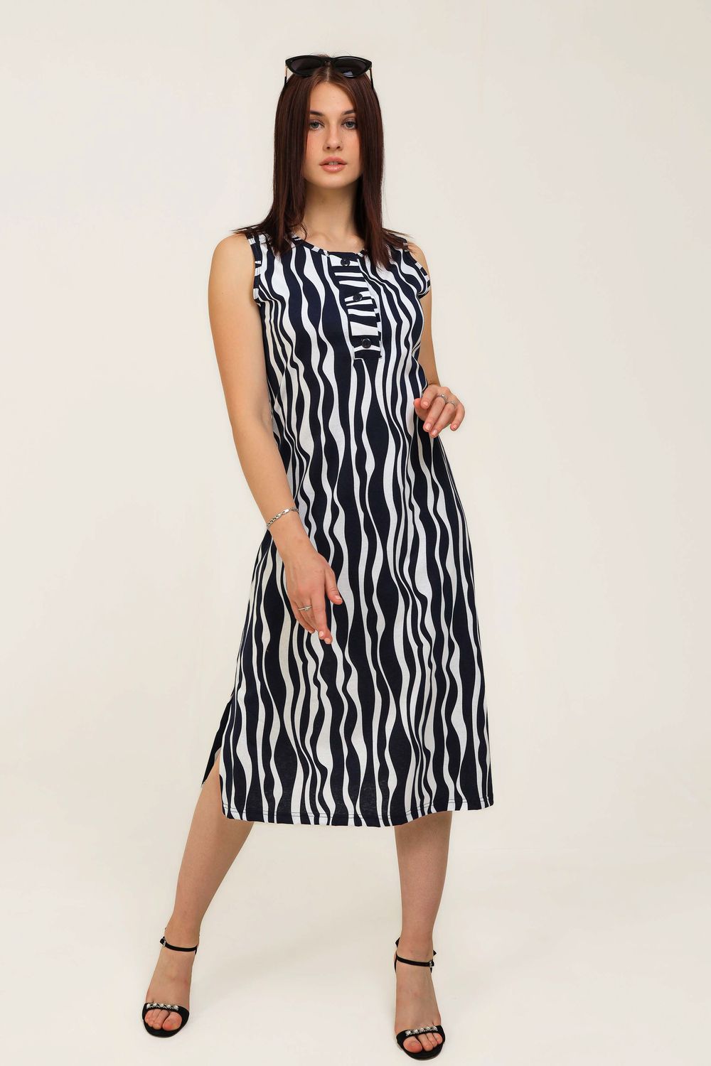 Повседневное платье с рисунком "Волна" средней длинны. Базовая вещь женского гардероба из дышащей, приятной к телу ткани подойдёт на все случаи жизни. Удобный фасон слегка приталенного силуэта, застёжка планка с тремя пуговками, два боковых разреза. Качественно. Удобно. Для тебя.