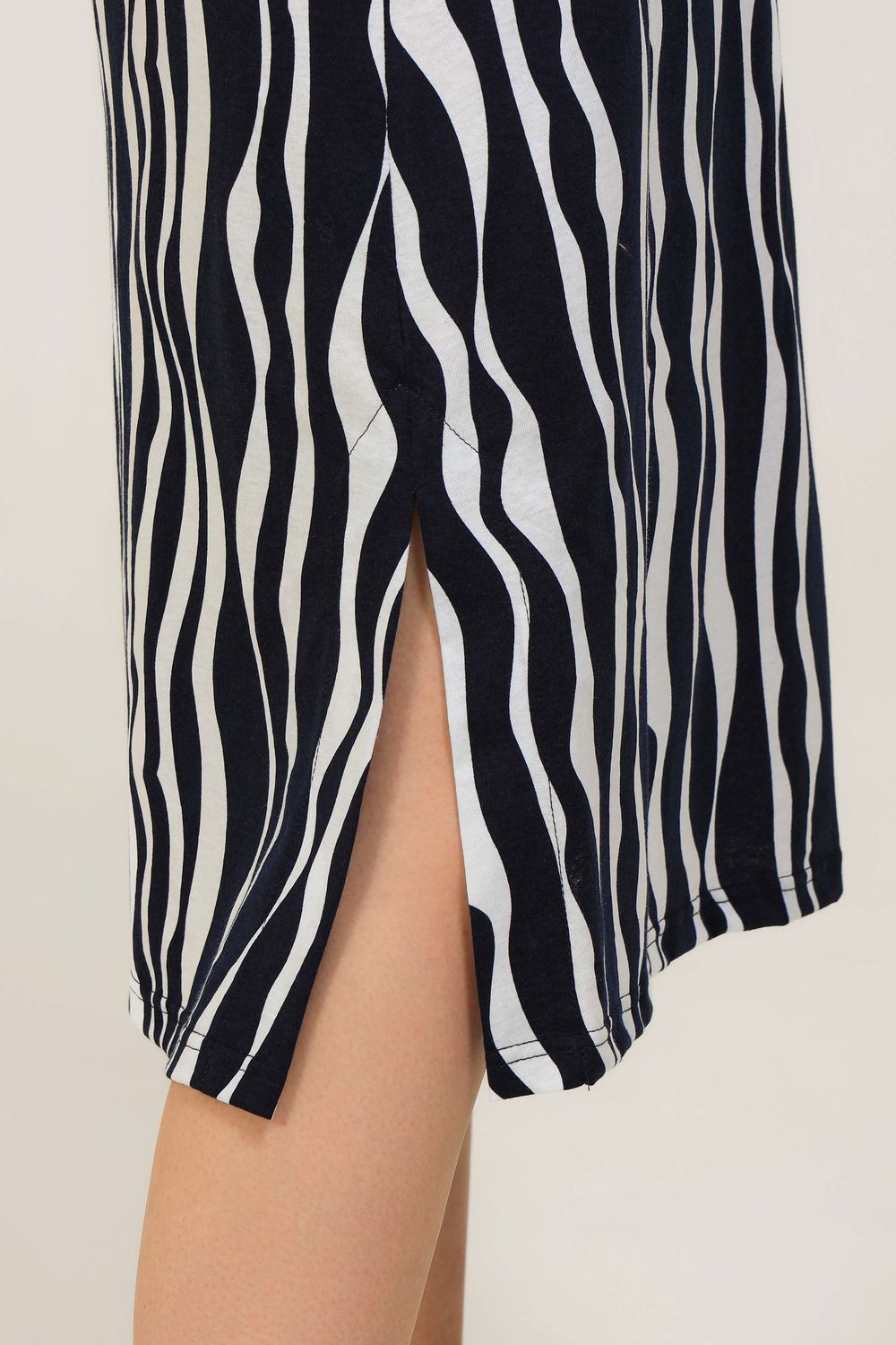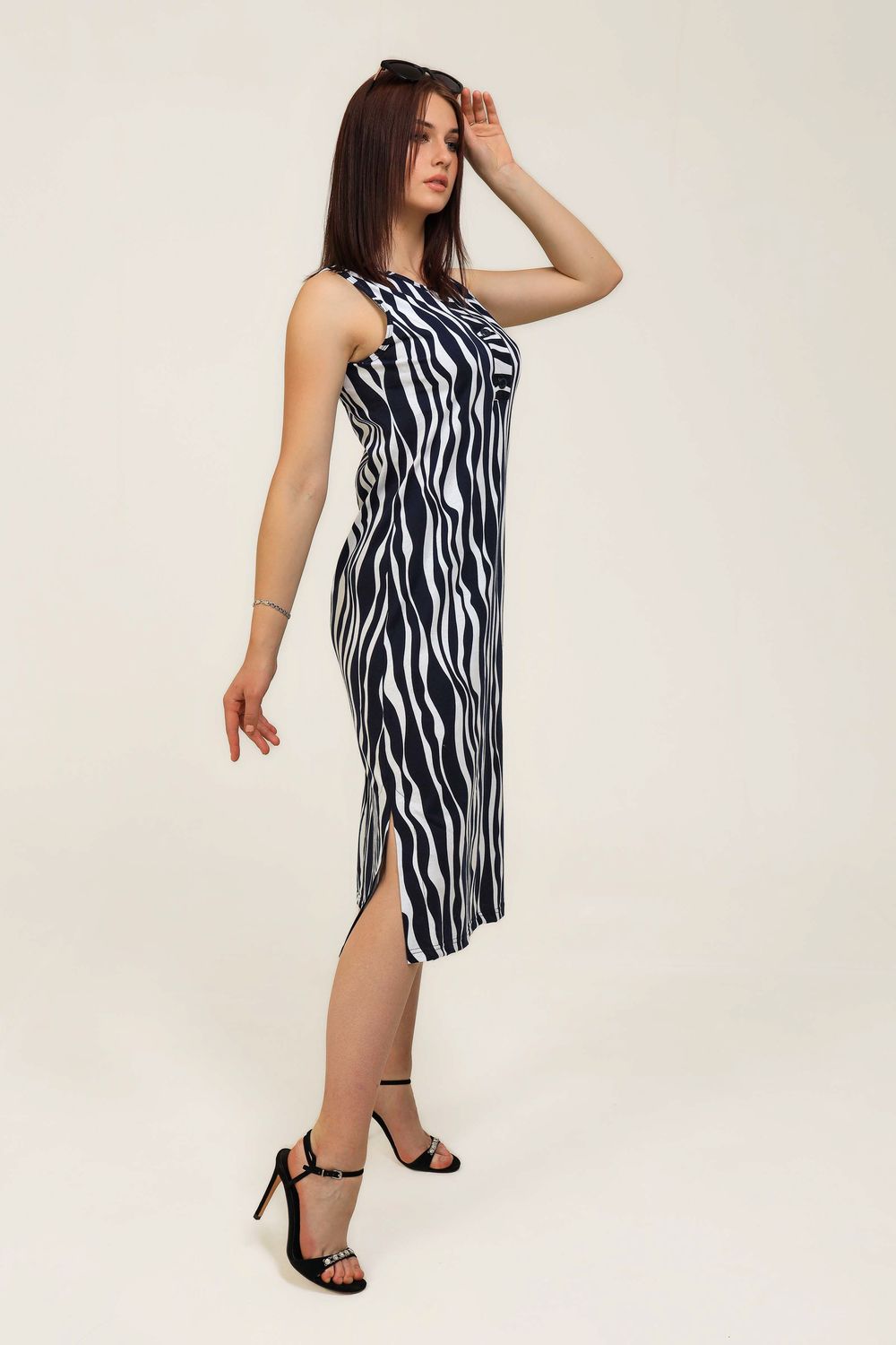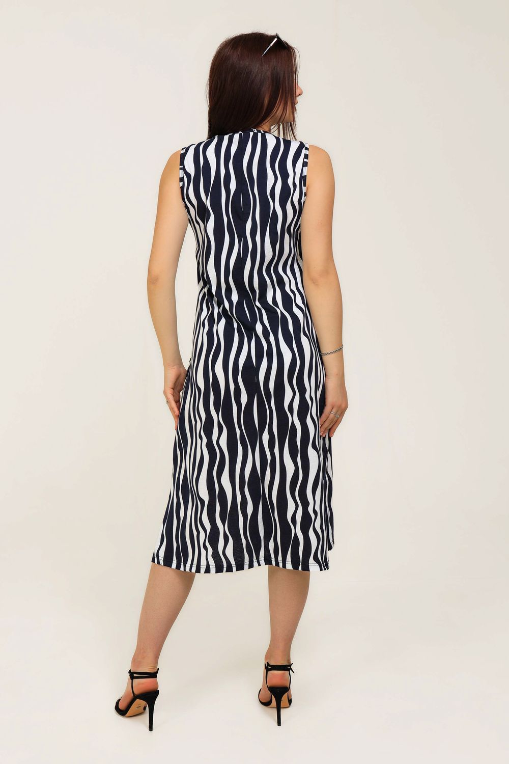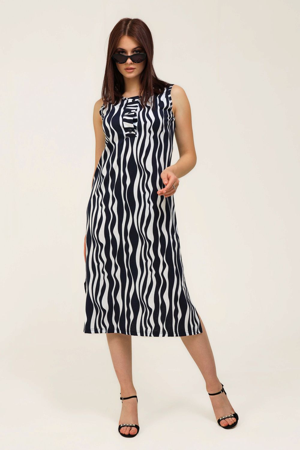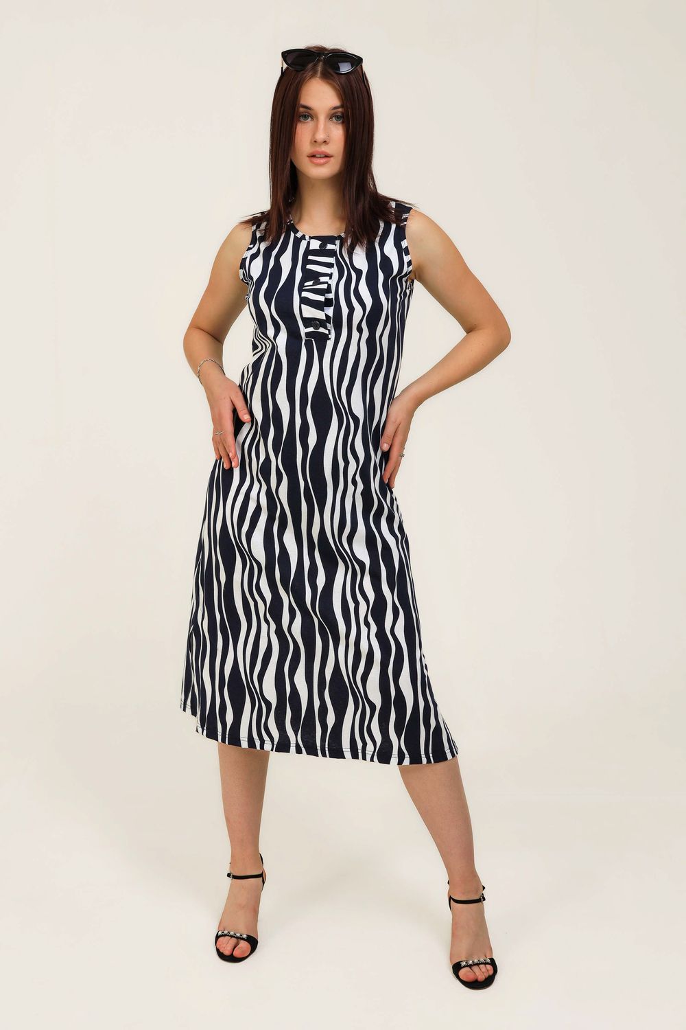 Повседневное платье с рисунком "Волна" средней длинны. Базовая вещь женского гардероба из дышащей, приятной к телу ткани подойдёт на все случаи жизни. Удобный фасон слегка приталенного силуэта, застёжка планка с тремя пуговками, два боковых разреза. Качественно. Удобно. Для тебя.