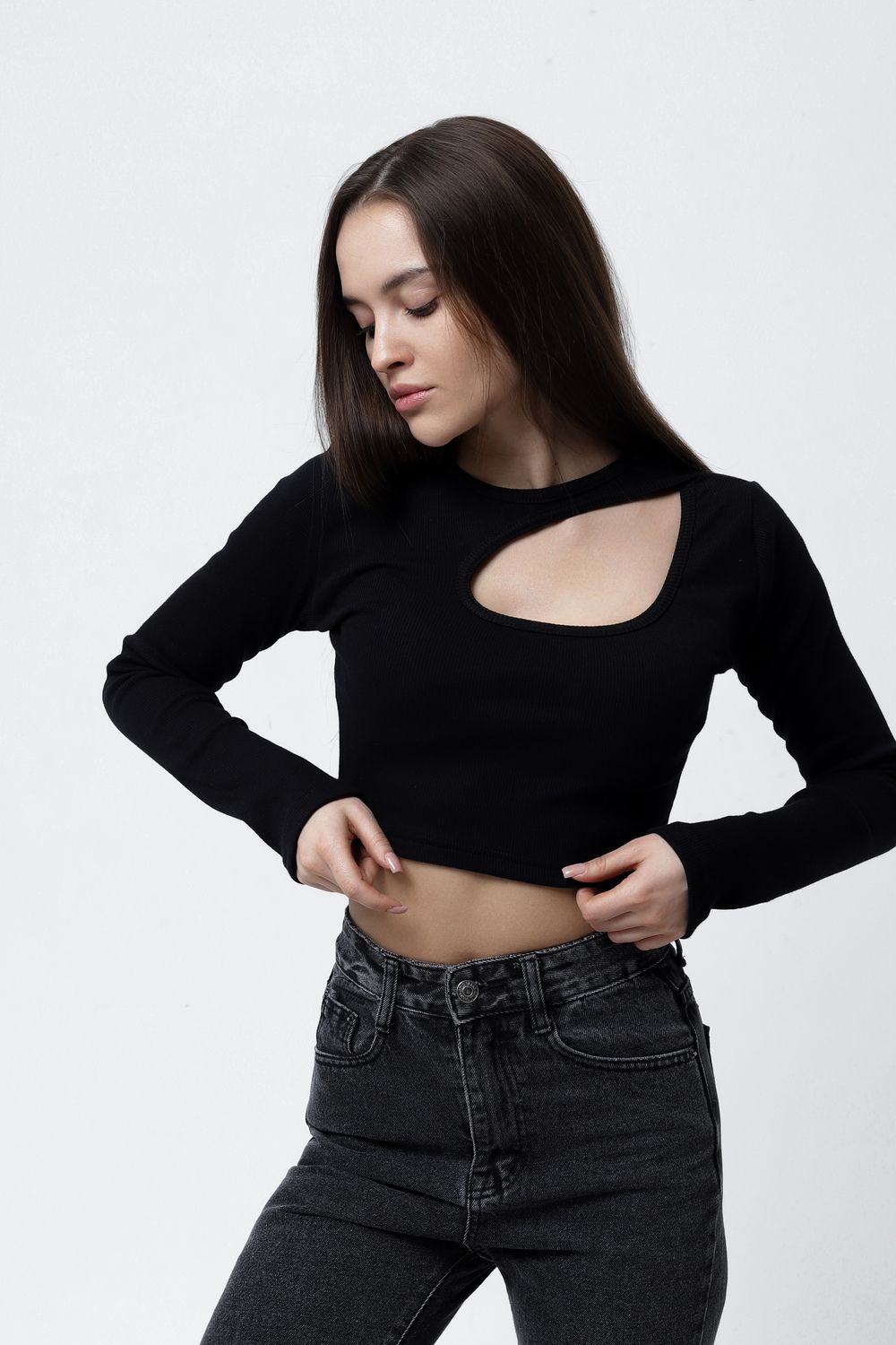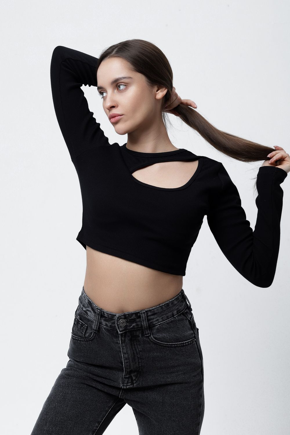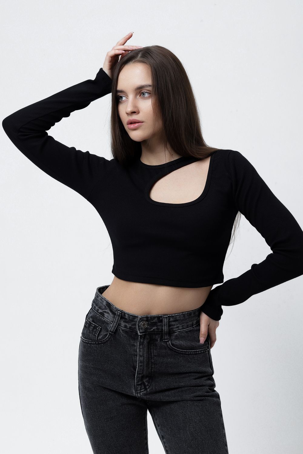 Представляем Вам обтягивающий лонгслив с вырезом на груди и длинными рукавами. ВНИМАНИЕ: Вам может прийти изделие с вырезом как справа, так и слева, мы не можем на это повлиять!