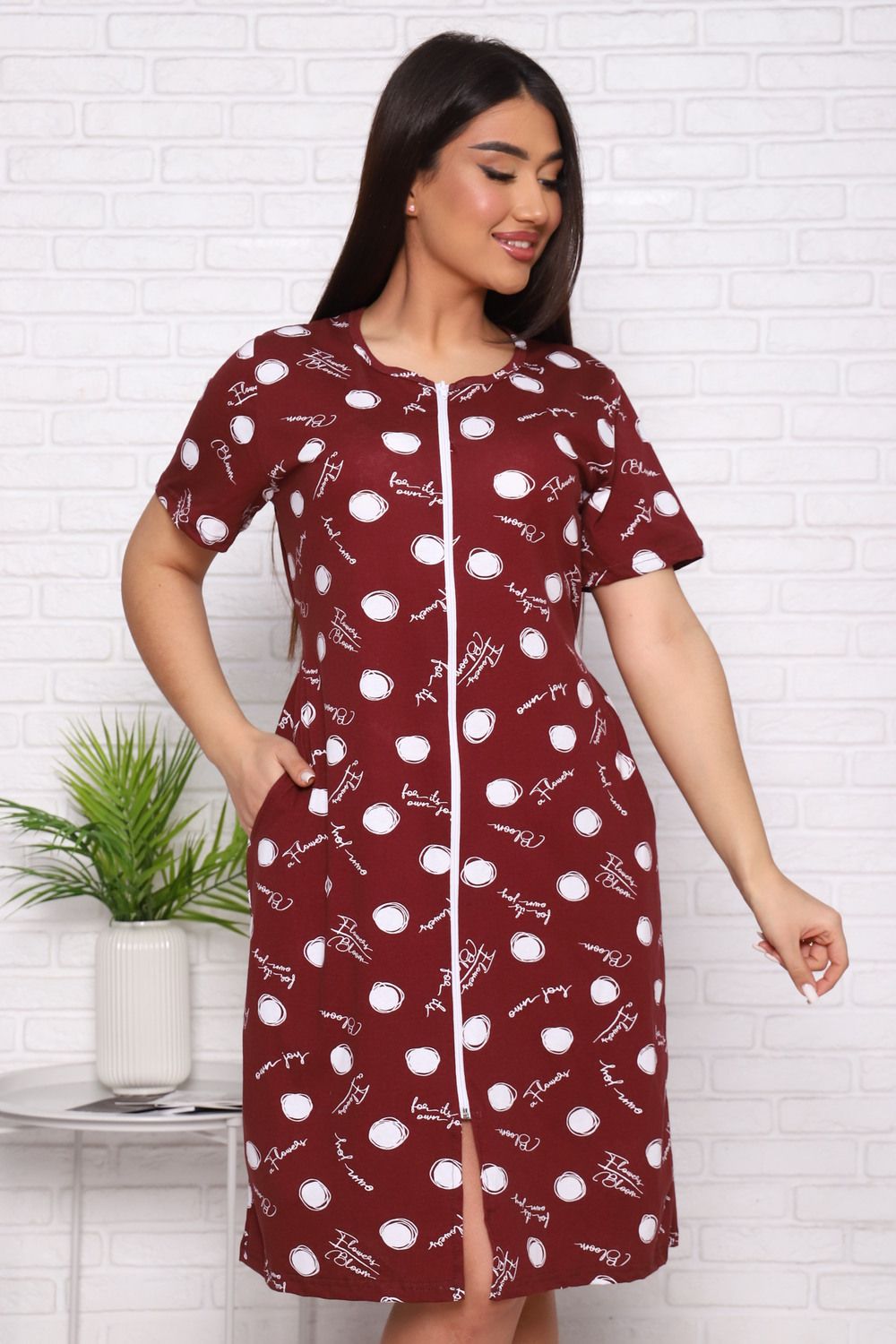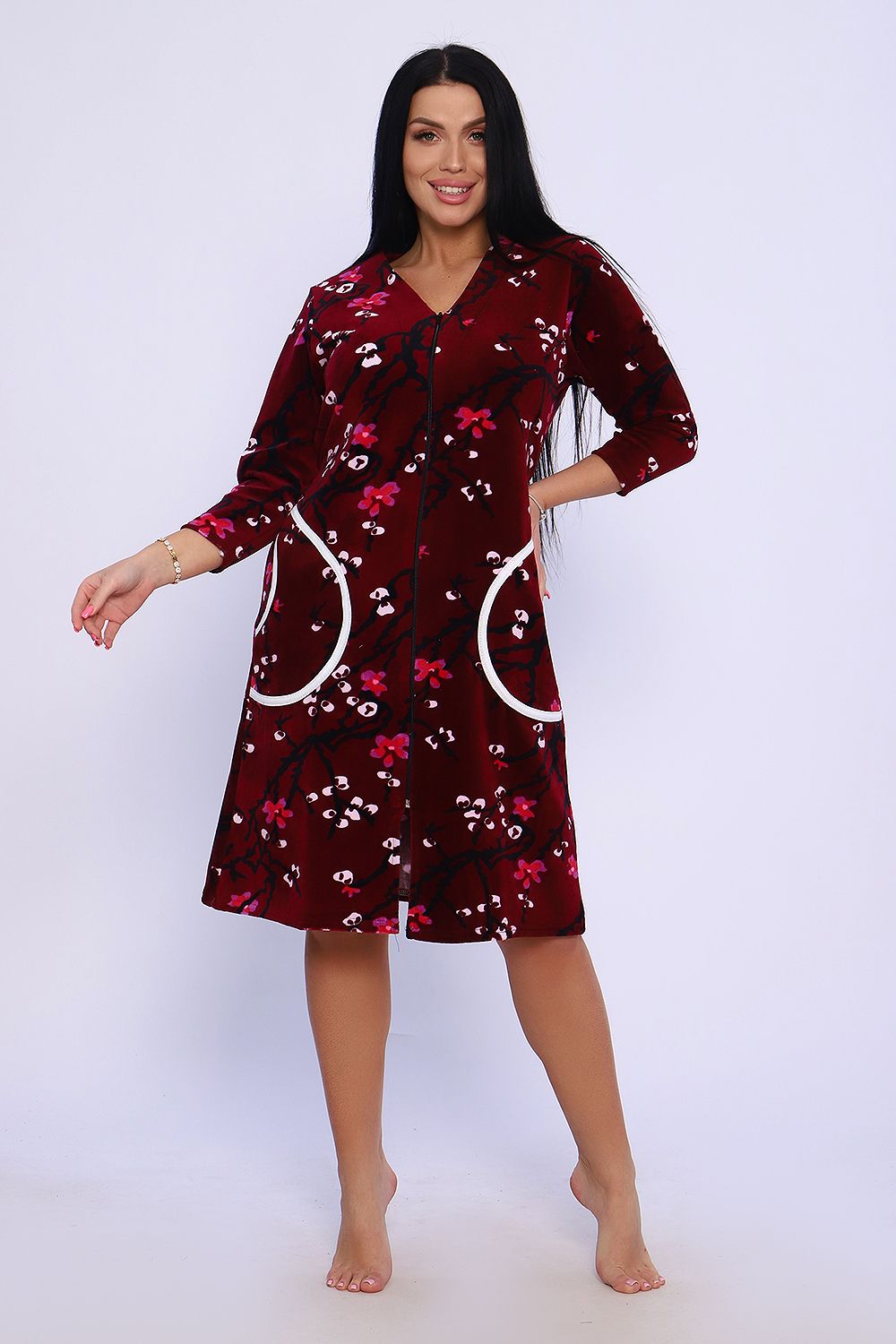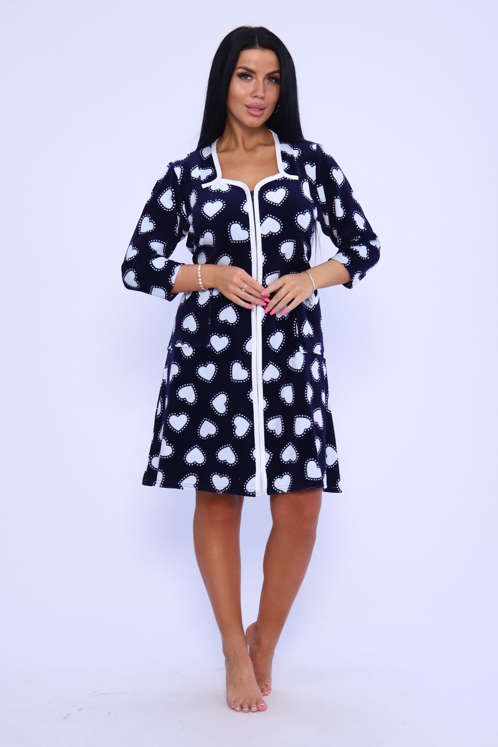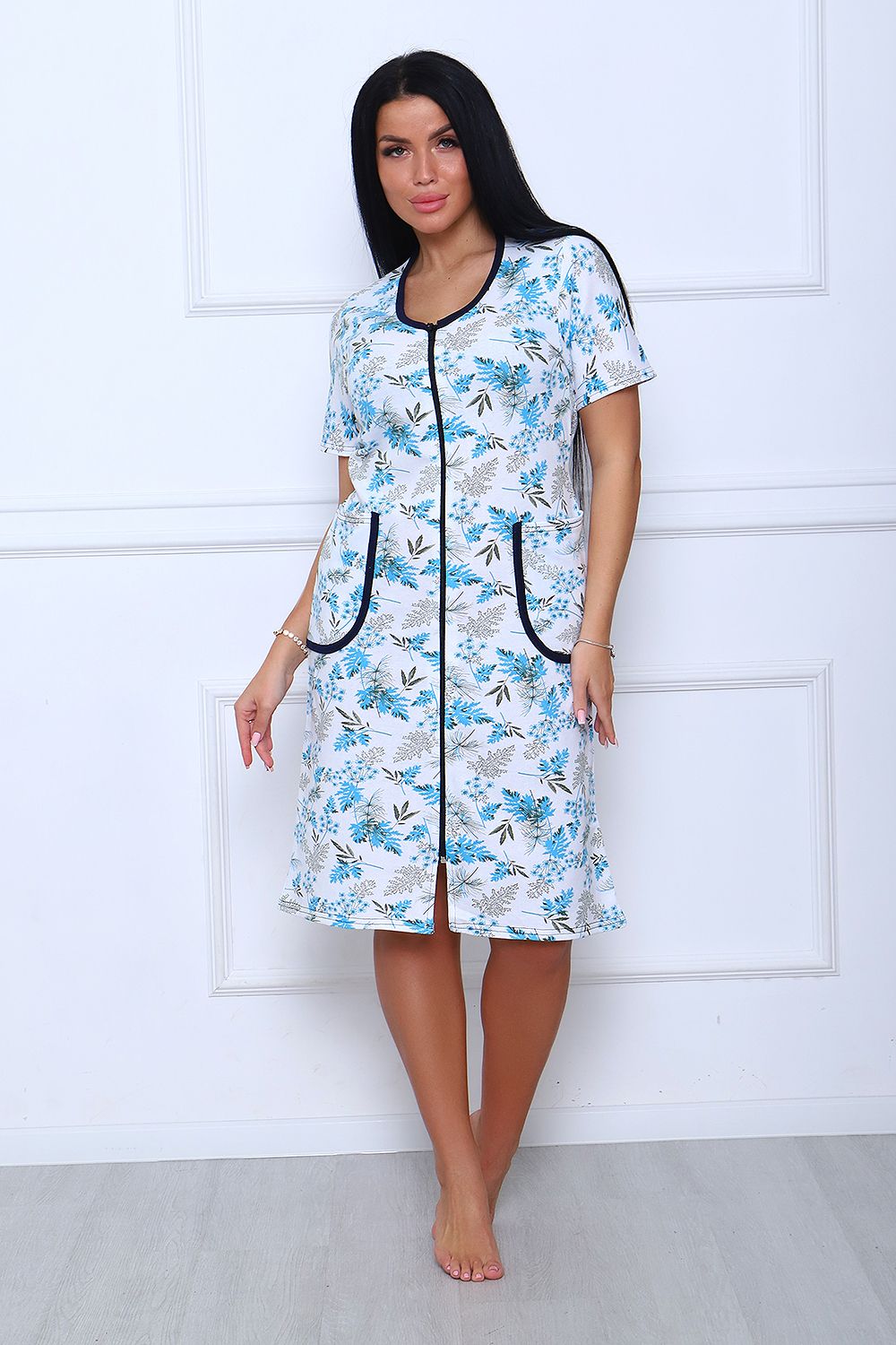 Халат женский, выполнен из трикотажного полотна кулирка. Халат на молнии, чуть ниже колен, по бокам карманы.