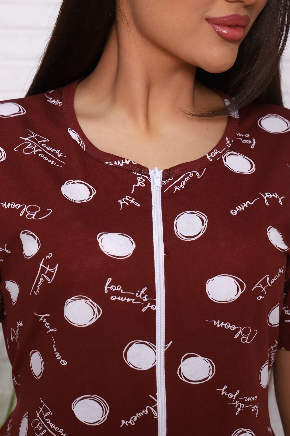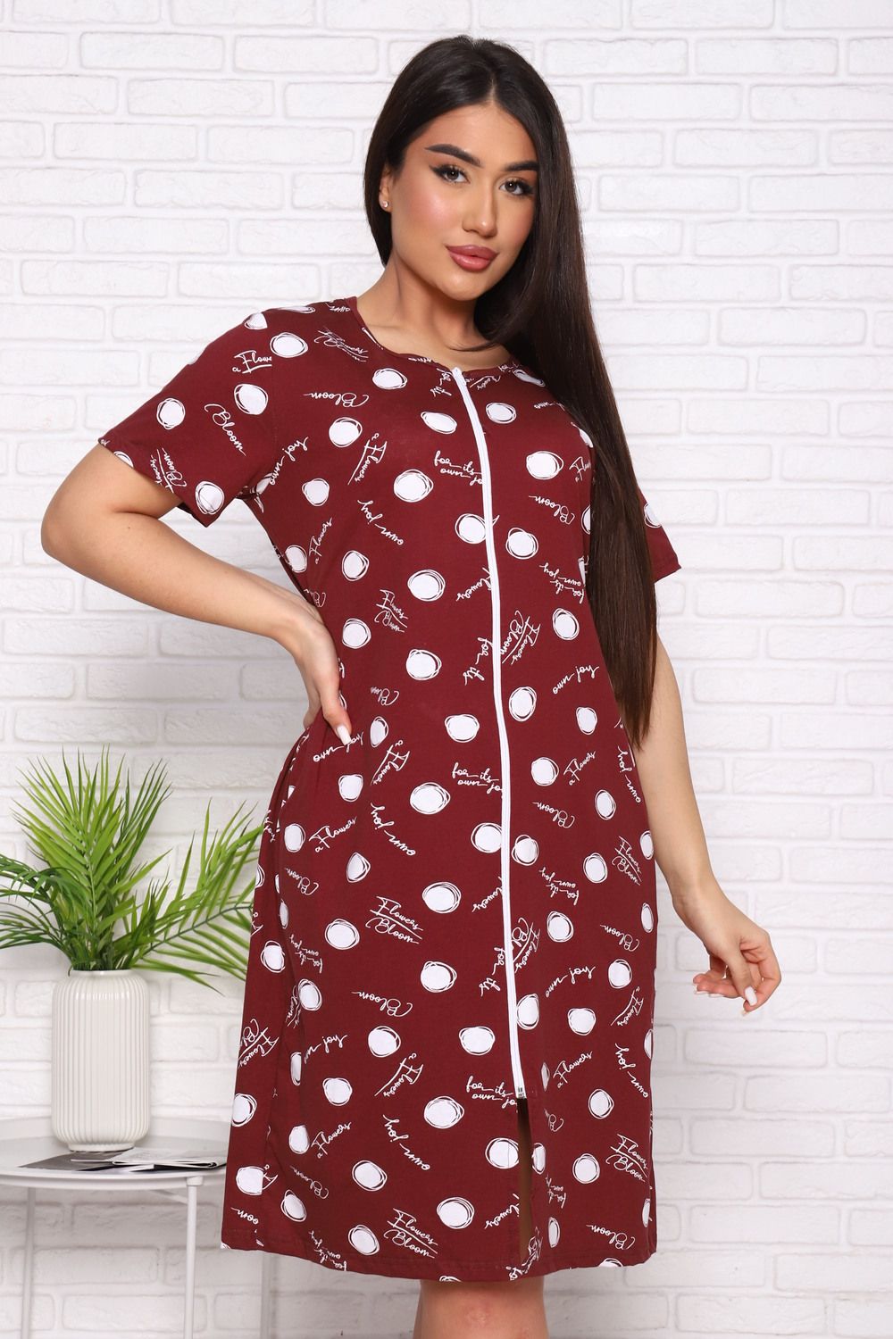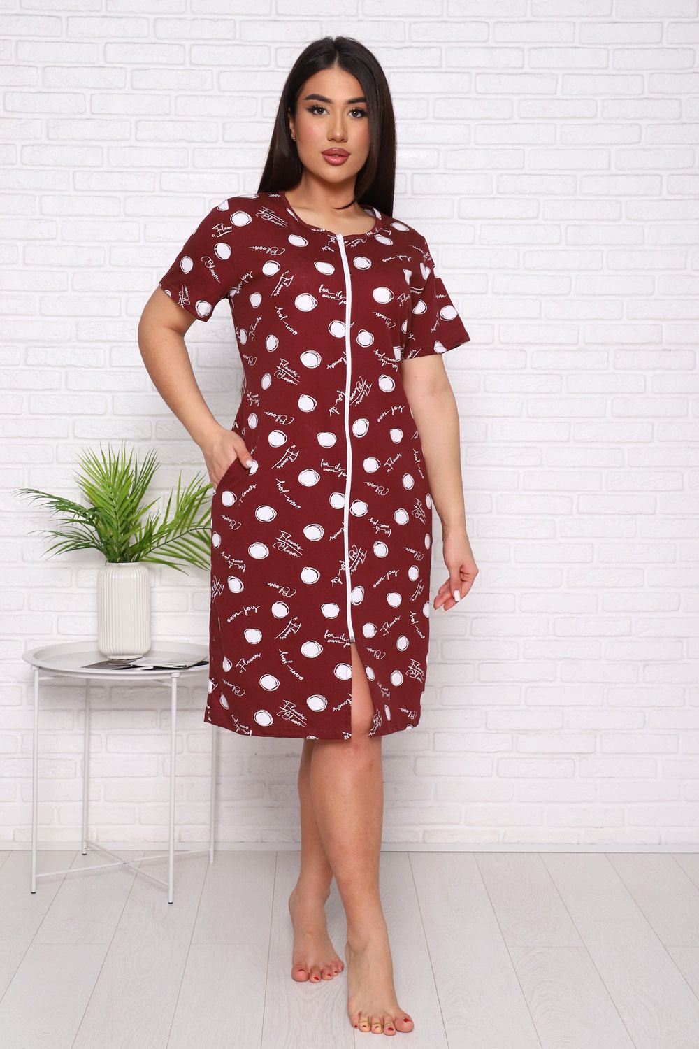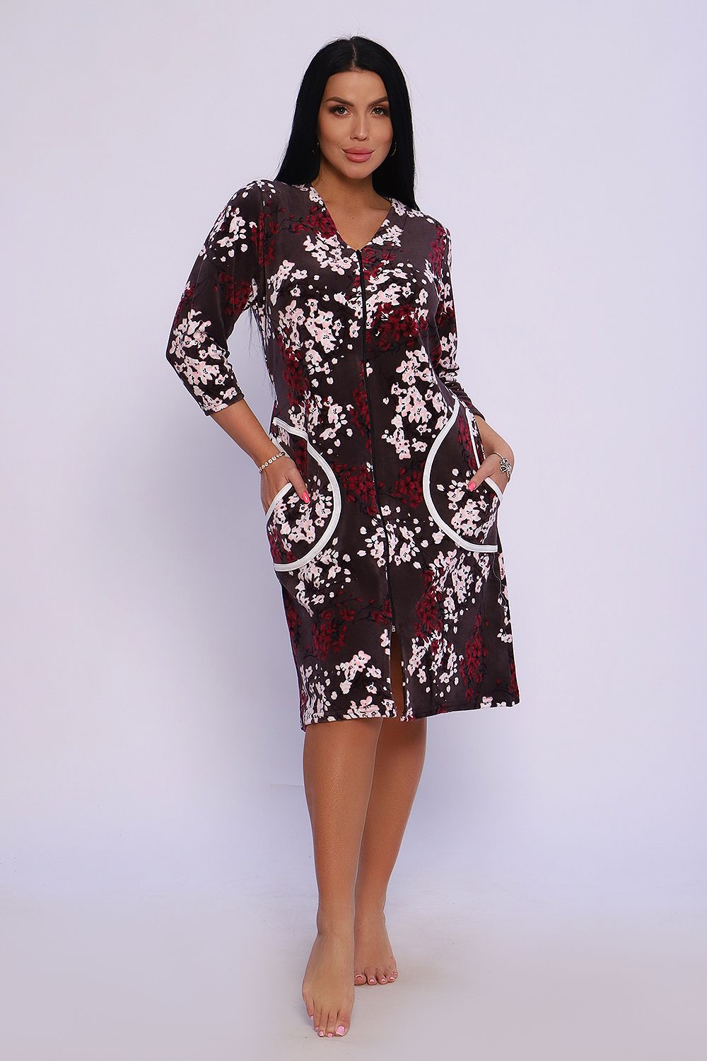 Халат женский, выполнен из трикотажного полотна кулирка. Халат на молнии, чуть ниже колен, по бокам карманы.