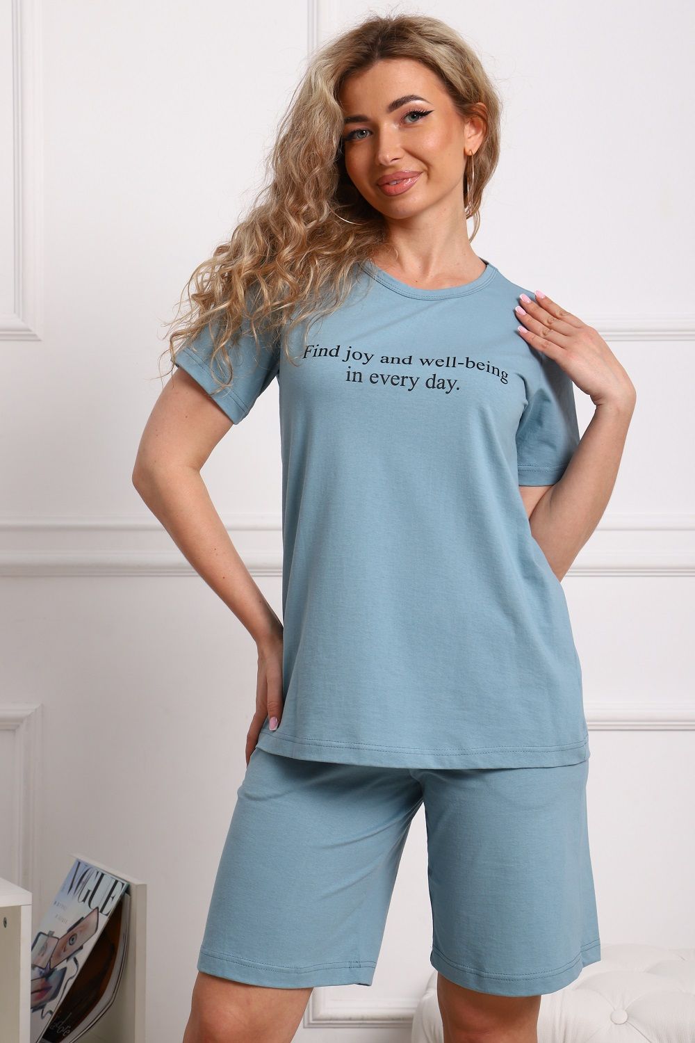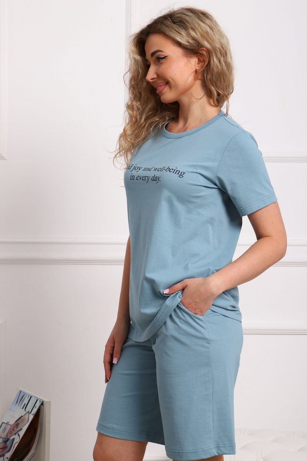 Костюм женский, лаконичный стиль: футболка прямого кроя, с короткими рукавами, с принтом в виде надписи на полочке и шорты на комфортном поясе, с удобными боковыми карманами.
