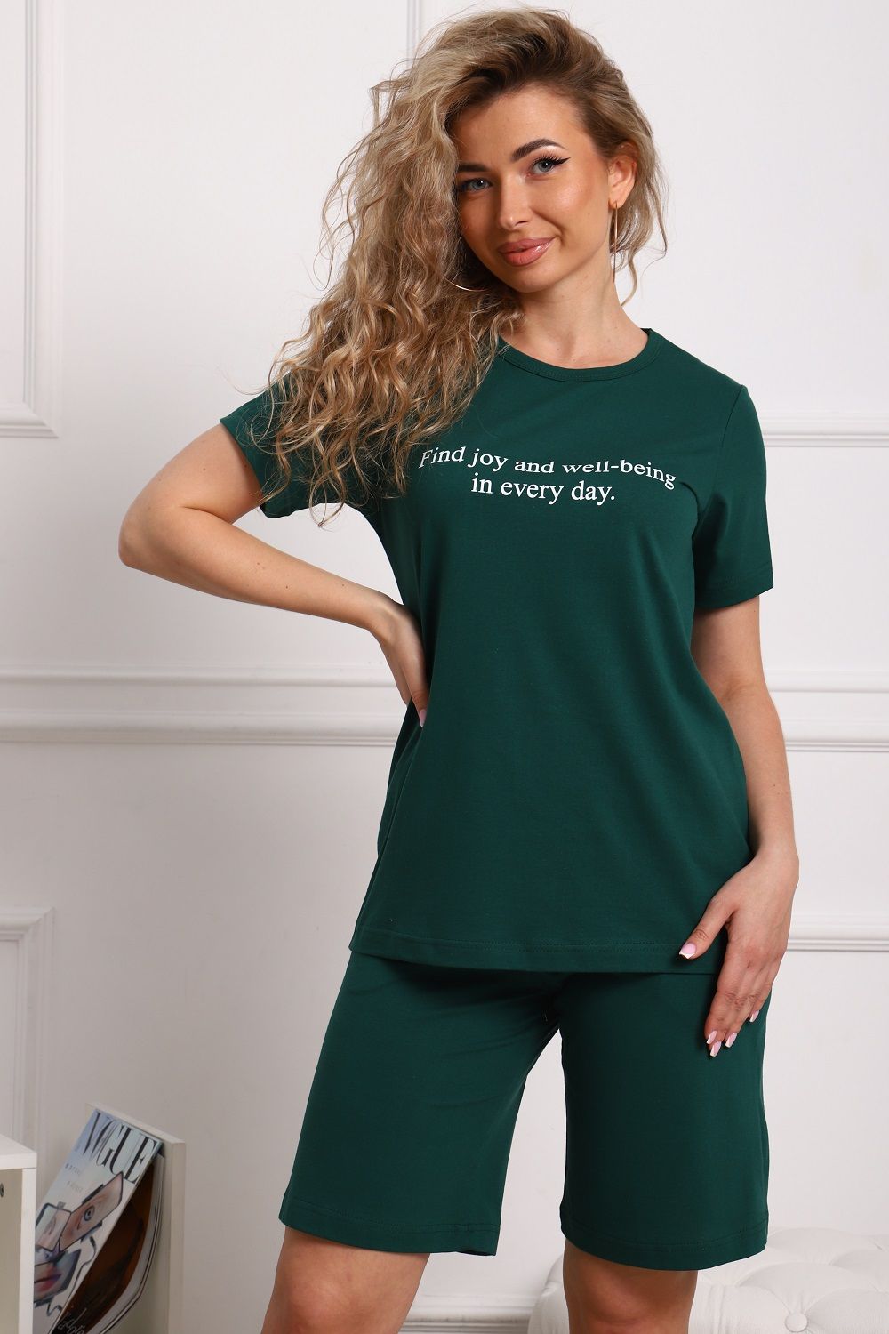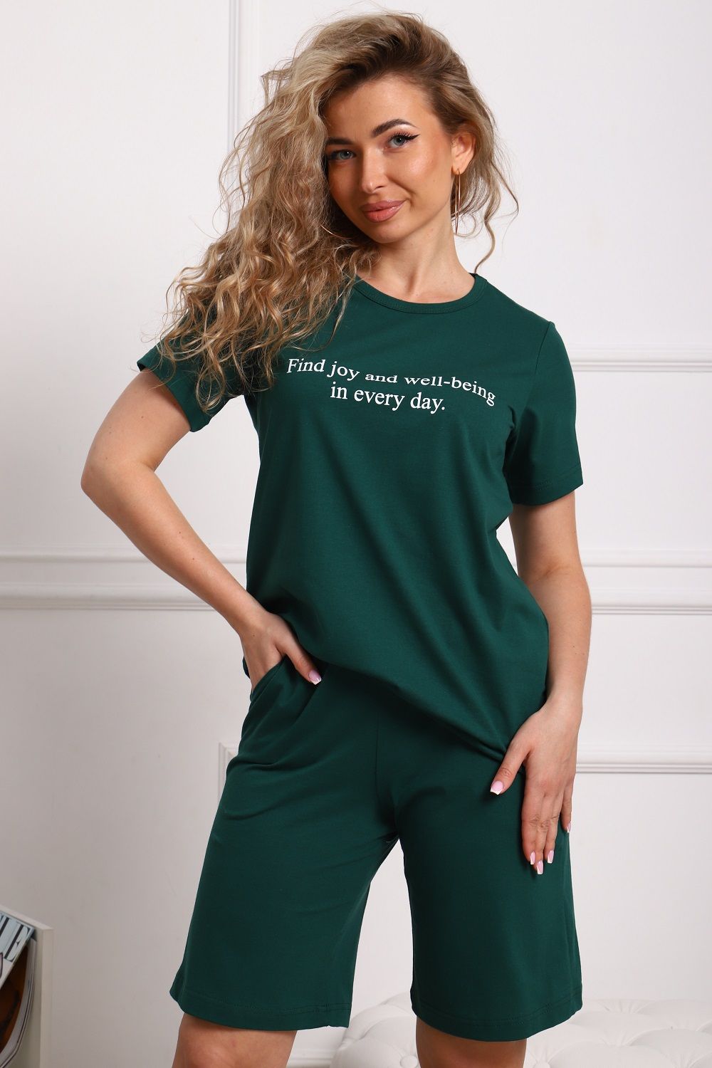 Костюм женский, лаконичный стиль: футболка прямого кроя, с короткими рукавами, с принтом в виде надписи на полочке и шорты на комфортном поясе, с удобными боковыми карманами.