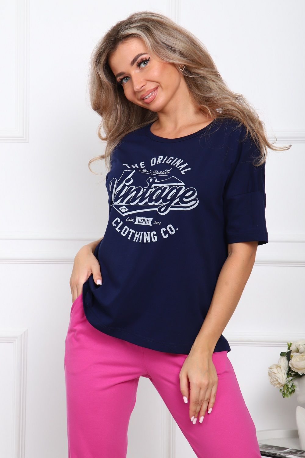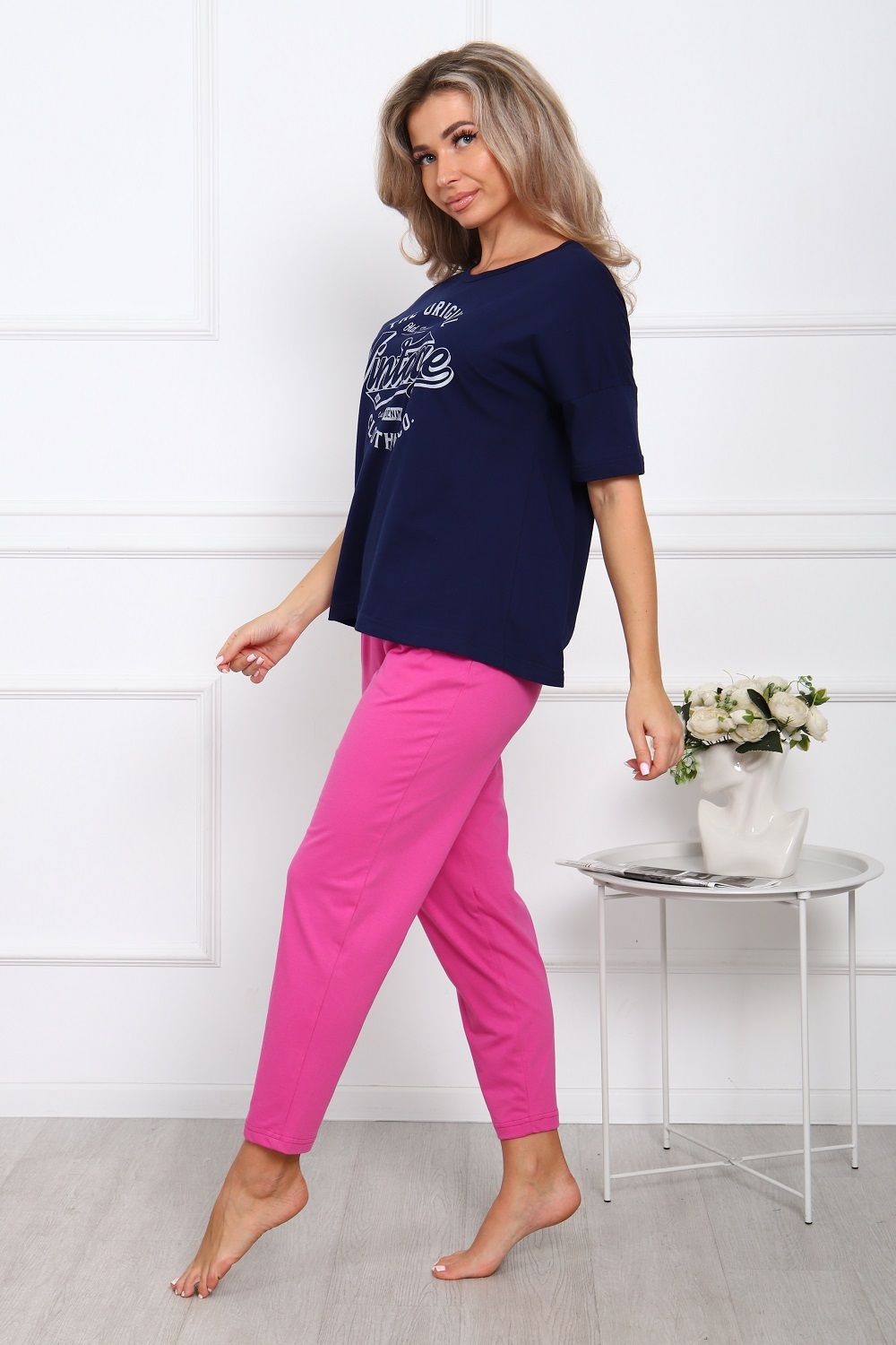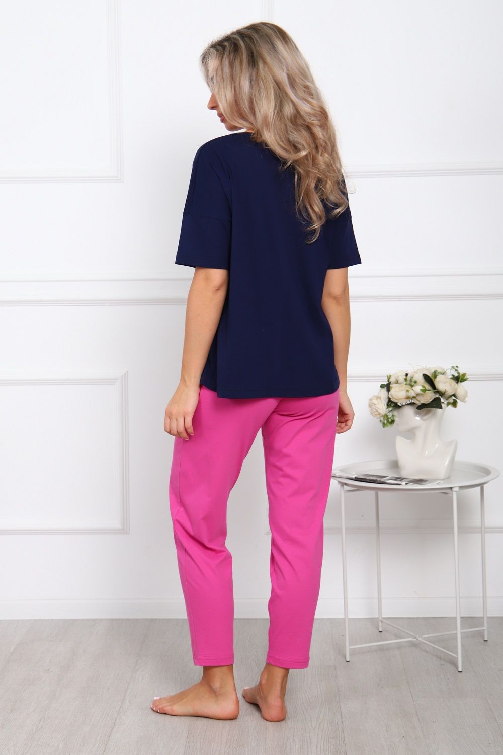 Пижама женская: футболка с короткими рукавами с принтом на полочке, брюки разных расцветок с боковыми карманами.