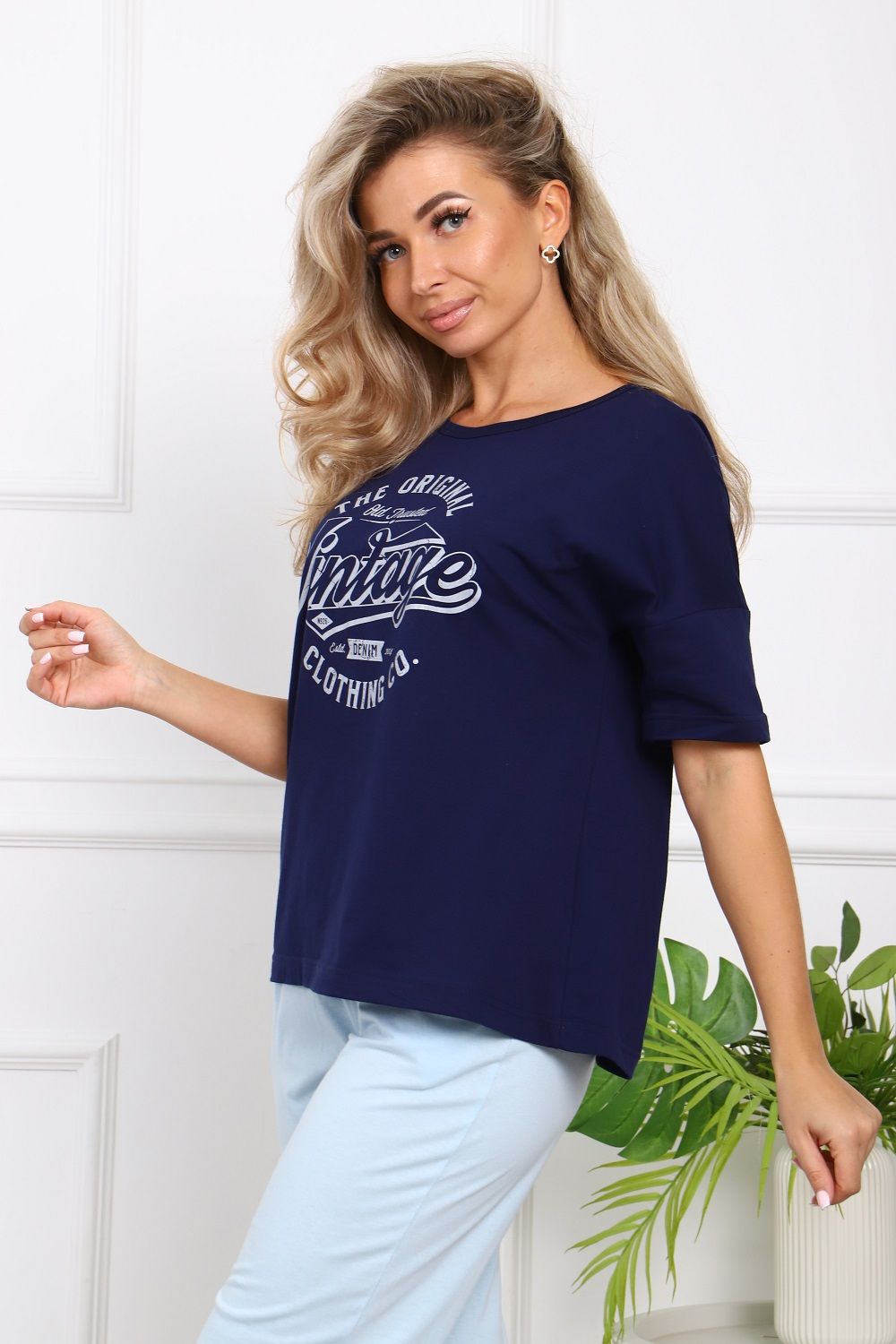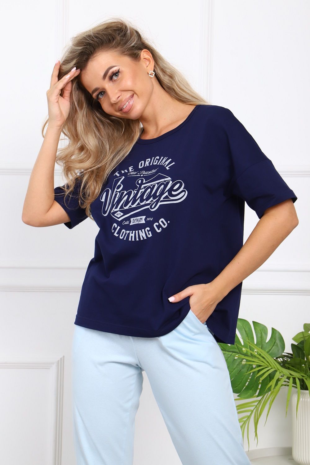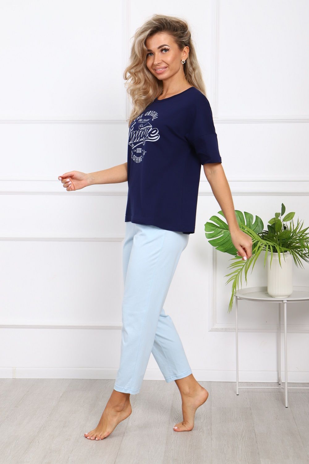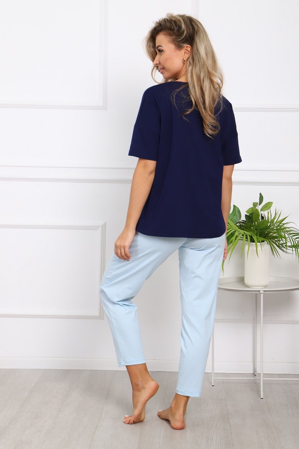 Пижама женская: футболка с короткими рукавами с принтом на полочке, брюки разных расцветок с боковыми карманами.