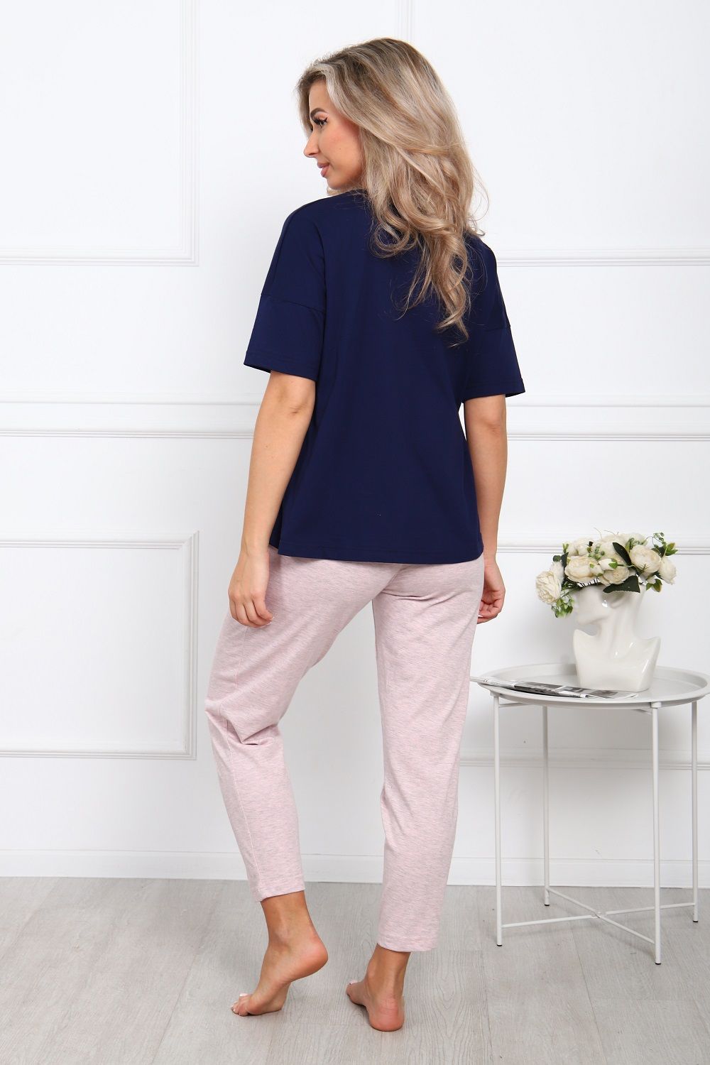 Пижама женская: футболка с короткими рукавами с принтом на полочке, брюки разных расцветок с боковыми карманами.