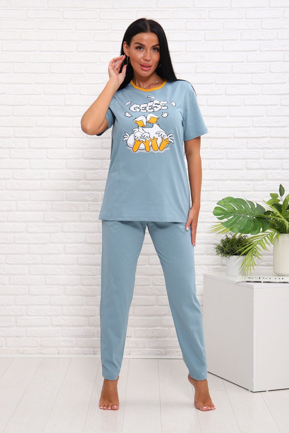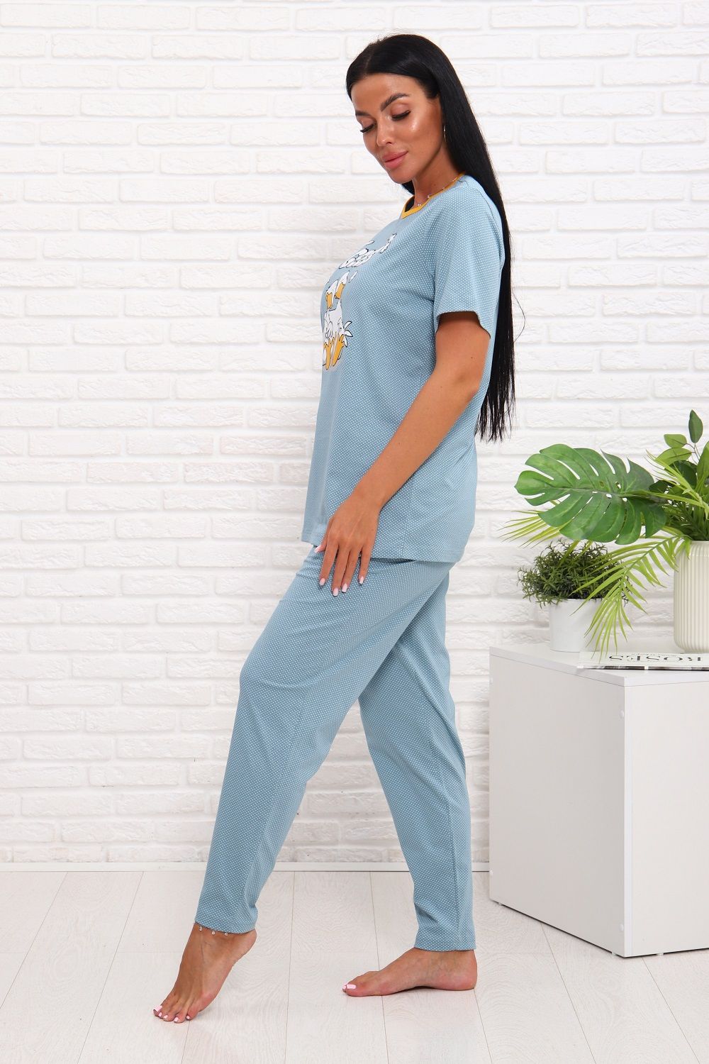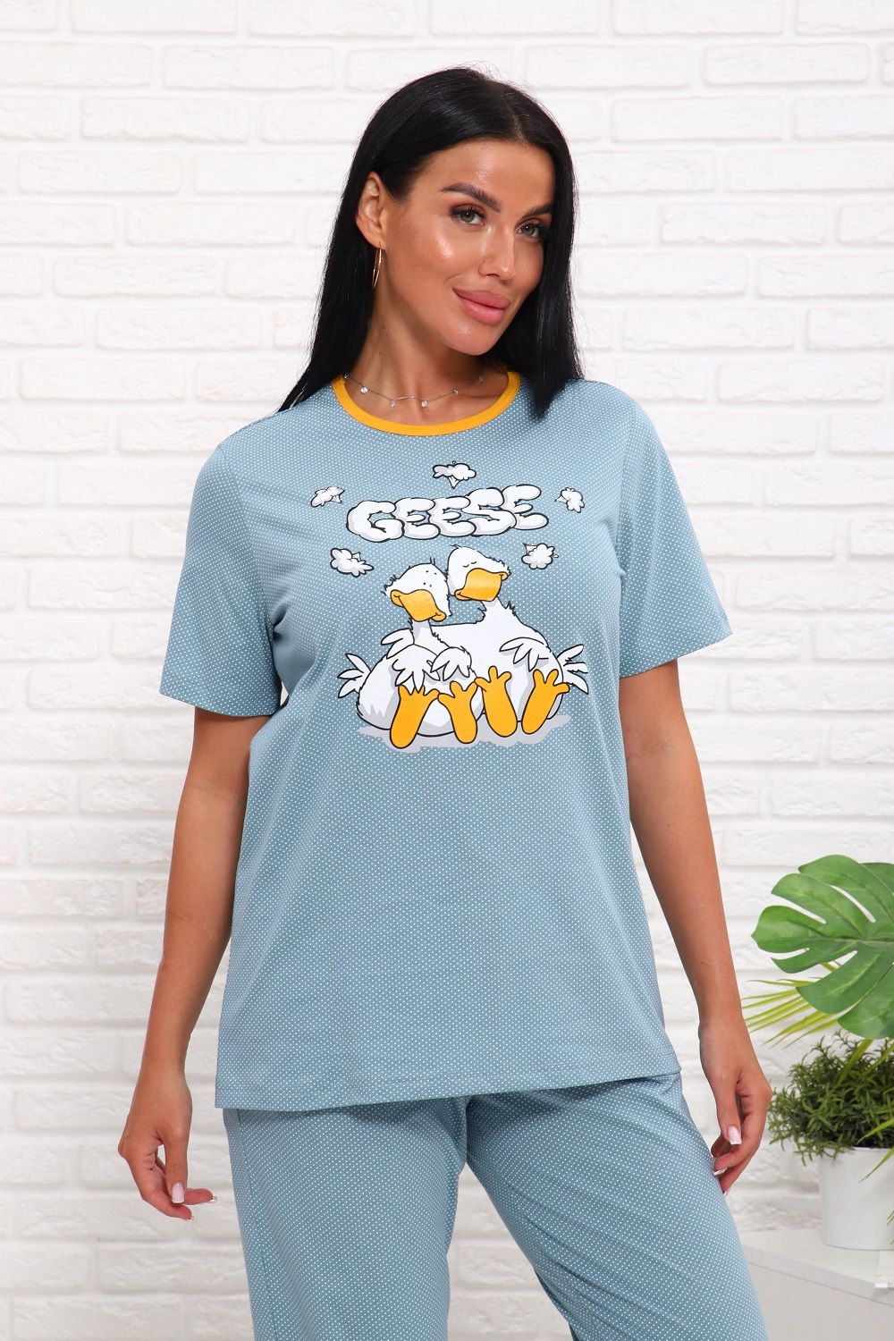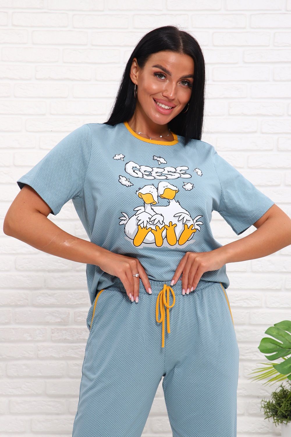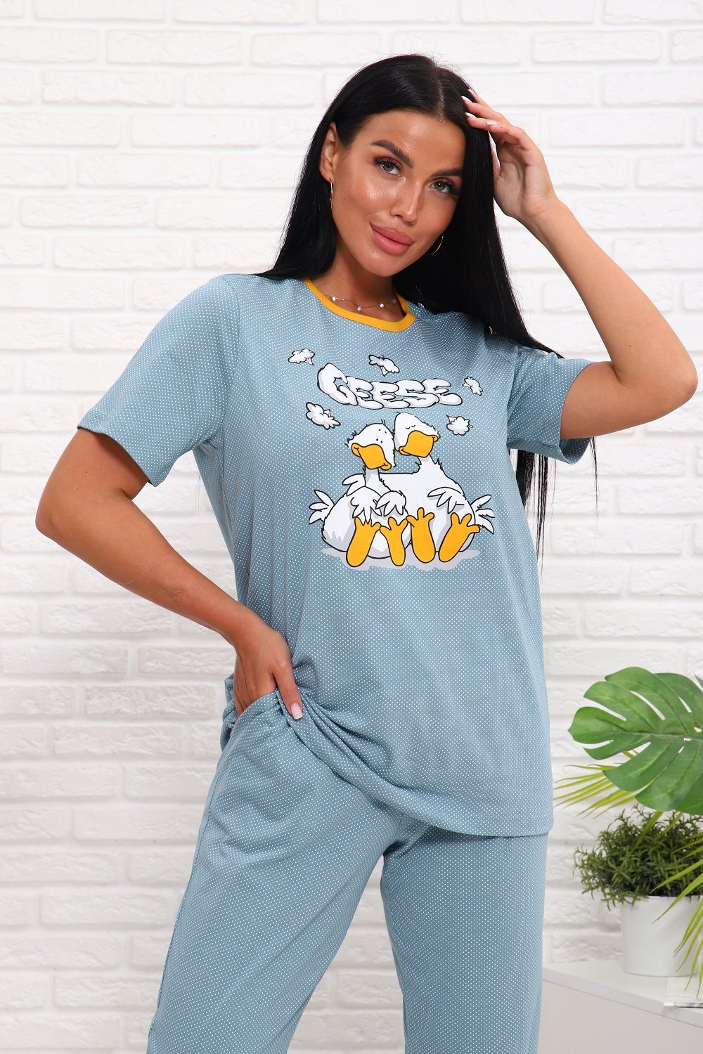 Пижама женская: футболка прямого кроя, с короткими рукавами, с милейшим принтом на полочке, брюки с боковыми карманами (крой "Бананы"), укороченные, на эластичном поясе декоративный шнурок.