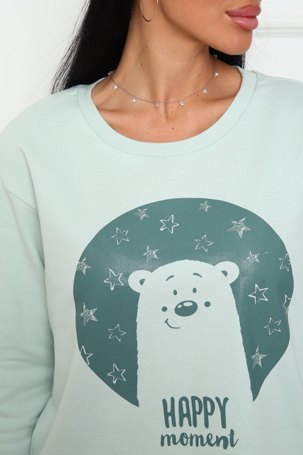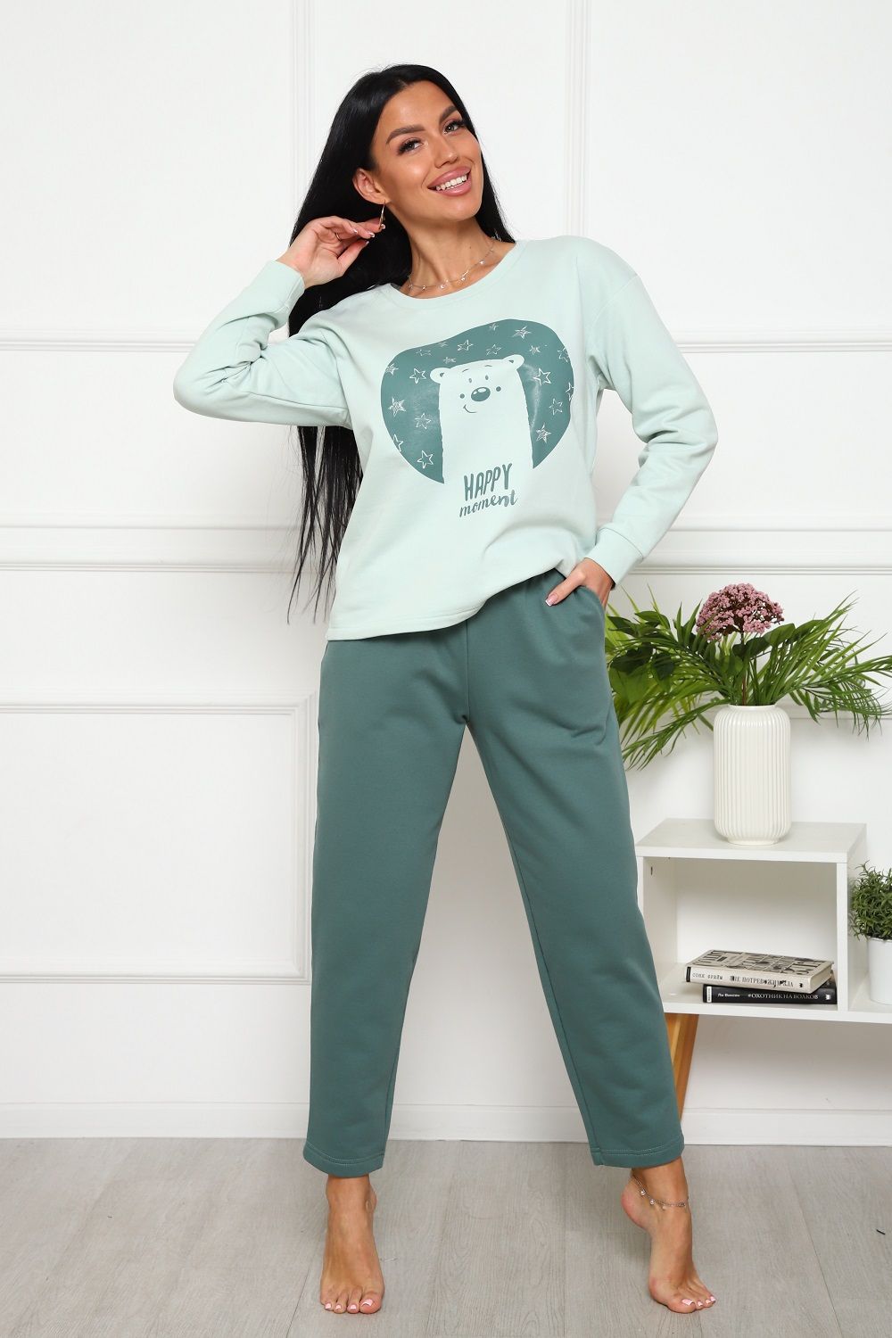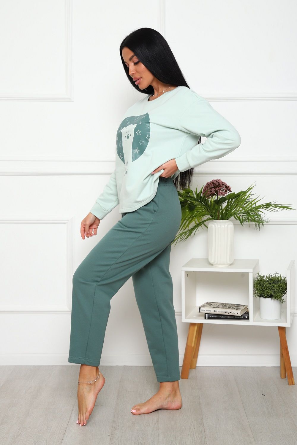 Пижама женская теплая: футболка прямого кроя со спущенным плечом и милым принтом на груди, бриджи "бананы" с карманами в боках. Комфортный хлопковый трикотаж - футер 2-нитка с начесом на изнаночной стороне.