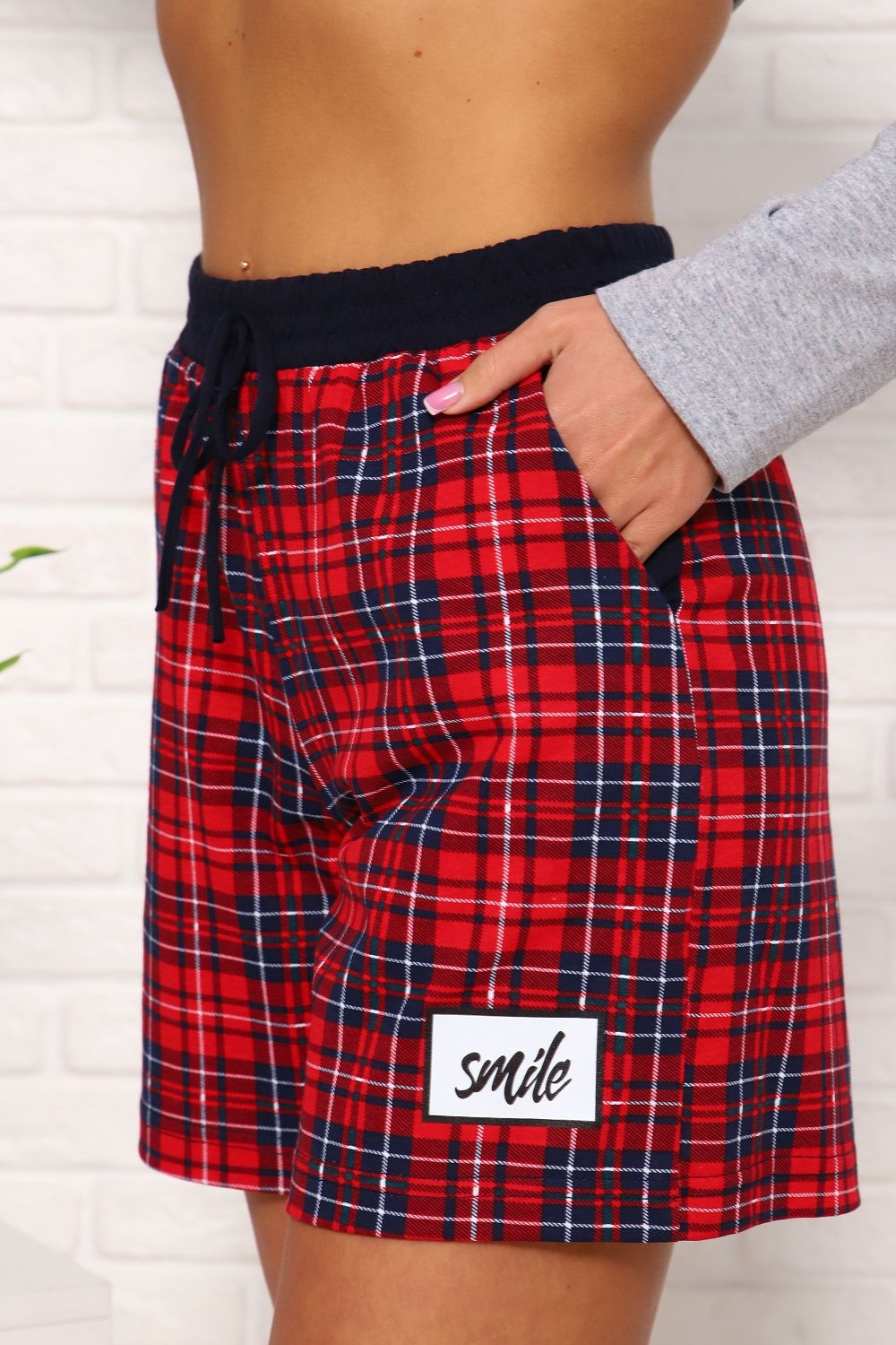 Шорты женские в клетку, с принтом на левой стороне шорт, с карманами в боках, пояс на поясной машине с декоративным шнурком. Комфорт 100%-ого хлопкового трикотажа и красивый контрастный принт создадут отличное настроение. Данные шорты замечательно сочетаются с лонгсливом (артикул 1035), составляя удачный комплект.