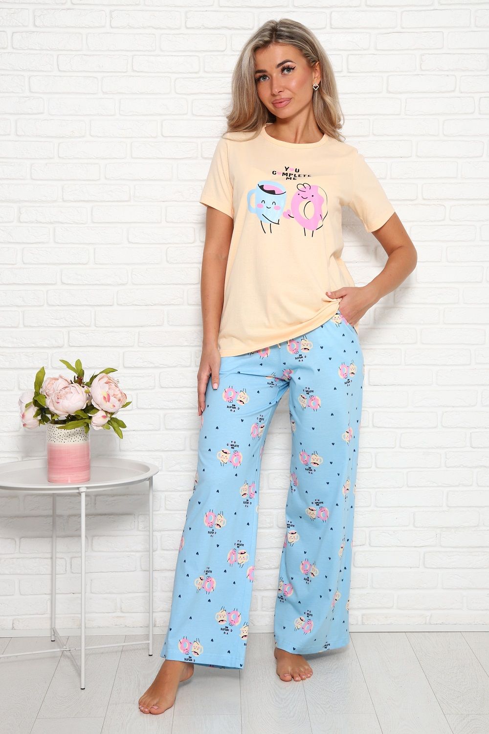 Пижама женская: футболка с короткими рукавами и очаровательной печатью на полочке, брюки-палацио на эластичном поясе, с боковыми карманами. Роскошный силуэт и комфорт хлопкового трикотажа.