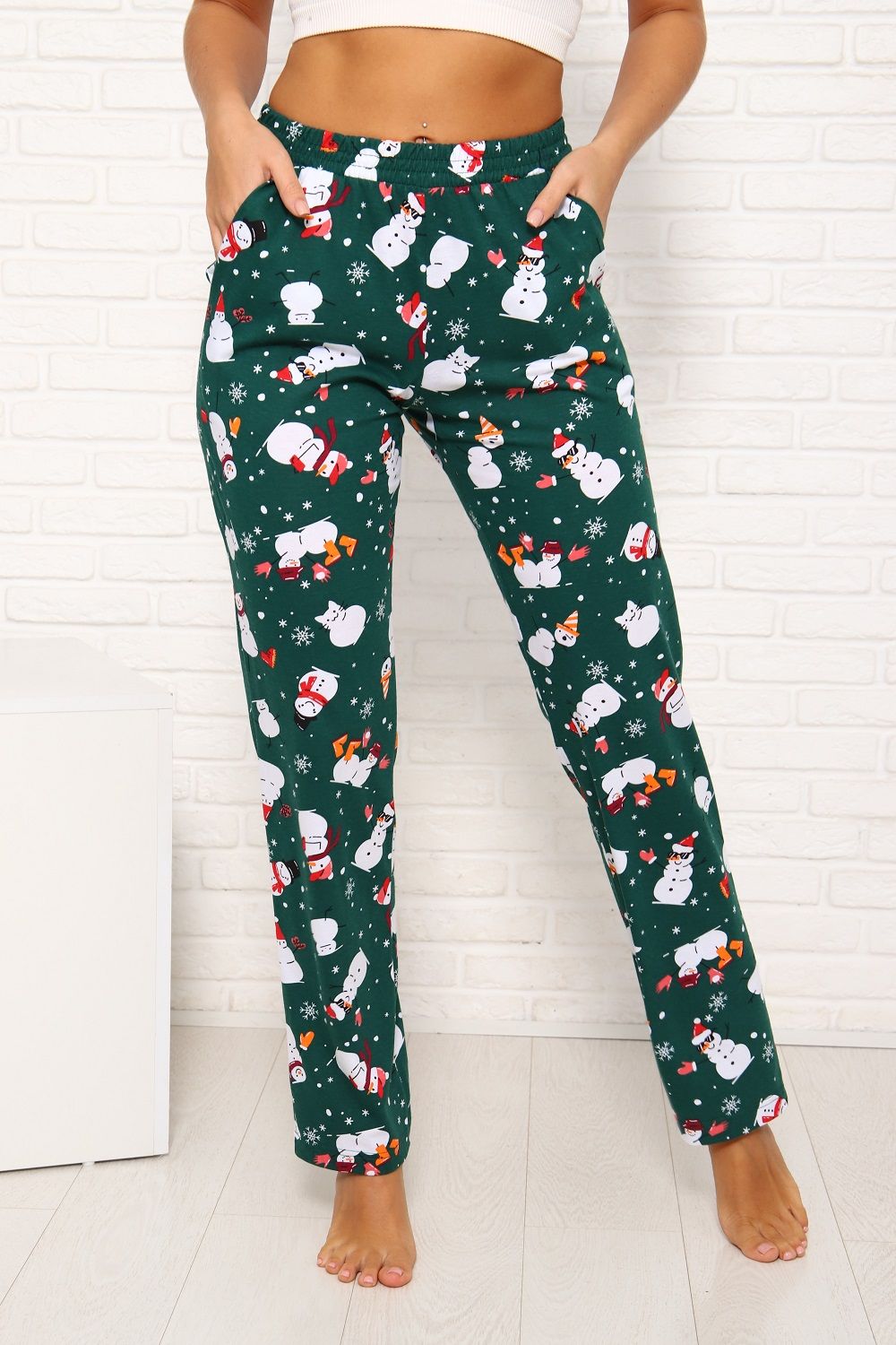Брюки женские "Новогодние" прямого кроя, с боковыми карманами, комфортный широкий эластичный пояс. Комфорт 100% хлопка и отличное новогоднее настроение Вам обеспечены. Данная модель отлично комплектуется с лонгсливом (артикул 1035).