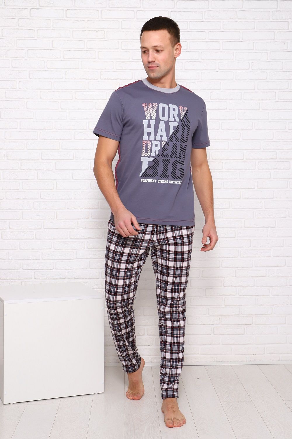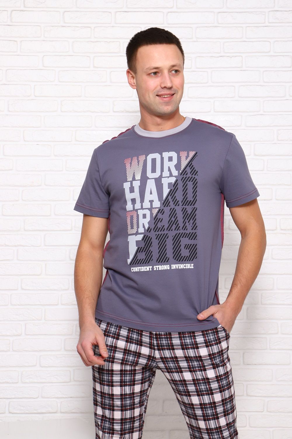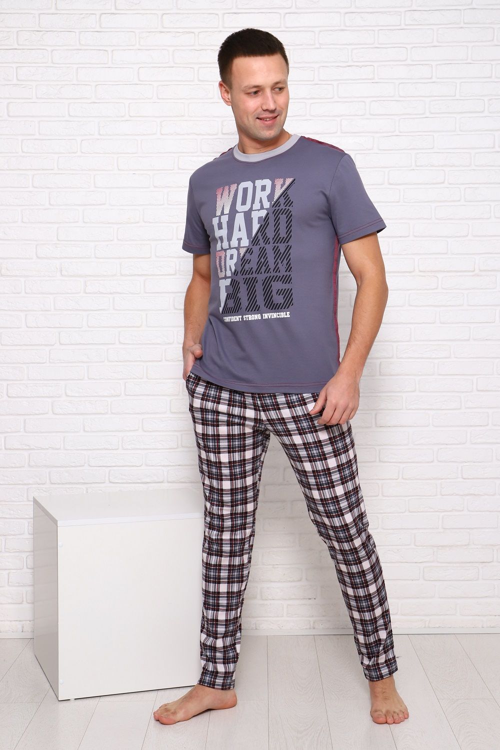 Стильная мужская пижама, 100% хлопок: брюки на поясе, с боковыми карманами; футболка с декоративными швами "наружу" с контрастной ниткой, с брутальным принтом на груди.