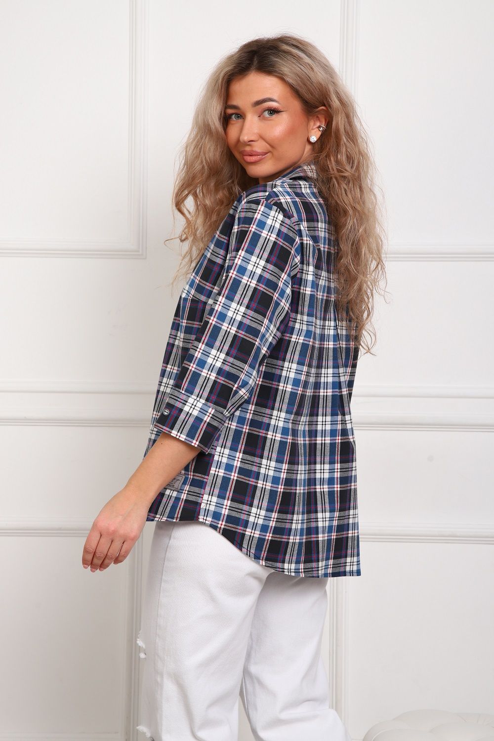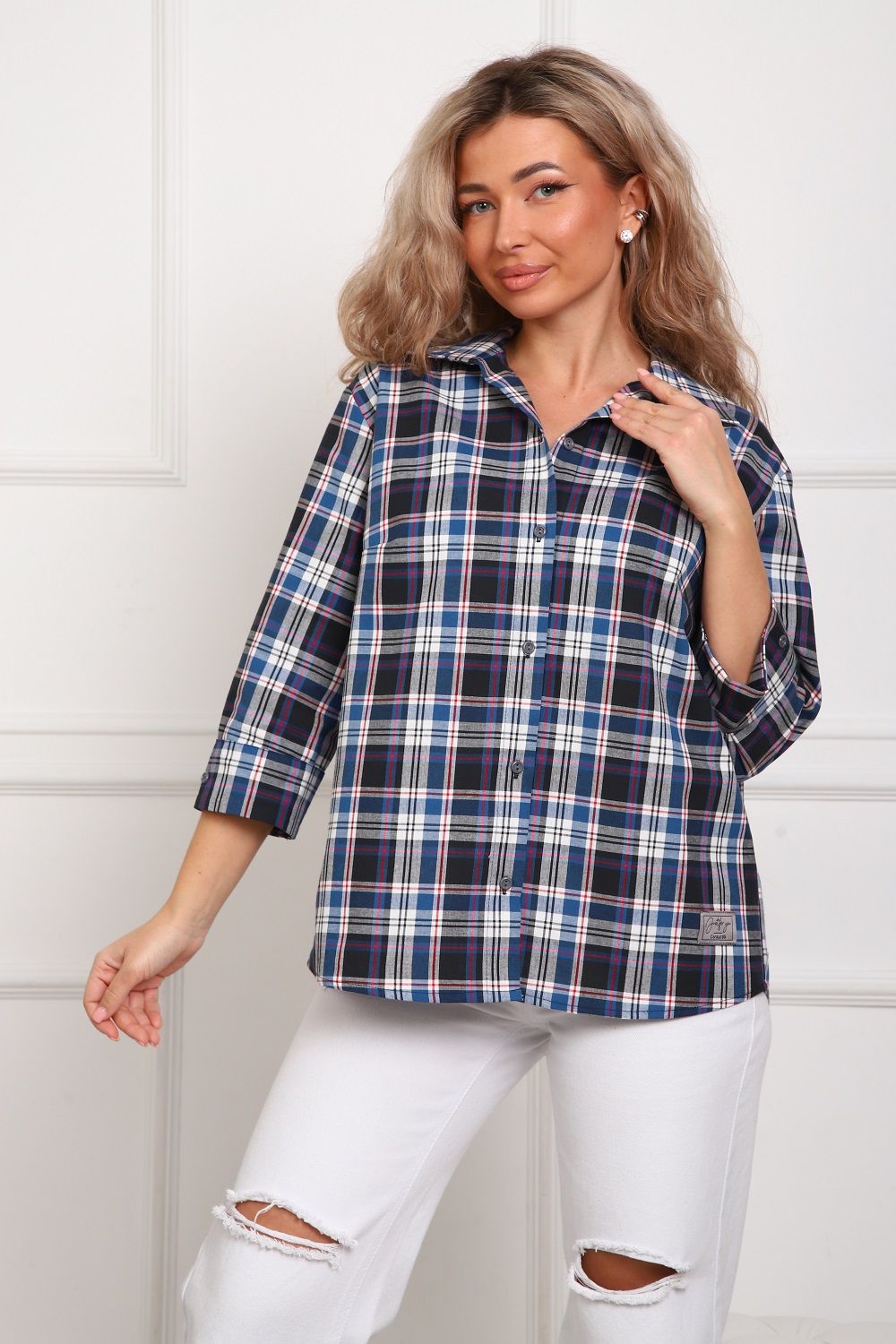 Рубашка женская свободного кроя в эко стиле (100% хлопок). Комфортный рукав 3/4 с широким манжетом. Центральная встречная складка на спинке. Воротник со свободной посадкой, без фиксации на пуговицу. Хлопок - 100%, ткань - шотландка (по фактуре похожа на полулён, даёт незначительную усадку, утюжится легко). Стиль, комфорт, отлично сочетается с денимом и классикой. Оптимальный выбор для лета и на все сезоны.