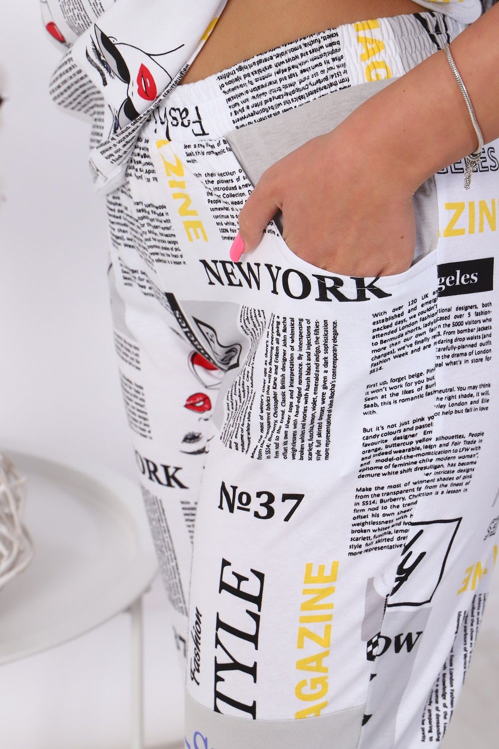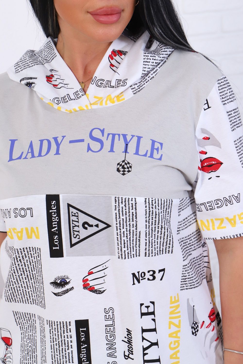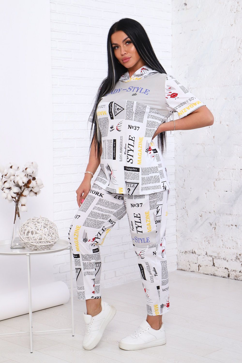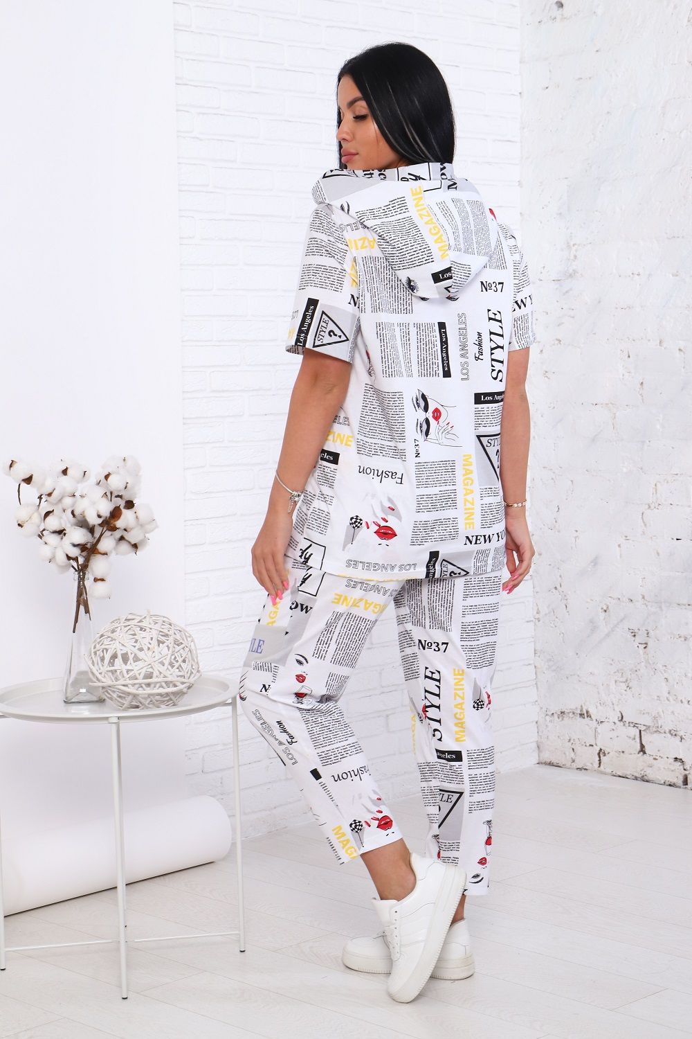 Костюм женский: футболка свободного силуэта с капюшоном, с короткими рукавами и с принтом на полочке, брюки с боковыми карманами и с небольшим принтом на левой штанине спереди. Комфорт 100% хлопка, удобная посадка.