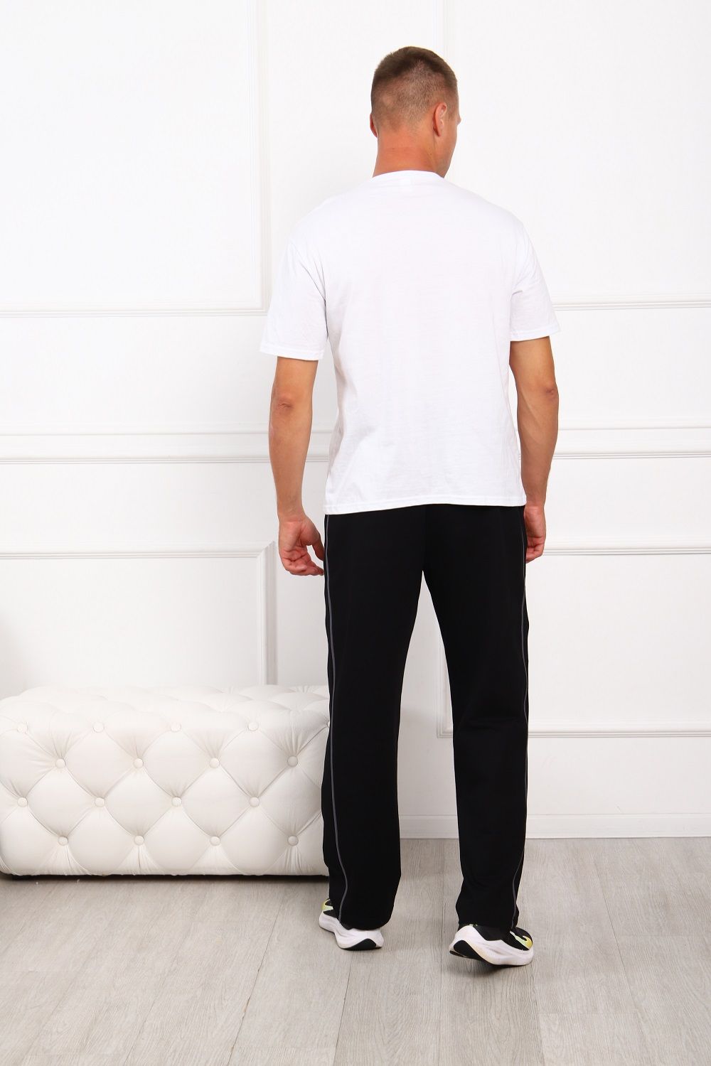 Брюки мужские с лампасами, с боковыми карманами и с нашивкой по низу левой брючины. Удобный эластичный пояс. Маломнущийся трикотаж, с высоким содержанием хлопка.