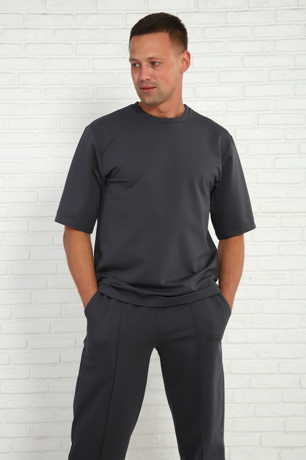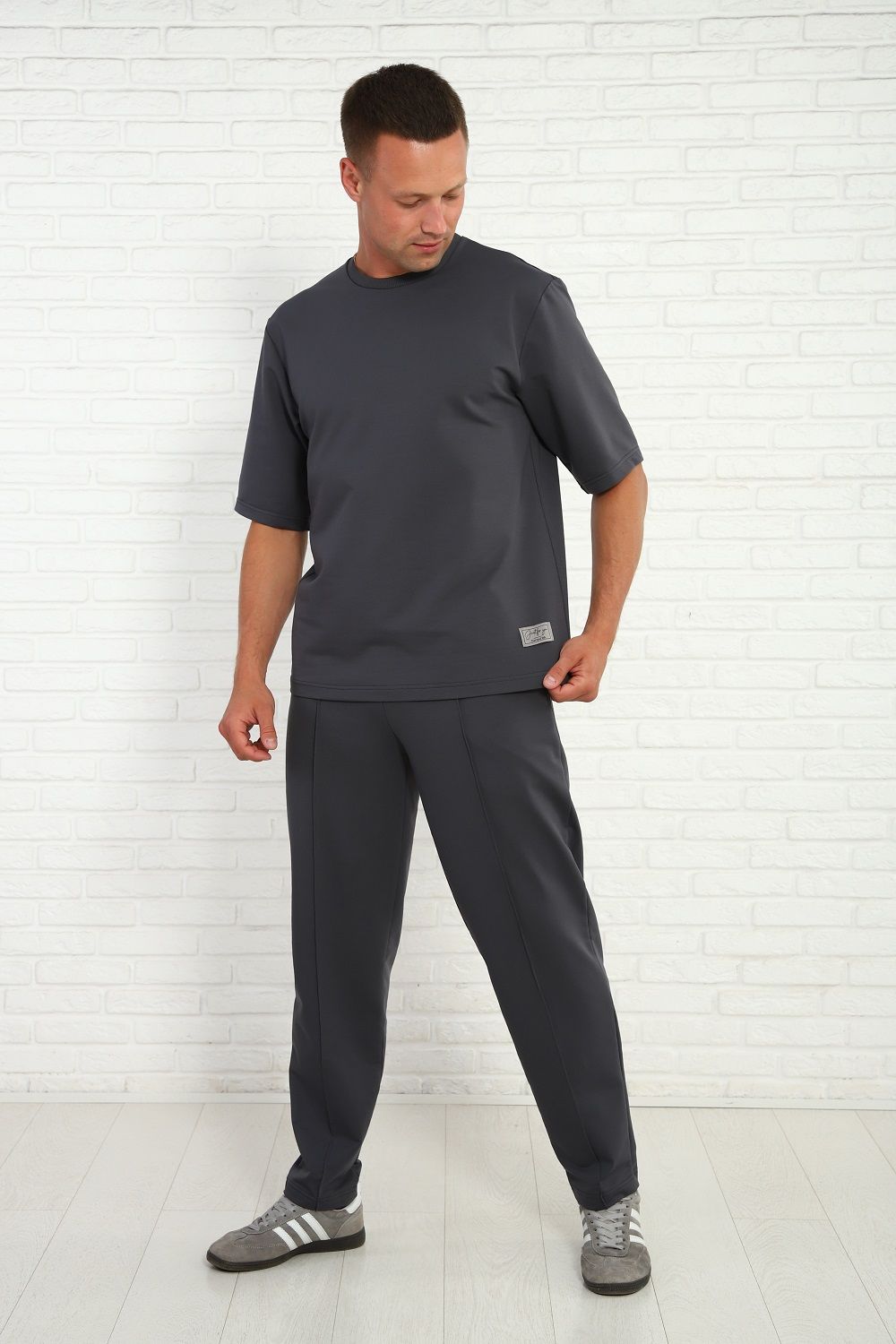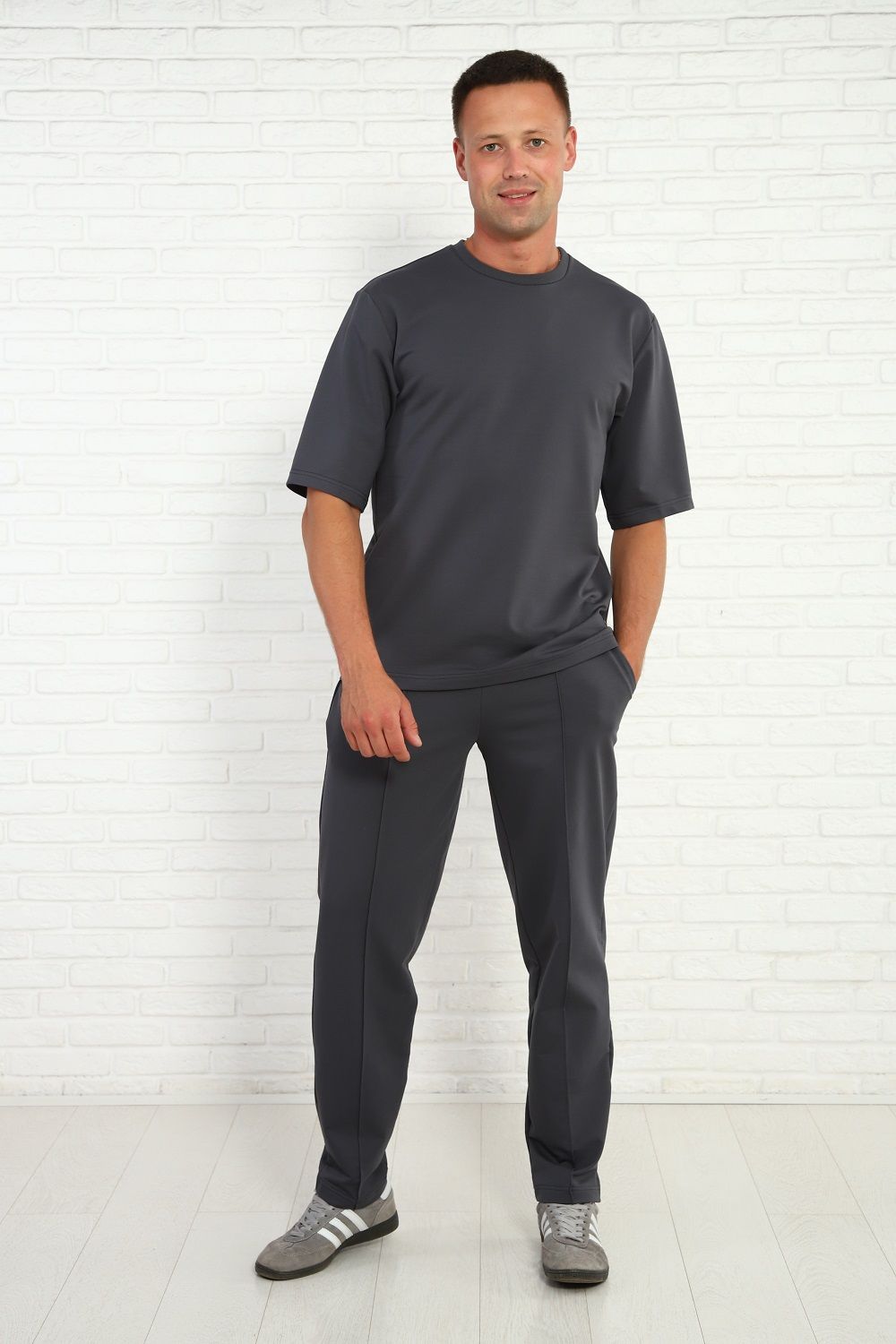 Мужской брючный костюм с футболкой, комфортный материал с хлопком, маломнущийся, удобный крой и отличная посадка на фигуре. Брюки на широком комфортном поясе, два боковых кармана.