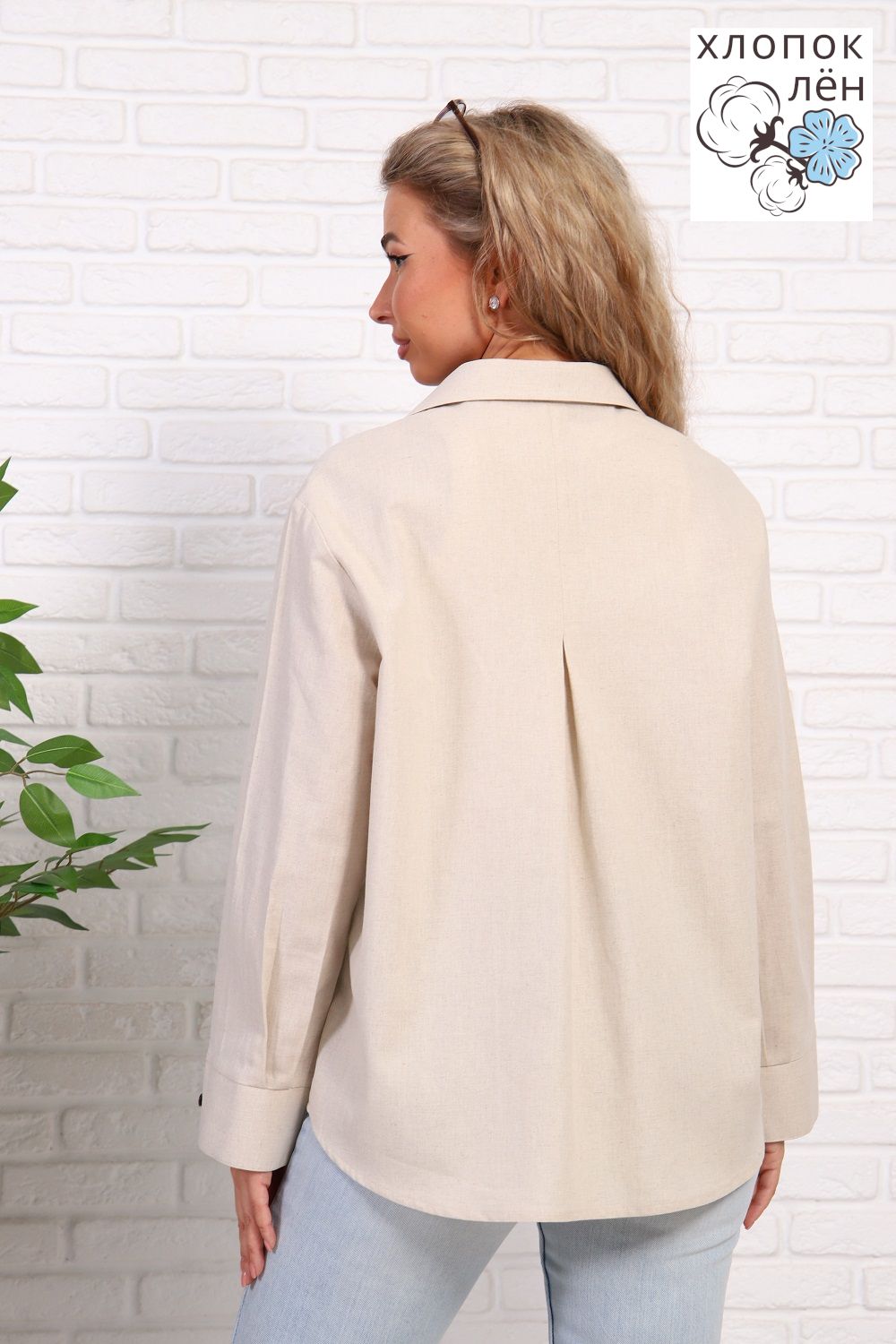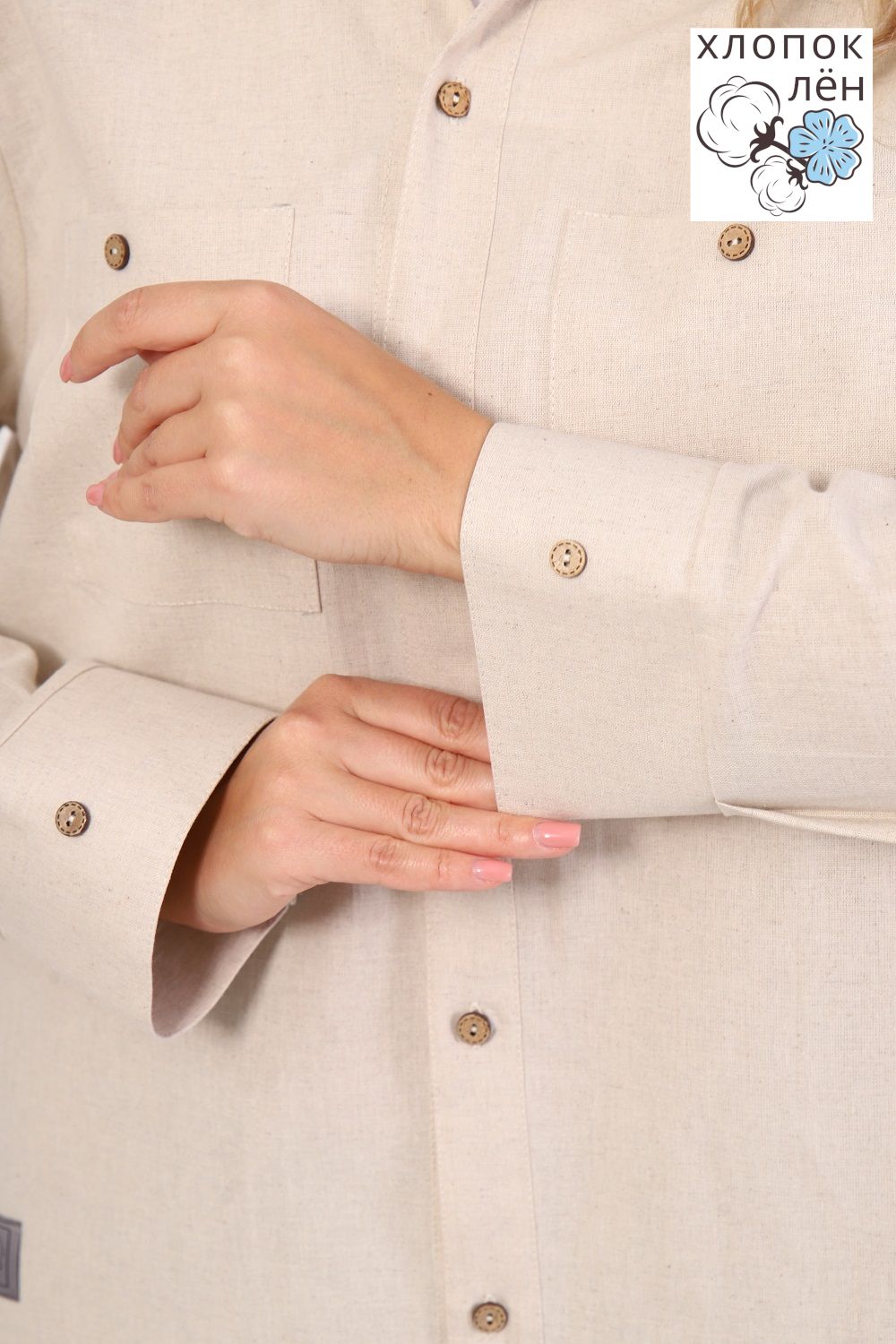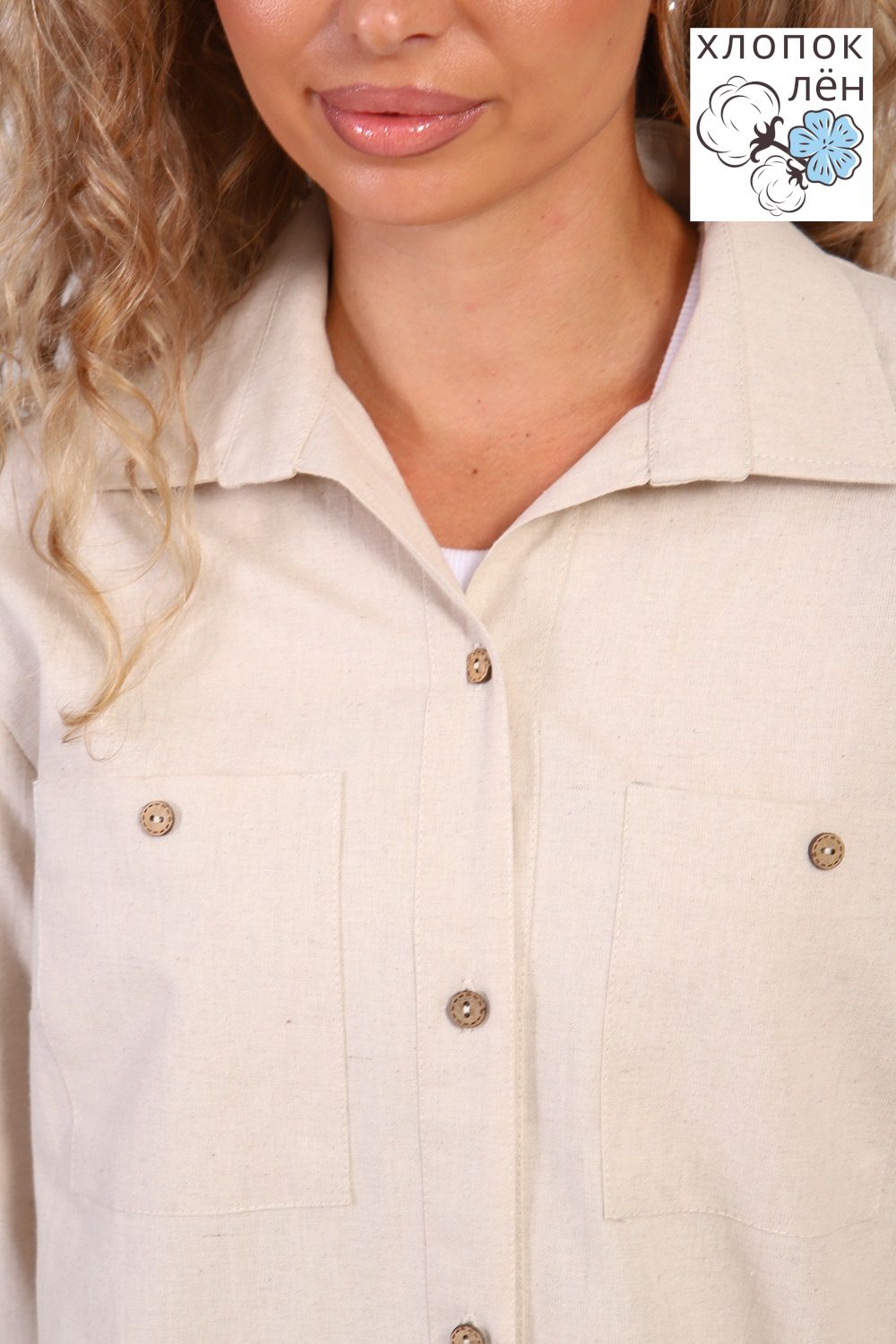 Рубашка женская офисная, свободного силуэта, длинный рукав. Из 100% натуральной ткани (хлопок 70% и лён 30%). Рубашка очень комфортная: рукава не сковывают движения; удобная длина, прикрывающая зону бедер; два нагрудных кармана, дышащая ткань. Трендовый силуэт и акцентные кокосовые пуговицы создают стиль этой рубашки. Сочетается и с денимом и с классической одеждой.