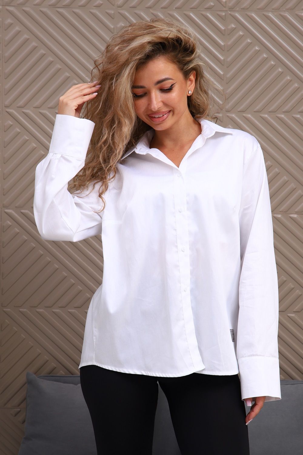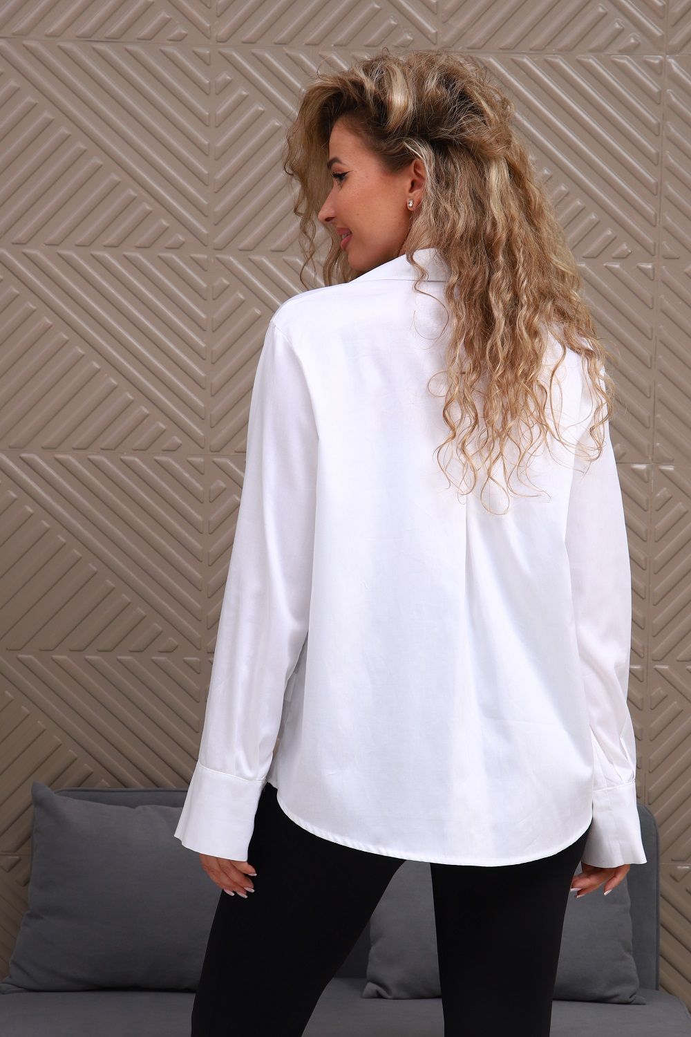 Эффектная белая женская рубашка с длинным рукавом. Для офиса, учёбы, отдыха. Отличается свободным силуэтом и рукавами в пижамном стиле с ультрамодным широким манжетом (при желании манжет можно подгибать на лицевую часть рукава, регулируя таким образом длину рукава). Воротник со стойкой, стойка застёгивается на пуговицу, две нагрудные вытачки для комфортной посадки рубашки, на спине две встречные складки по центру, низ фигурный. Премиальный сатин с благородным сдержанным блеском, 100% хлопок.
