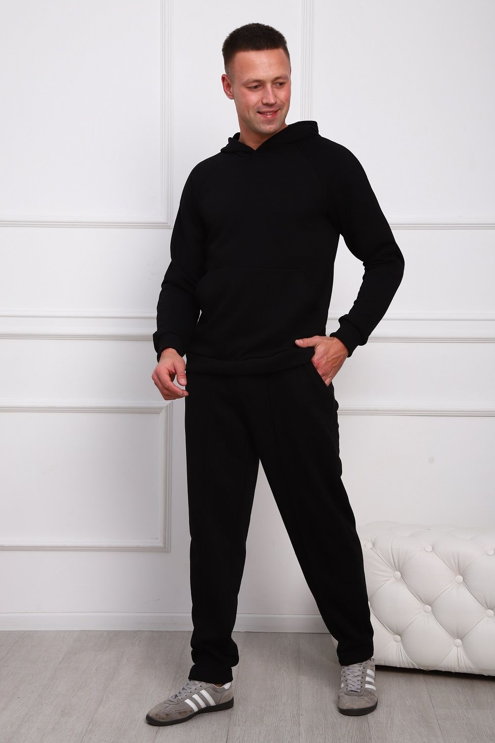 Костюм мужской: толстовка с брюками. Толстовка с карманом-кенгуру и с капюшоном. Рукава - реглан, на манжетах. Брюки на эластичном поясе, с боковыми карманами, с манжетами по низу брючин. Материал - плотный премиальный трикотаж с высоким содержанием хлопка (60%).