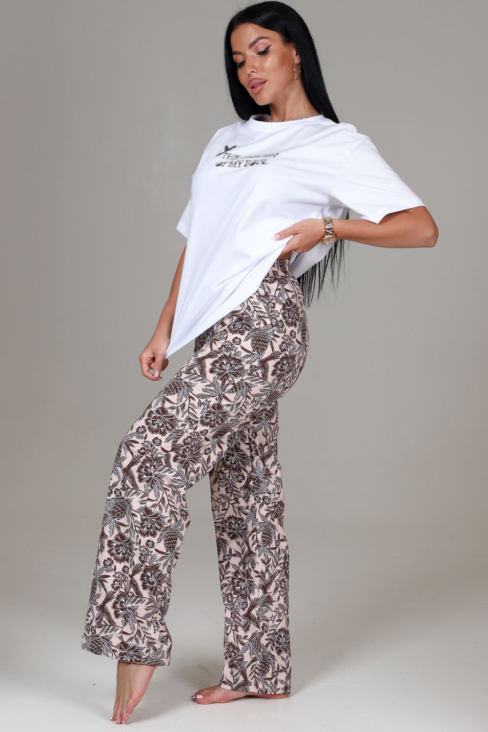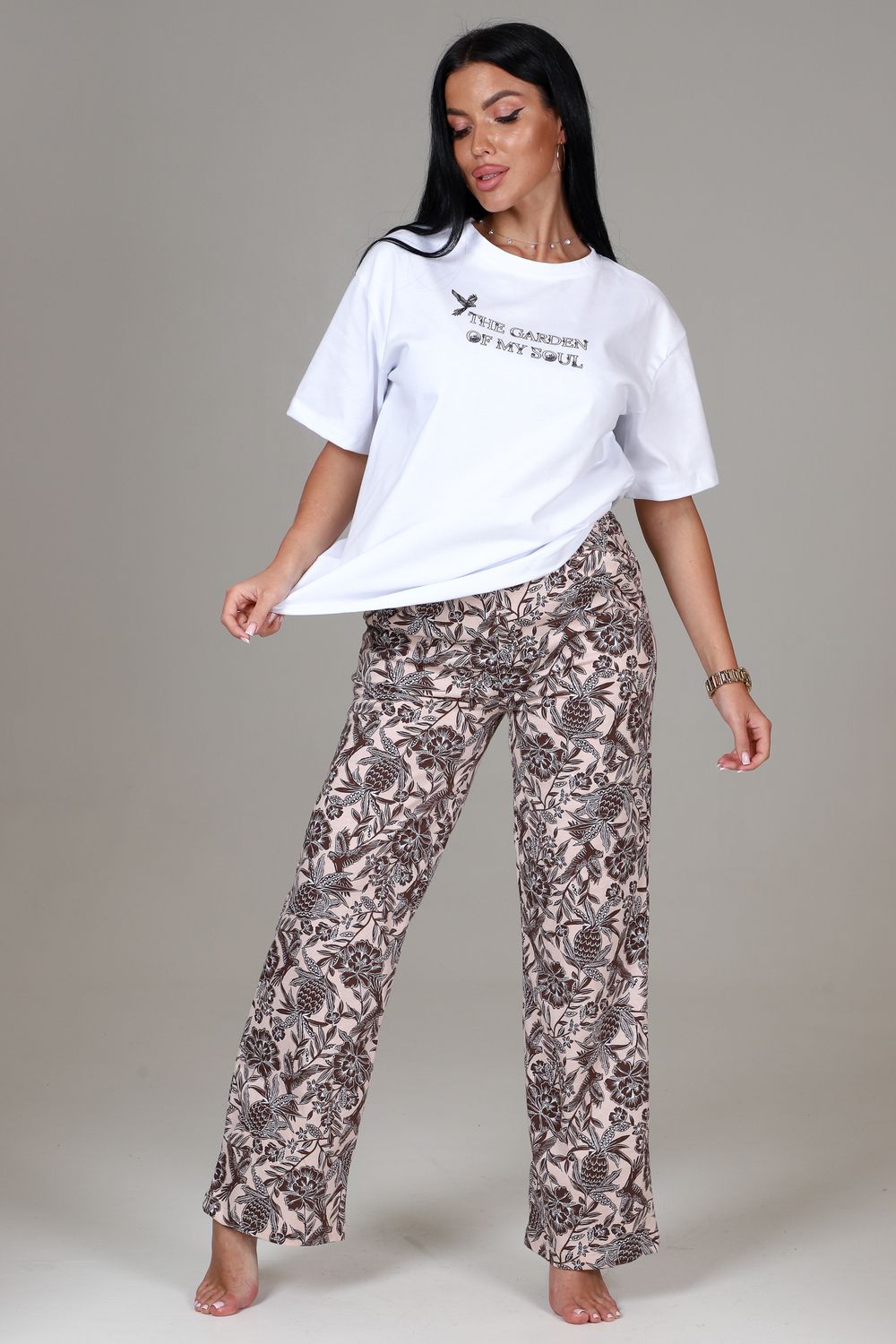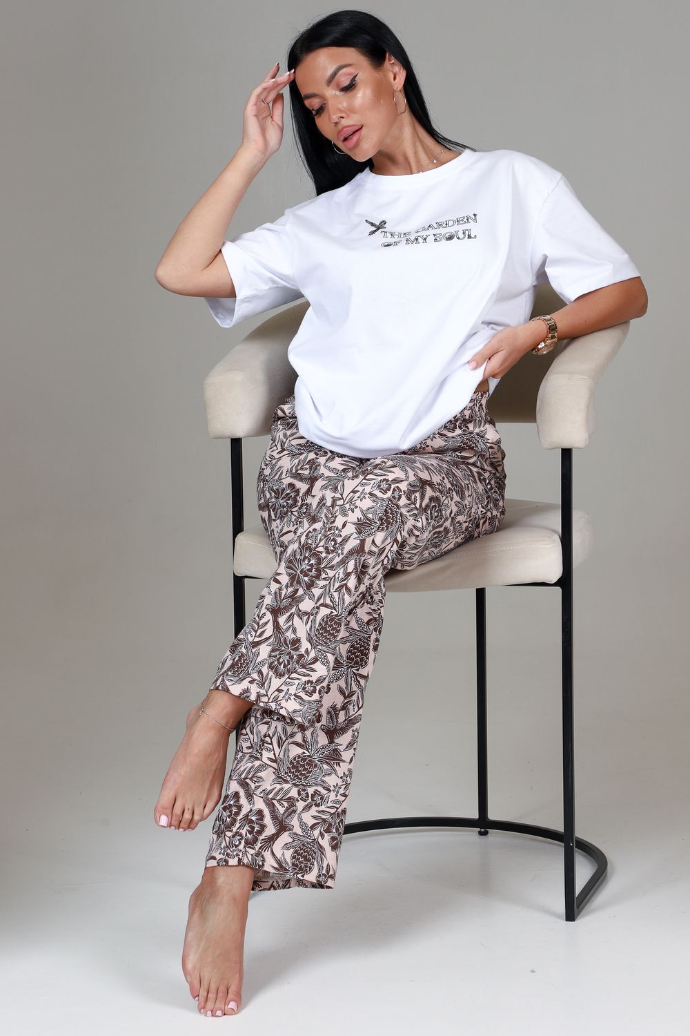 Представляем вам уютный и стильный женский домашний костюм от бренда DANi.TEX BRAND. Этот костюм изготовлен из высококачественной кулирки, состоящей на 100% из натурального хлопка, что обеспечивает комфорт и приятные тактильные ощущения при ношении. В комплект входят прямые брюки с удобными карманами и футболка. Брюки прямого кроя и комфортная посадка обеспечат свободу движений, а круглый вырез на футболке добавит женственности и элегантности вашему образу.