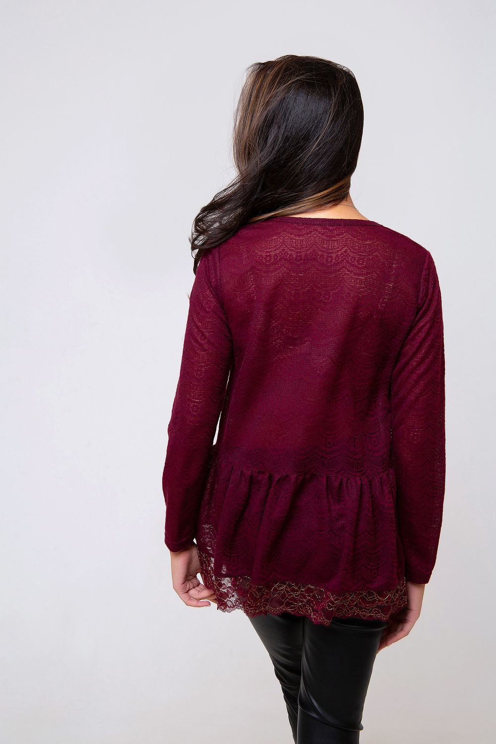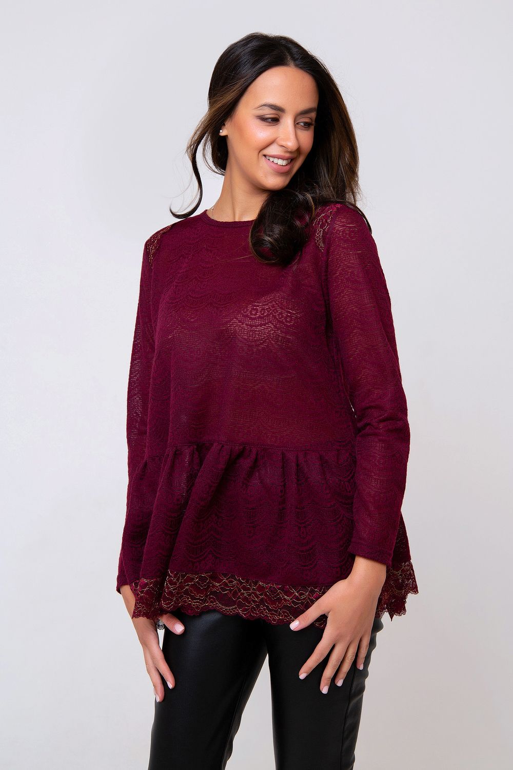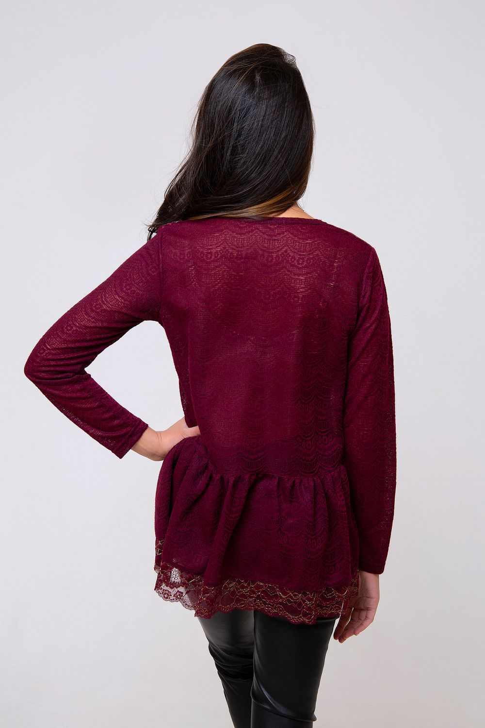 Трикотажная туника-блуза глубокого оттенка, выполнена из полупрозрачного материала. Модель однотонная, оформлена резинкой на талии, а также вставкой из гипюра по краю изделия. Рукав длинный. Горловина округлая. Состав: 75% полиэстер, 20% вискоза 5% эластан. Длина изделия 65 см. Рост модели на фото 173 см (+ каблук).