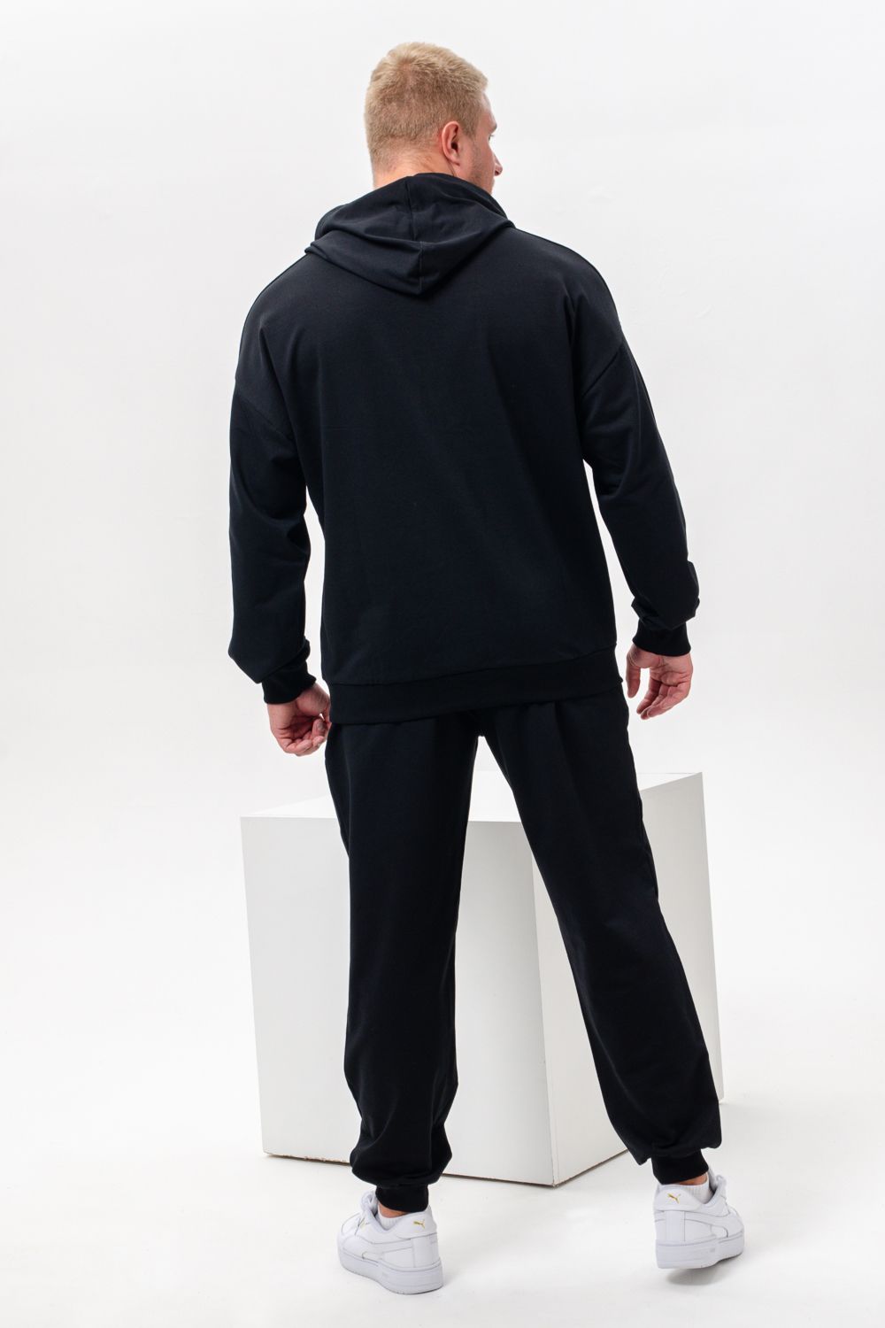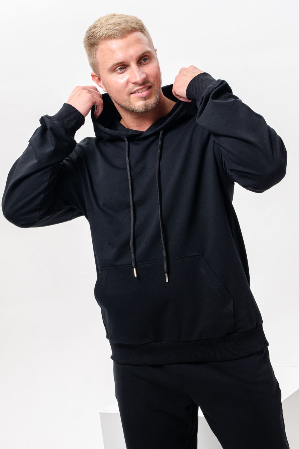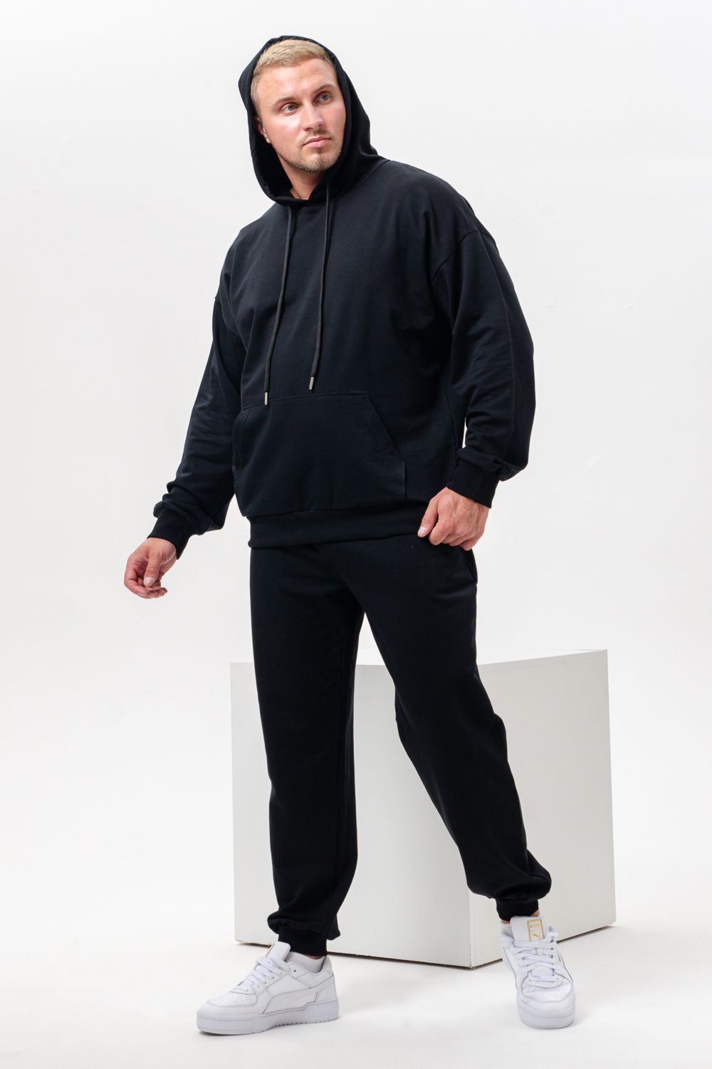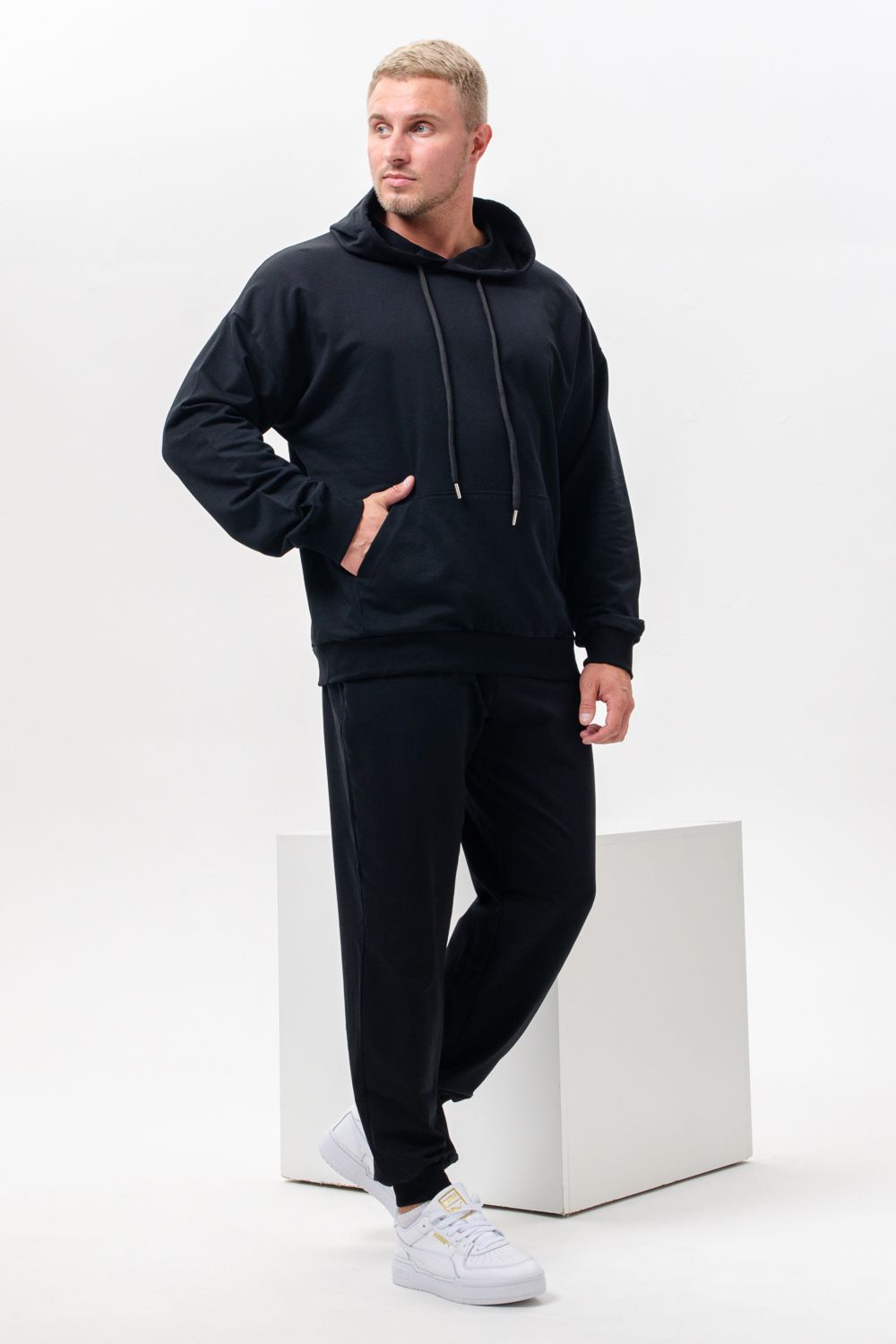 Костюм спортивный мужской с худи и джоггерами. Костюм свободного кроя состоит из толстовки с капюшоном и карманом кенгуру и брюк джоггеров на манжете с карманами в боковых швах. Костюм однотонный сшит из качественного хлопкового трикотажного материала - футера 2-х нитки. Обладает отличной эластичностью, не сковывает движений. Идеален для занятий спортом. Зимой костюм возможно носить в тренажерный зал или использовать как домашнюю одежду.