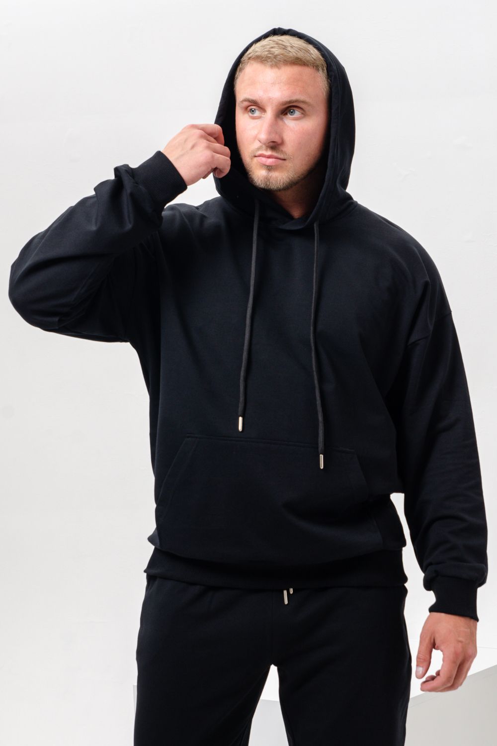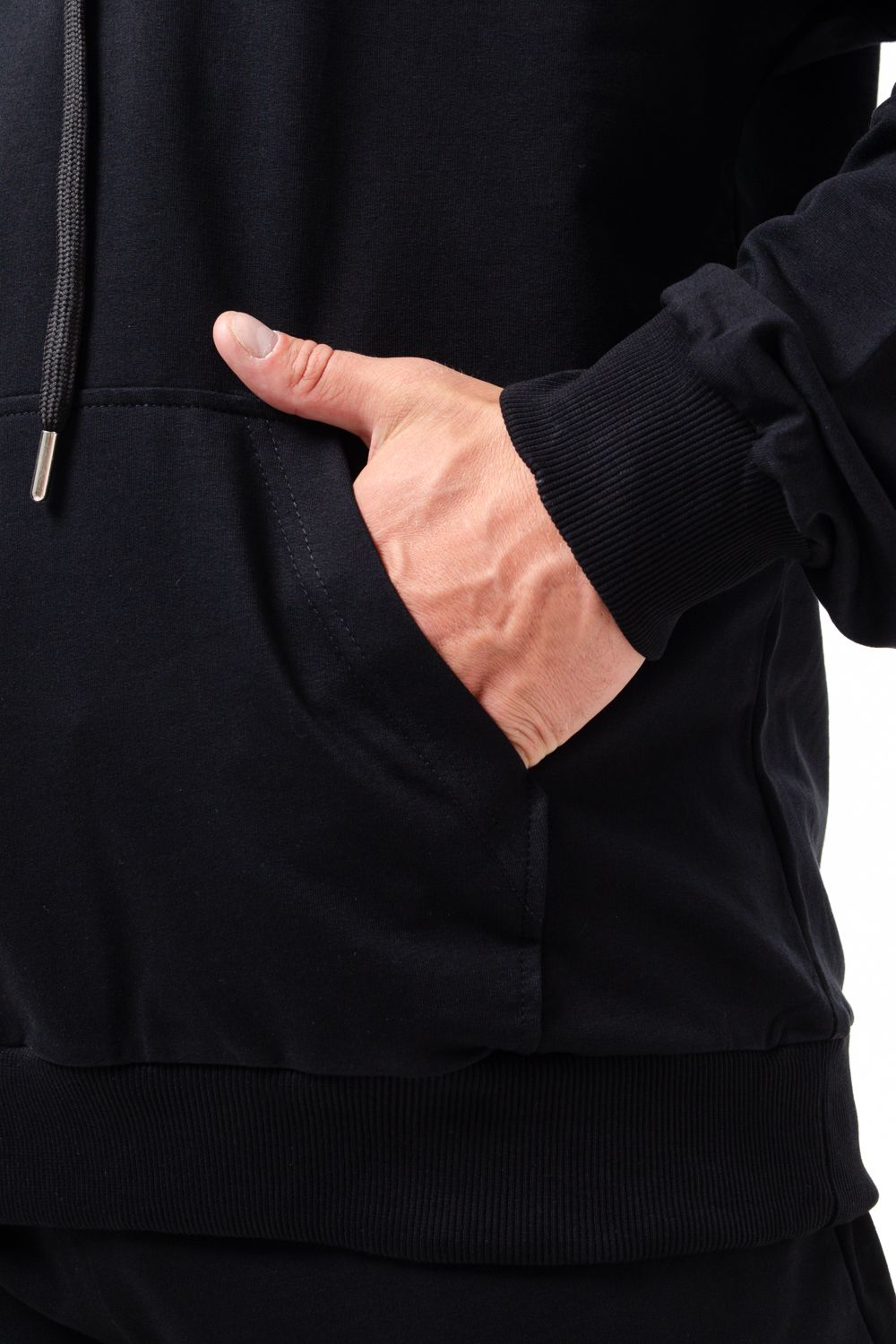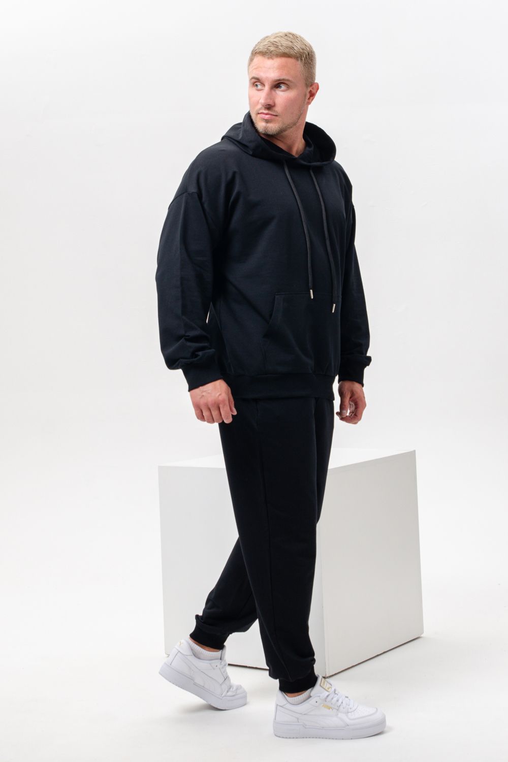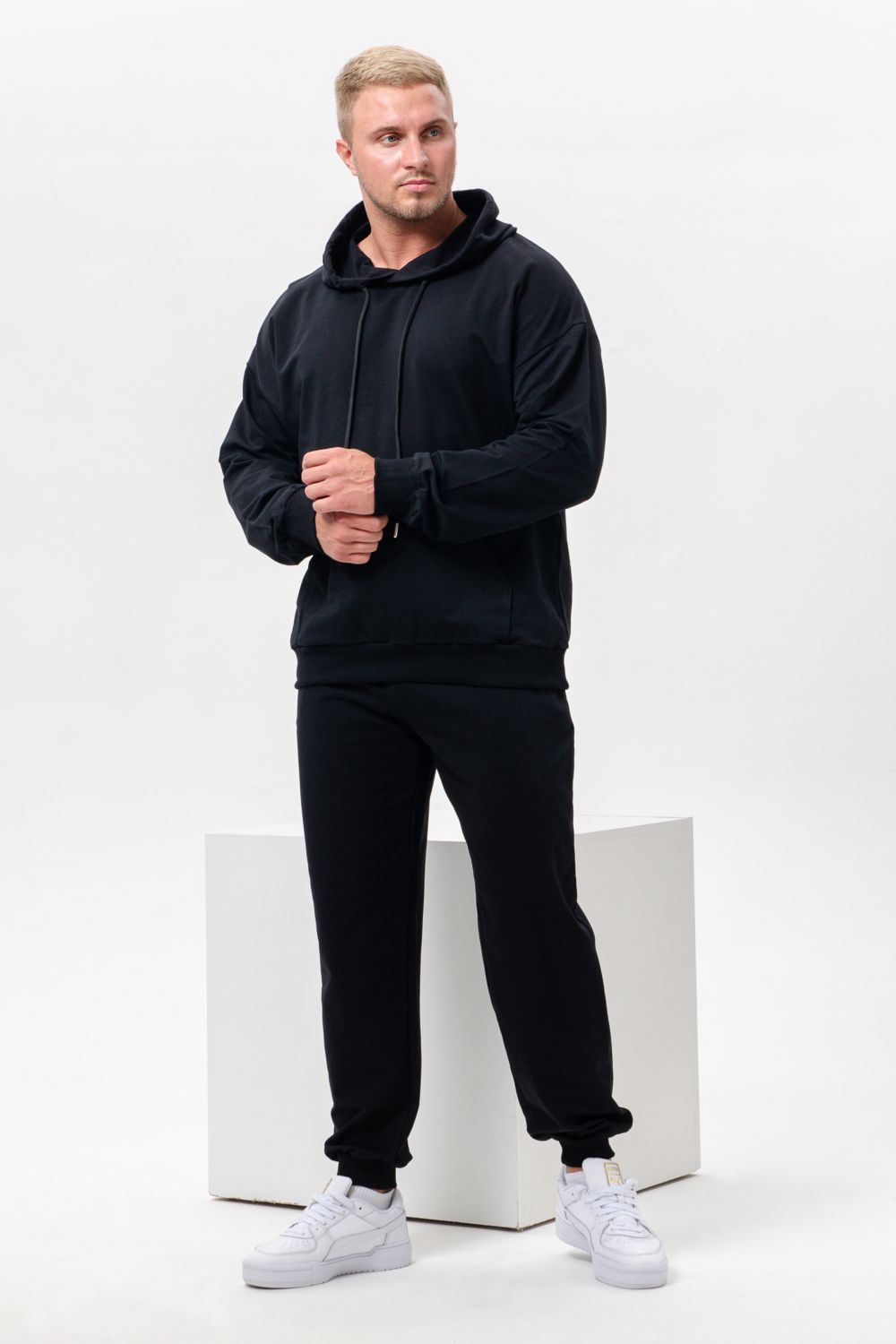 Костюм спортивный мужской с худи и джоггерами. Костюм свободного кроя состоит из толстовки с капюшоном и карманом кенгуру и брюк джоггеров на манжете с карманами в боковых швах. Костюм однотонный сшит из качественного хлопкового трикотажного материала - футера 2-х нитки. Обладает отличной эластичностью, не сковывает движений. Идеален для занятий спортом. Зимой костюм возможно носить в тренажерный зал или использовать как домашнюю одежду.