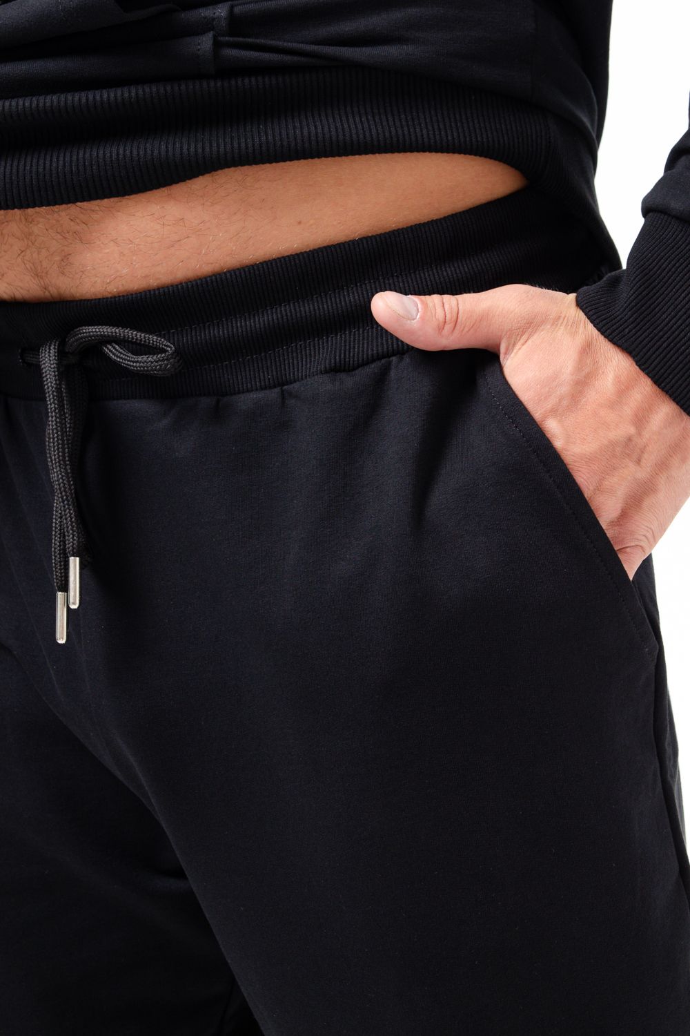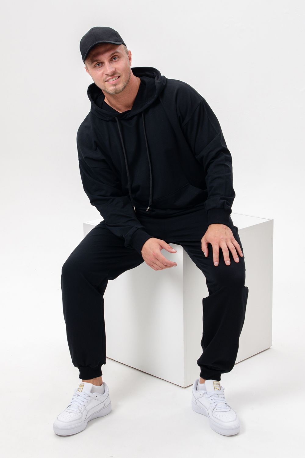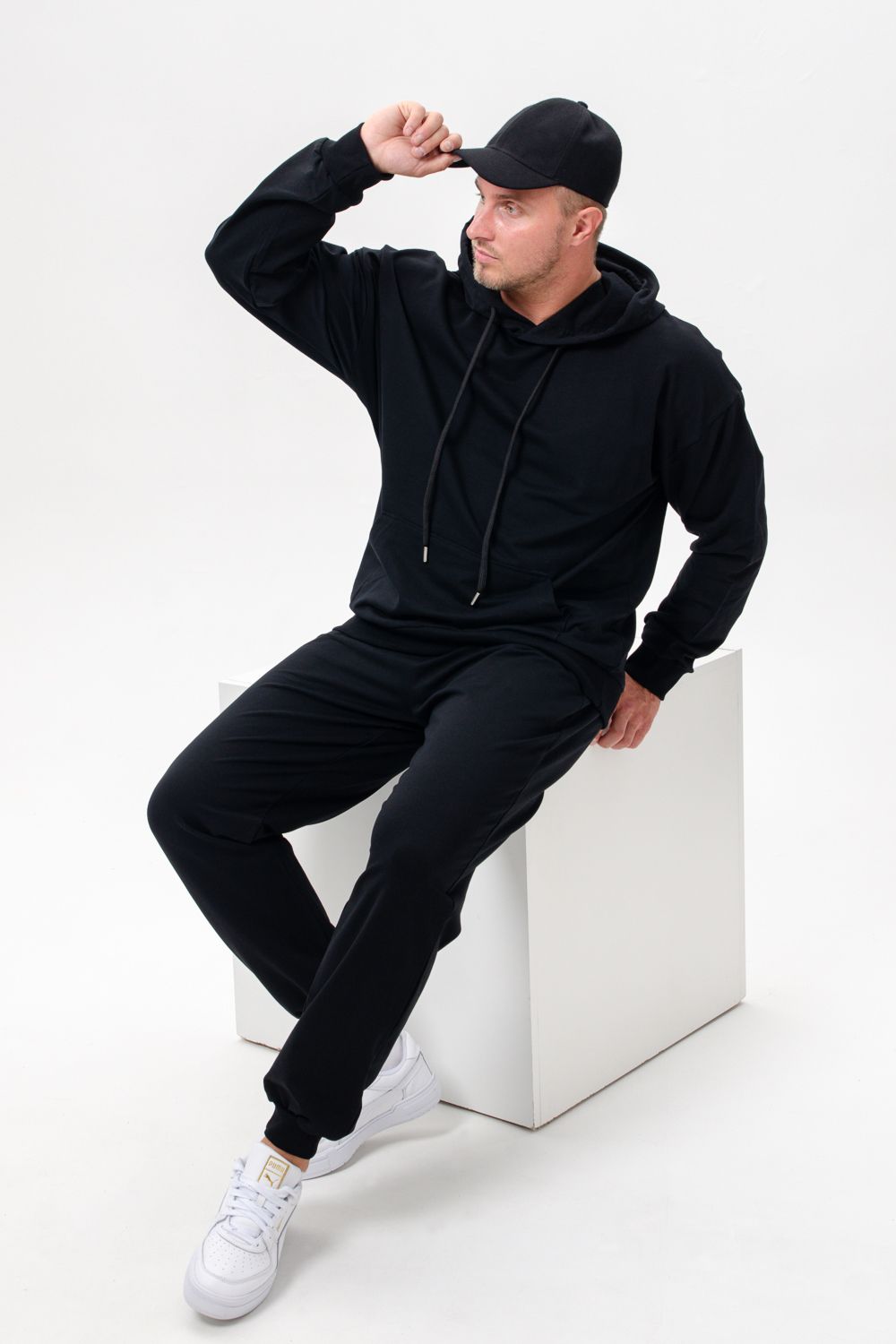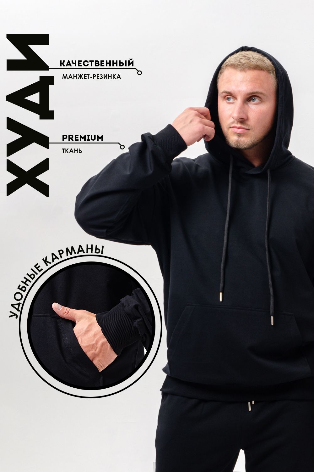 Костюм спортивный мужской с худи и джоггерами. Костюм свободного кроя состоит из толстовки с капюшоном и карманом кенгуру и брюк джоггеров на манжете с карманами в боковых швах. Костюм однотонный сшит из качественного хлопкового трикотажного материала - футера 2-х нитки. Обладает отличной эластичностью, не сковывает движений. Идеален для занятий спортом. Зимой костюм возможно носить в тренажерный зал или использовать как домашнюю одежду.