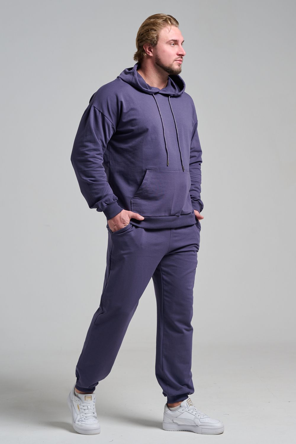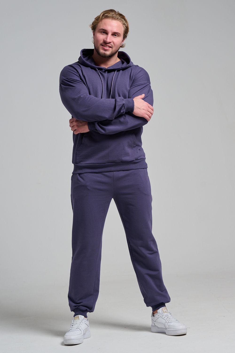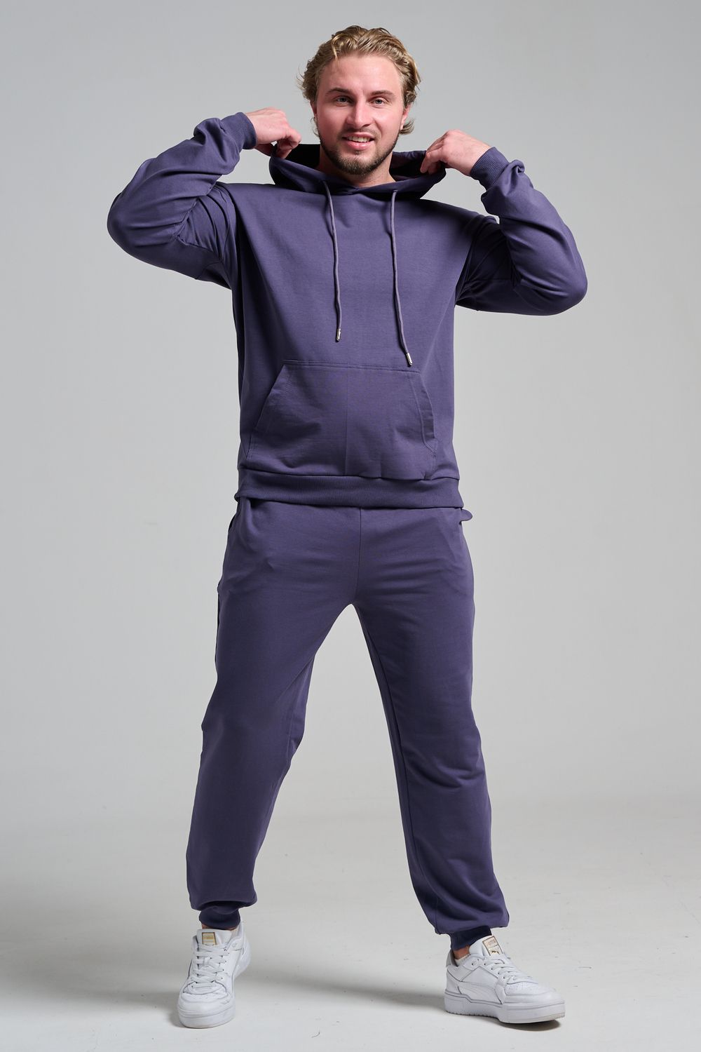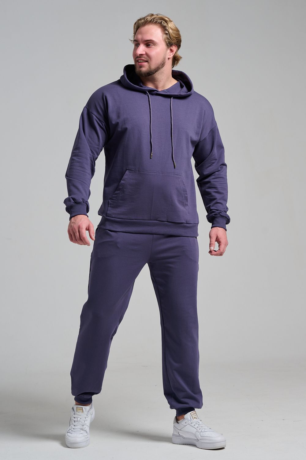 Костюм спортивный мужской с худи и джоггерами. Костюм свободного кроя состоит из толстовки с капюшоном и карманом кенгуру и брюк джоггеров на манжете с карманами в боковых швах. Костюм однотонный сшит из качественного хлопкового трикотажного материала - футера 2-х нитки. Обладает отличной эластичностью, не сковывает движений. Идеален для занятий спортом. Зимой костюм возможно носить в тренажерный зал или использовать как домашнюю одежду.