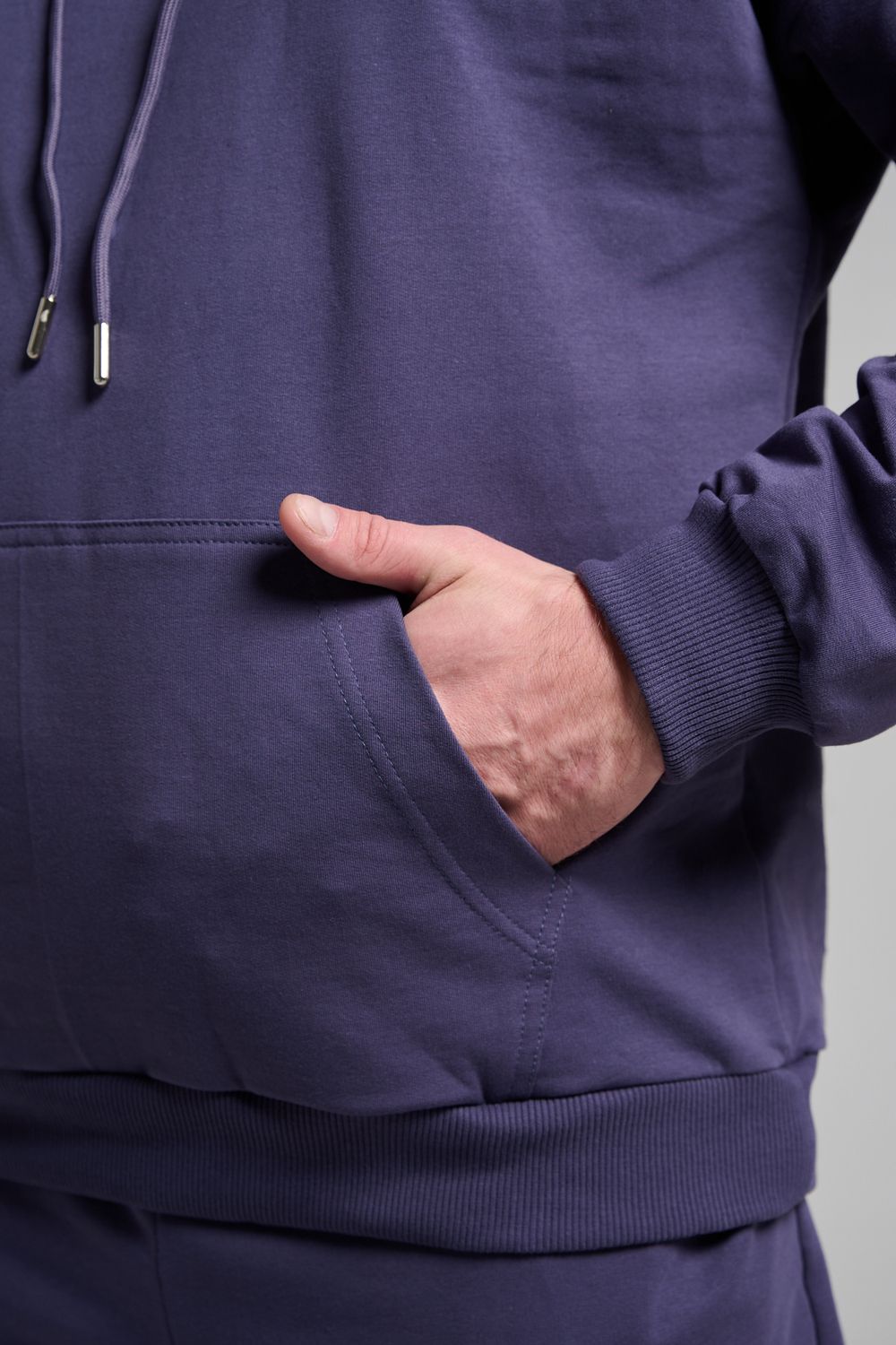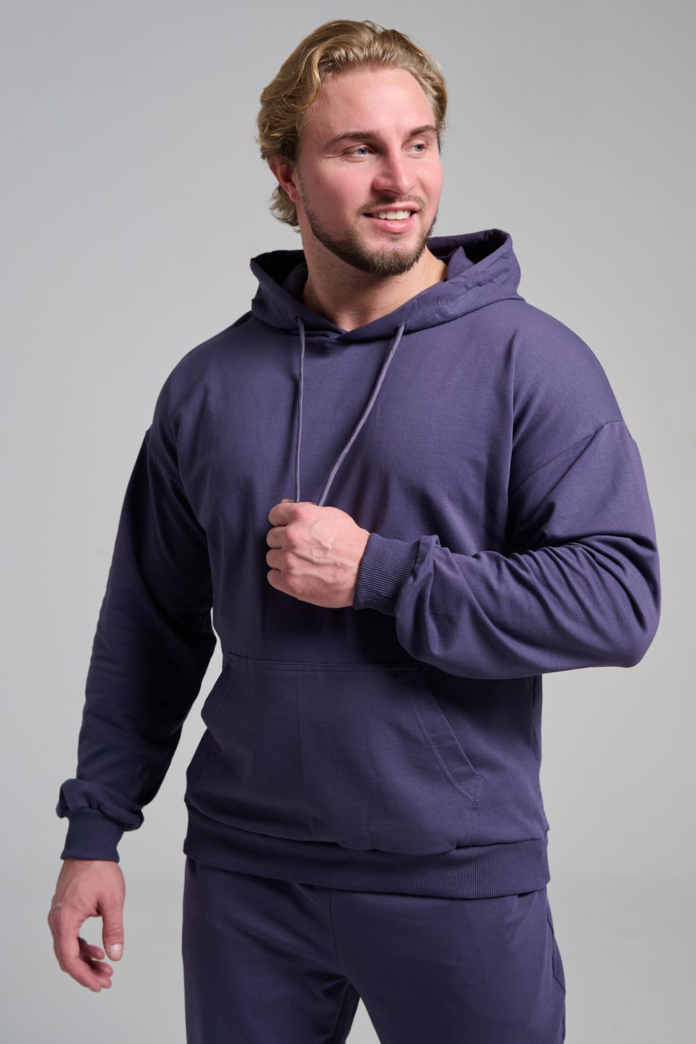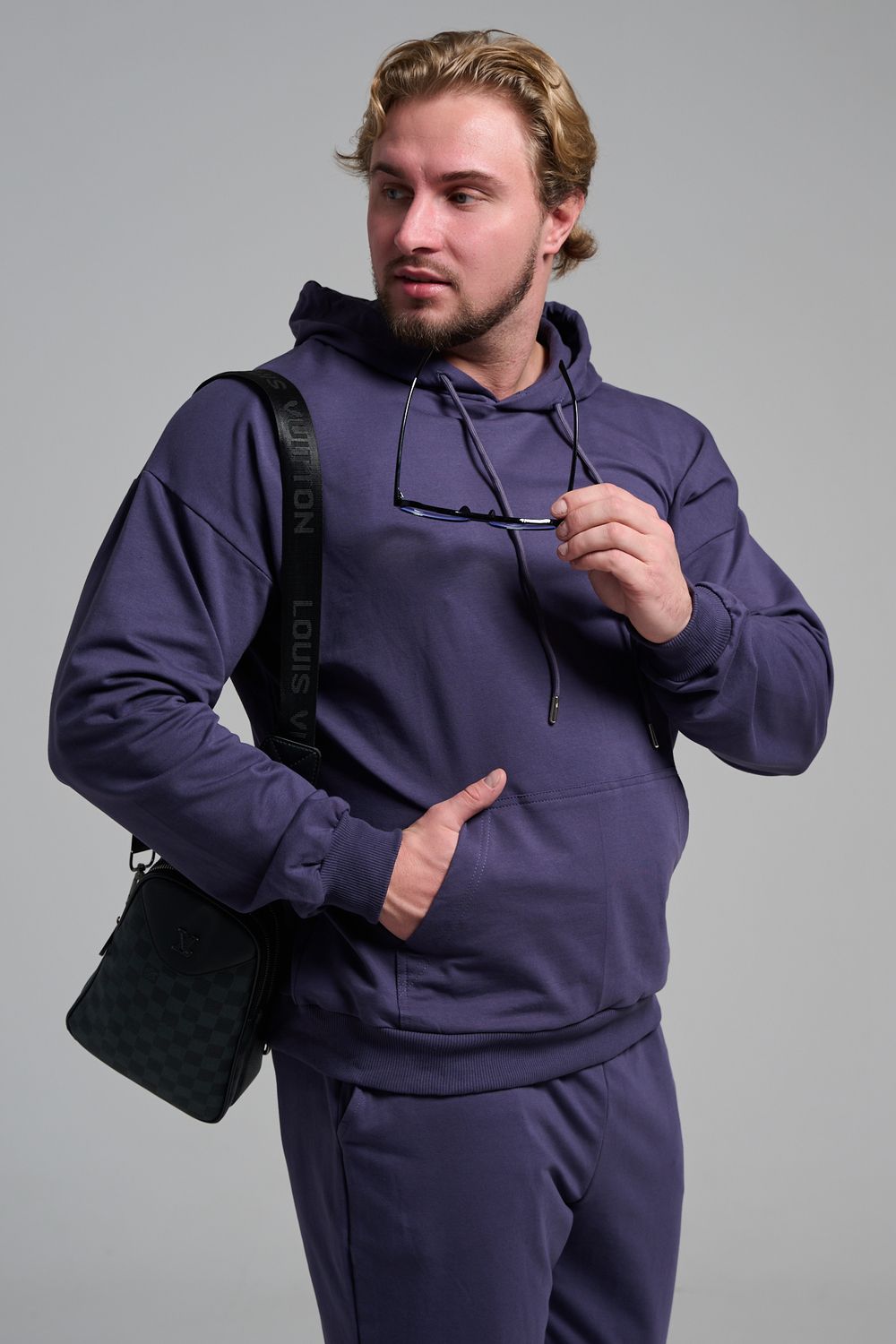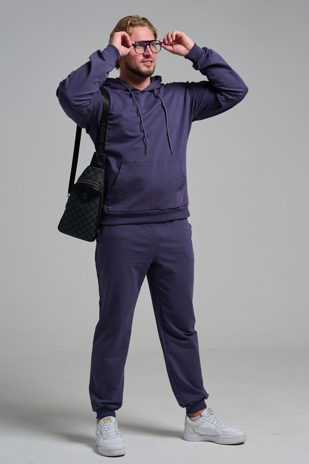 Костюм спортивный мужской с худи и джоггерами. Костюм свободного кроя состоит из толстовки с капюшоном и карманом кенгуру и брюк джоггеров на манжете с карманами в боковых швах. Костюм однотонный сшит из качественного хлопкового трикотажного материала - футера 2-х нитки. Обладает отличной эластичностью, не сковывает движений. Идеален для занятий спортом. Зимой костюм возможно носить в тренажерный зал или использовать как домашнюю одежду.