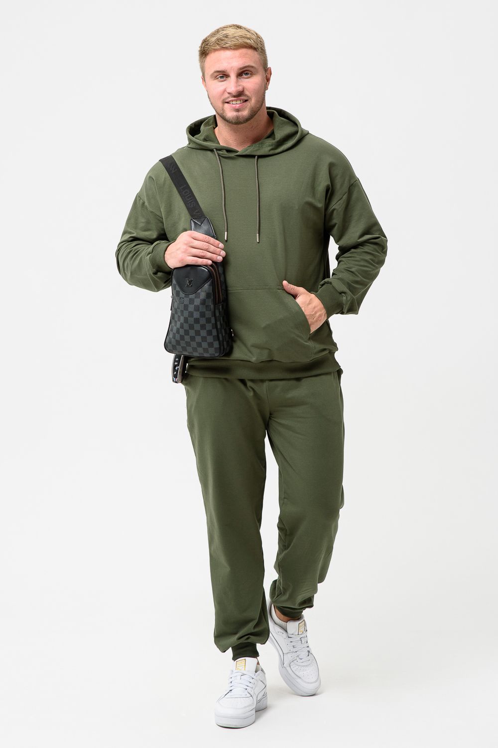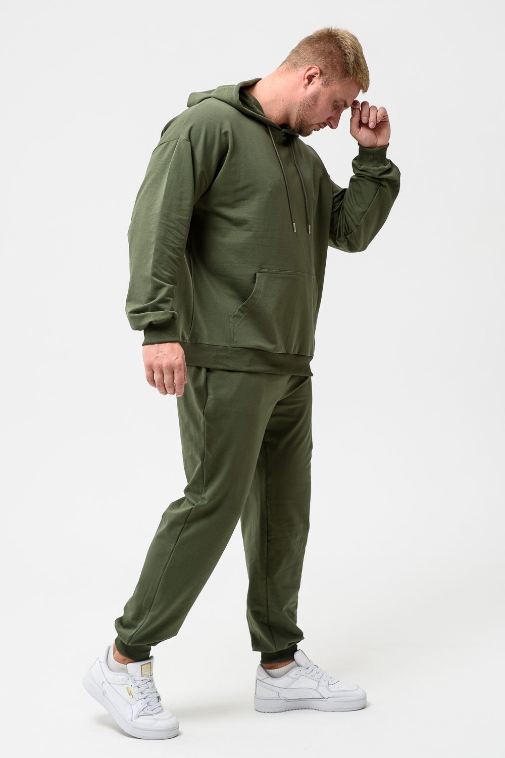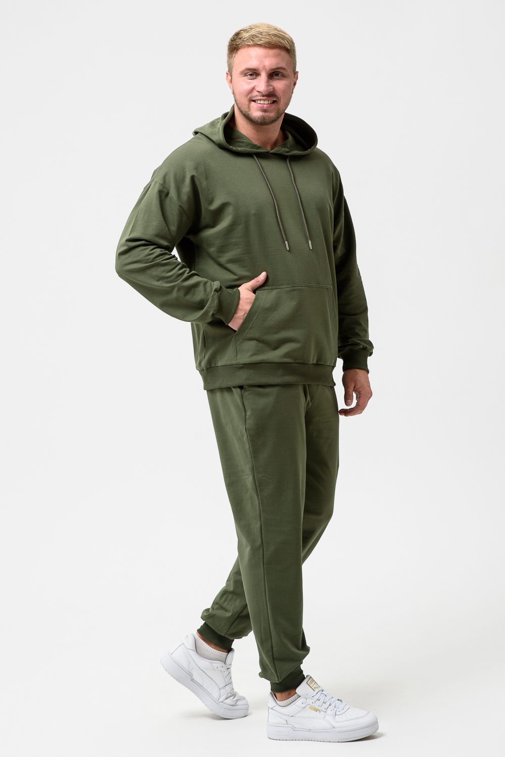 Костюм спортивный мужской с худи и джоггерами. Костюм свободного кроя состоит из толстовки с капюшоном и карманом кенгуру и брюк джоггеров на манжете с карманами в боковых швах. Костюм однотонный сшит из качественного хлопкового трикотажного материала - футера 2-х нитки. Обладает отличной эластичностью, не сковывает движений. Идеален для занятий спортом. Зимой костюм возможно носить в тренажерный зал или использовать как домашнюю одежду.