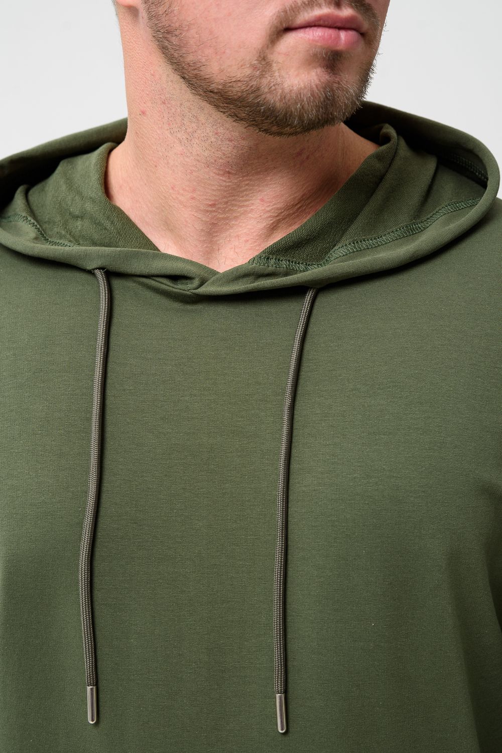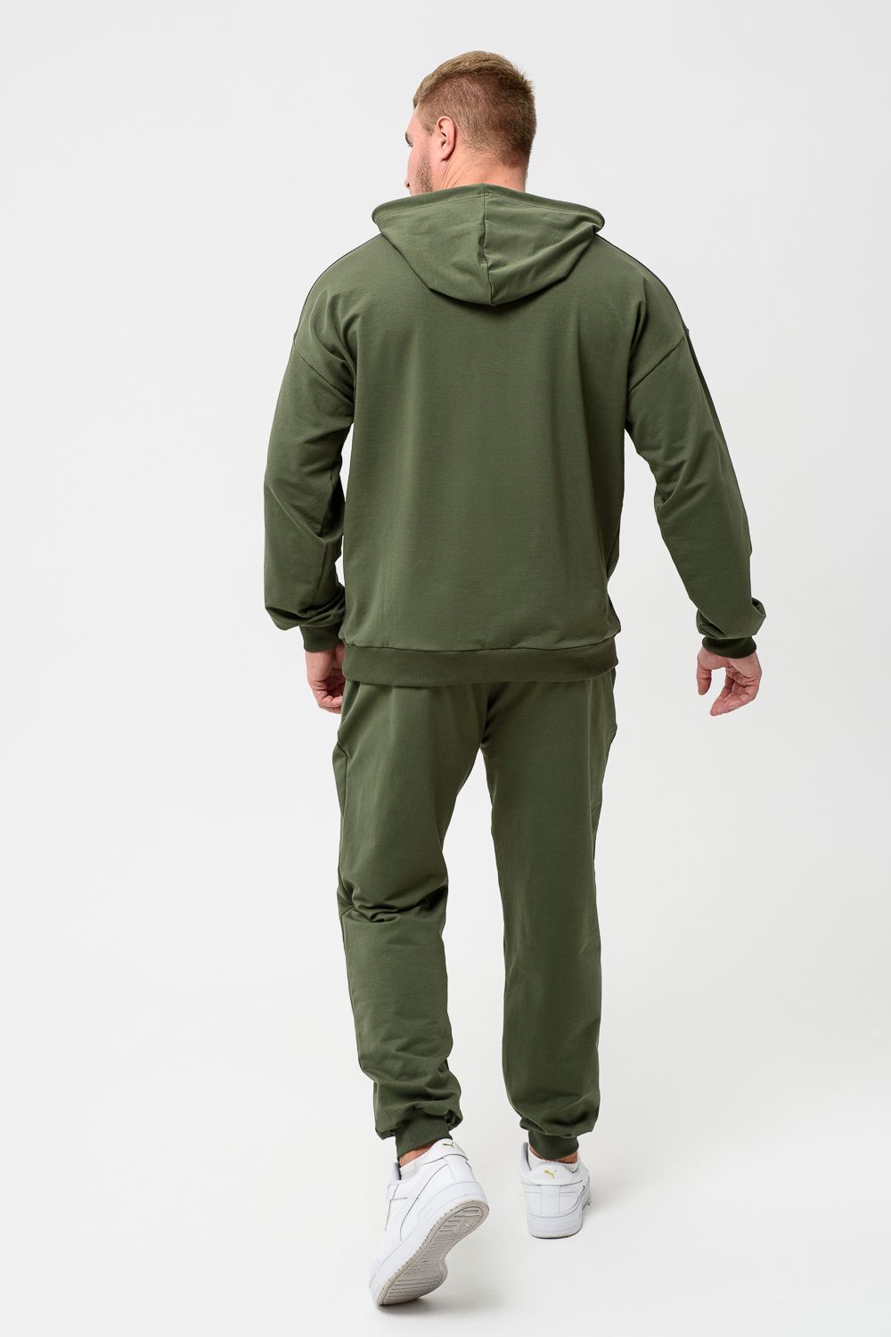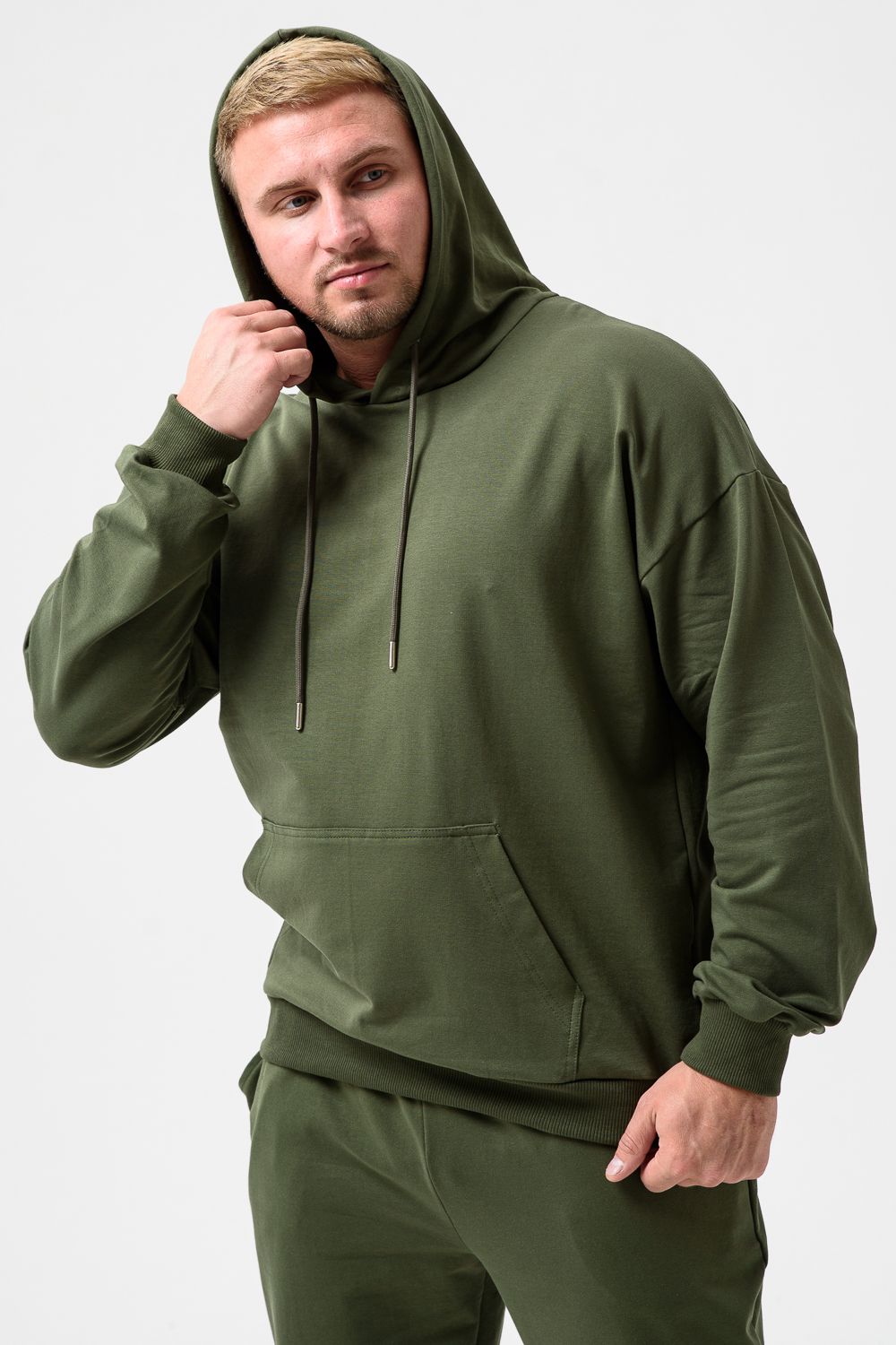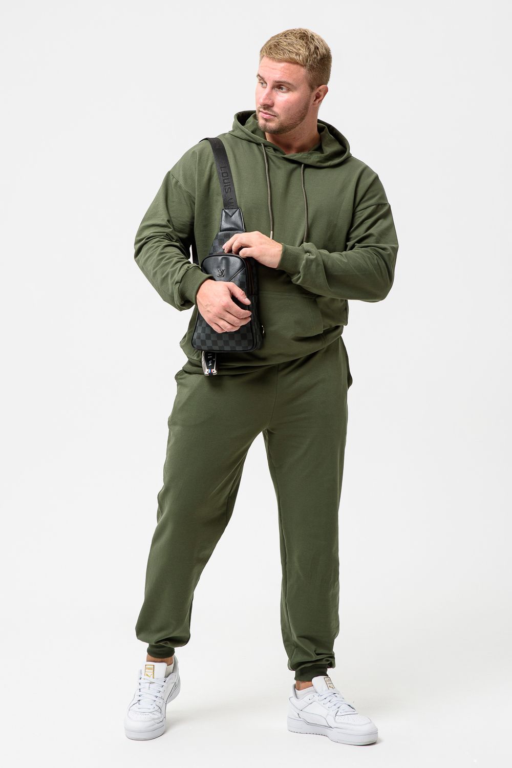 Костюм спортивный мужской с худи и джоггерами. Костюм свободного кроя состоит из толстовки с капюшоном и карманом кенгуру и брюк джоггеров на манжете с карманами в боковых швах. Костюм однотонный сшит из качественного хлопкового трикотажного материала - футера 2-х нитки. Обладает отличной эластичностью, не сковывает движений. Идеален для занятий спортом. Зимой костюм возможно носить в тренажерный зал или использовать как домашнюю одежду.