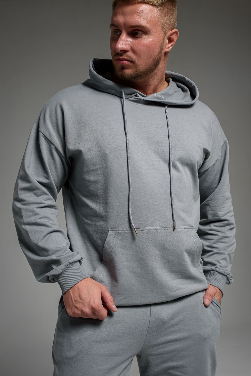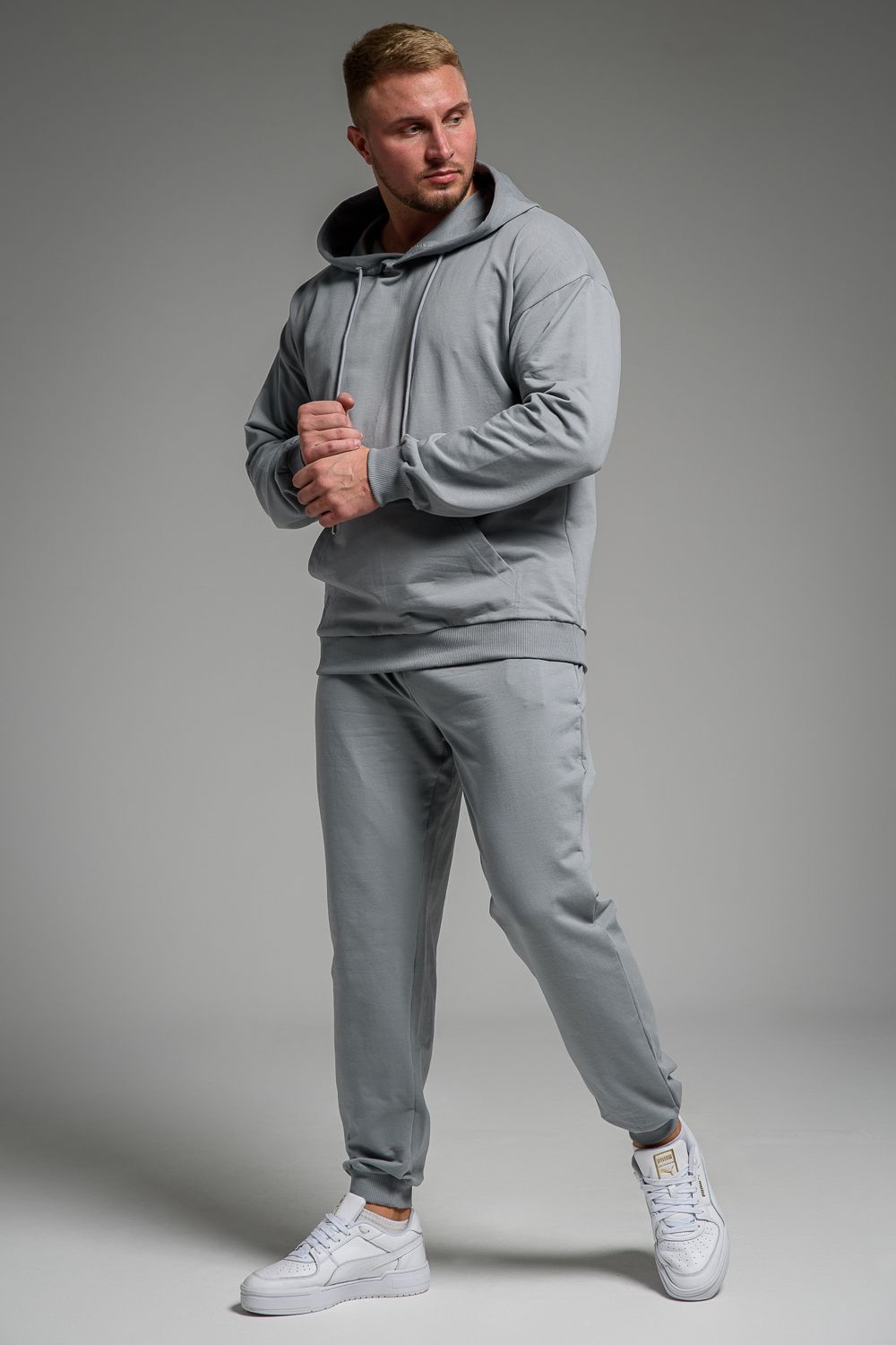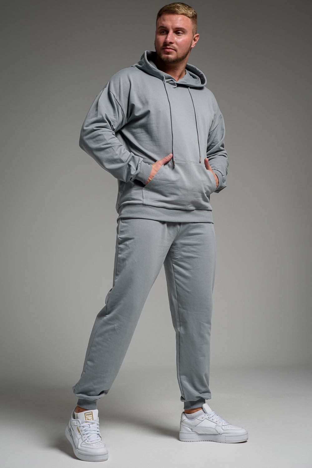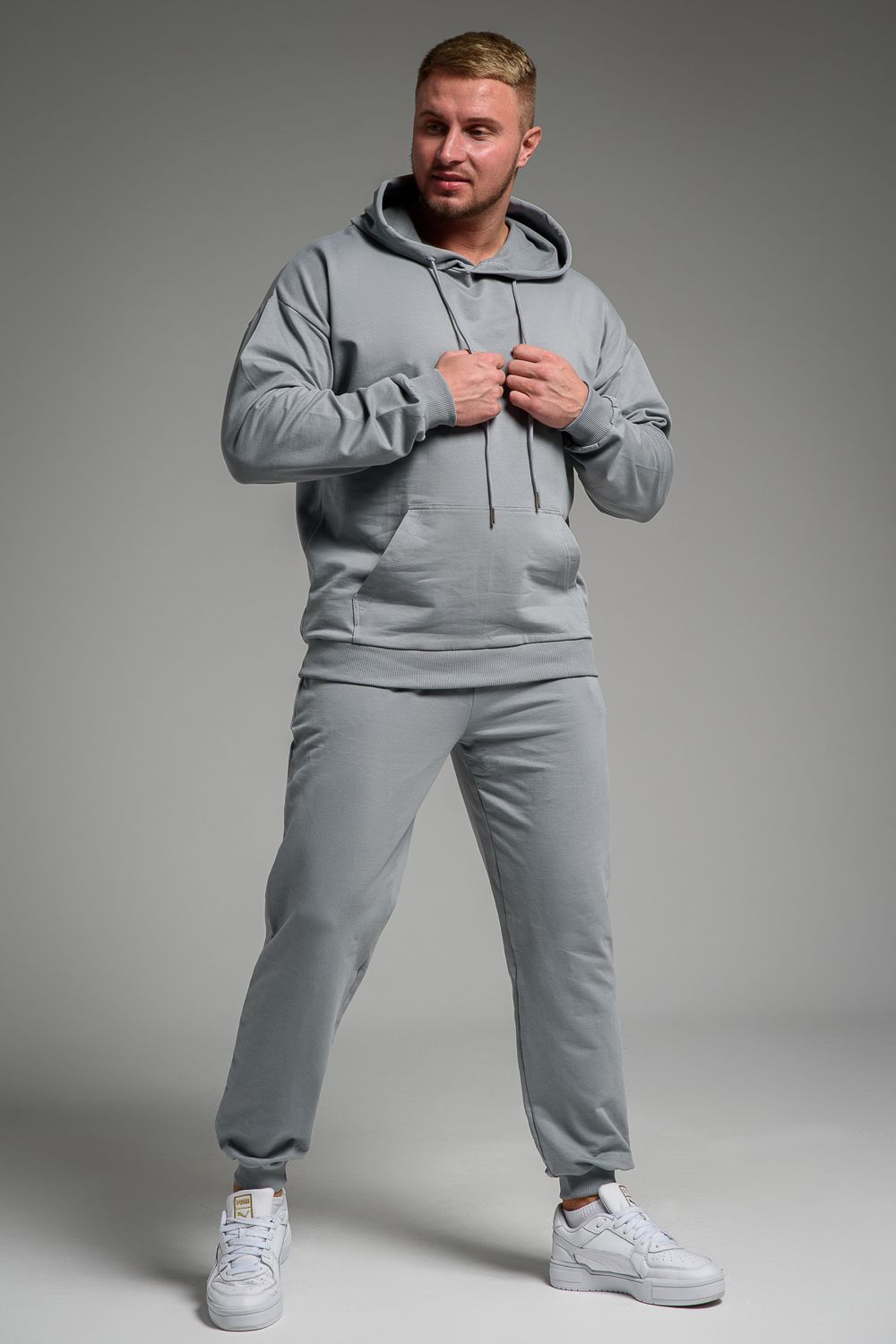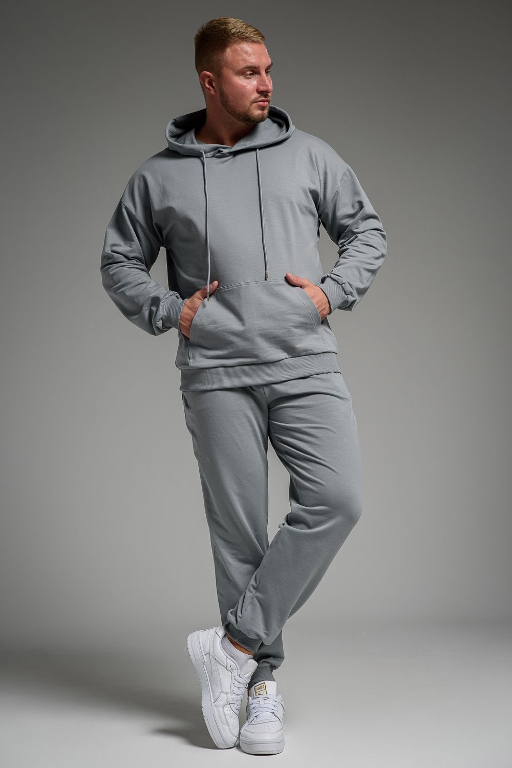 Костюм спортивный мужской с худи и джоггерами. Костюм свободного кроя состоит из толстовки с капюшоном и карманом кенгуру и брюк джоггеров на манжете с карманами в боковых швах. Костюм однотонный сшит из качественного хлопкового трикотажного материала - футера 2-х нитки. Обладает отличной эластичностью, не сковывает движений. Идеален для занятий спортом. Зимой костюм возможно носить в тренажерный зал или использовать как домашнюю одежду.
