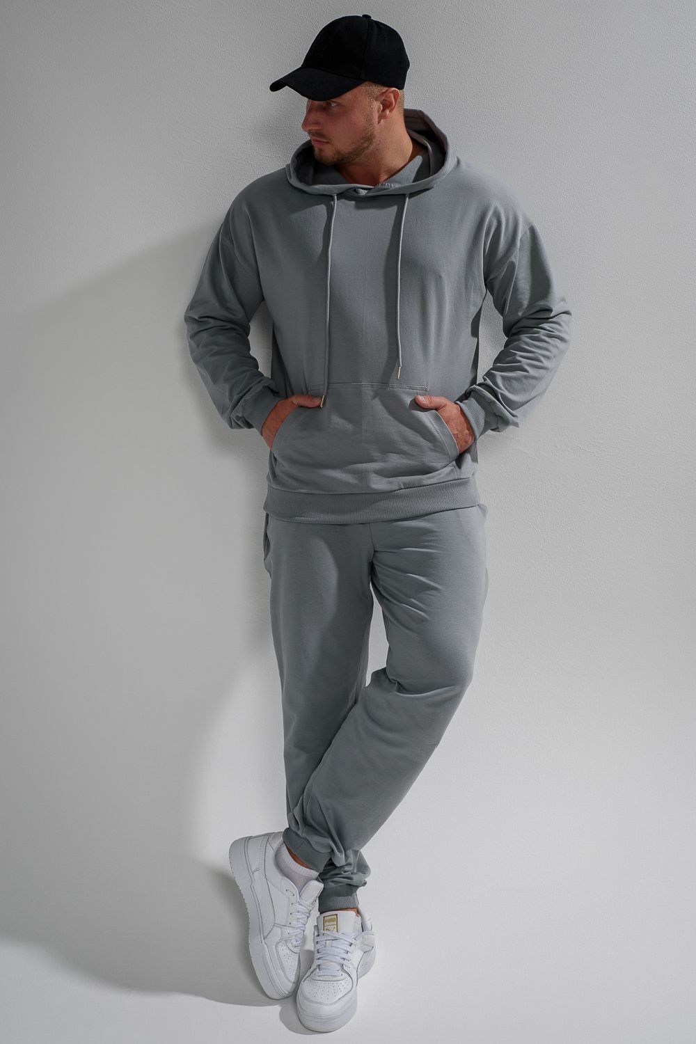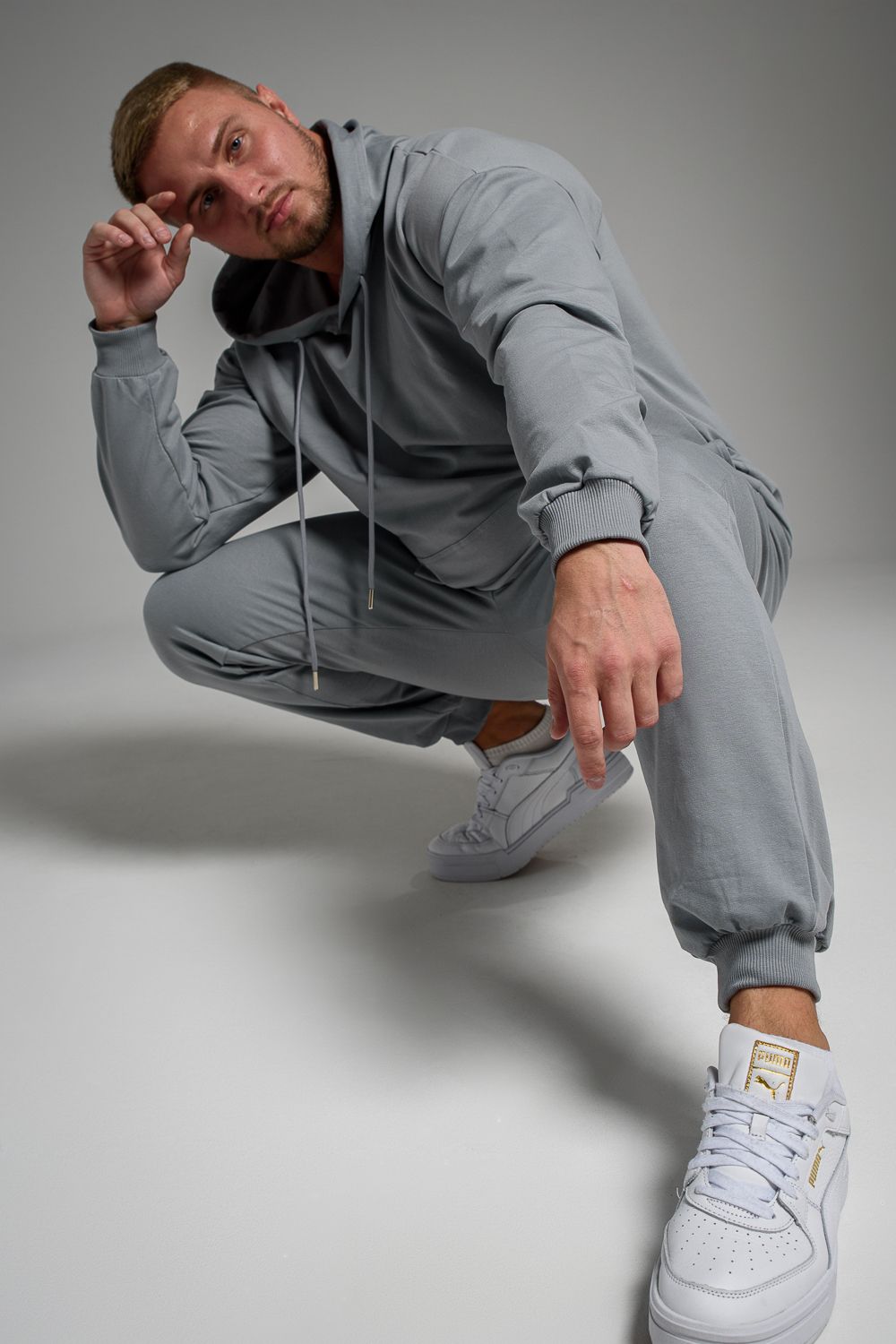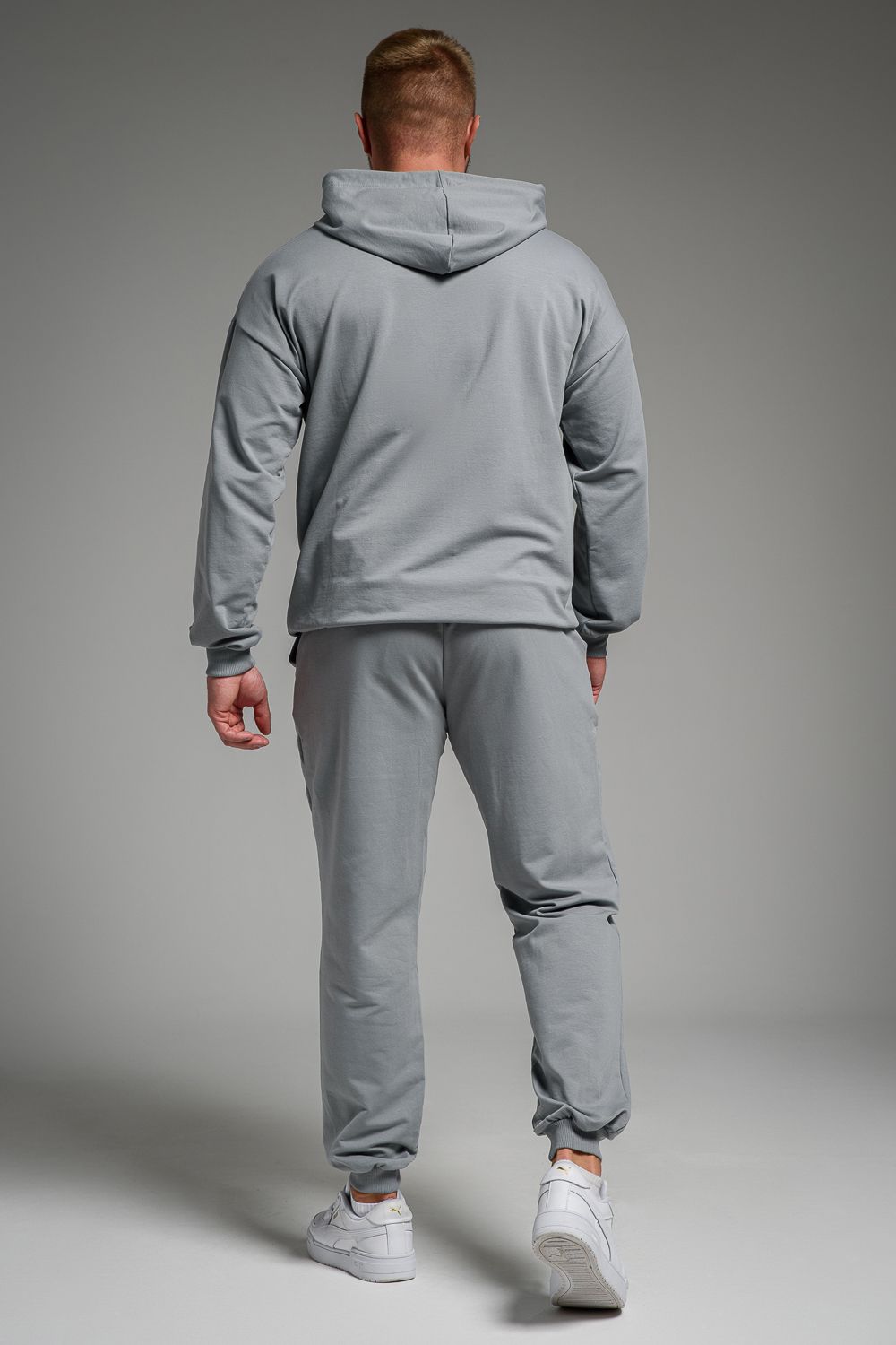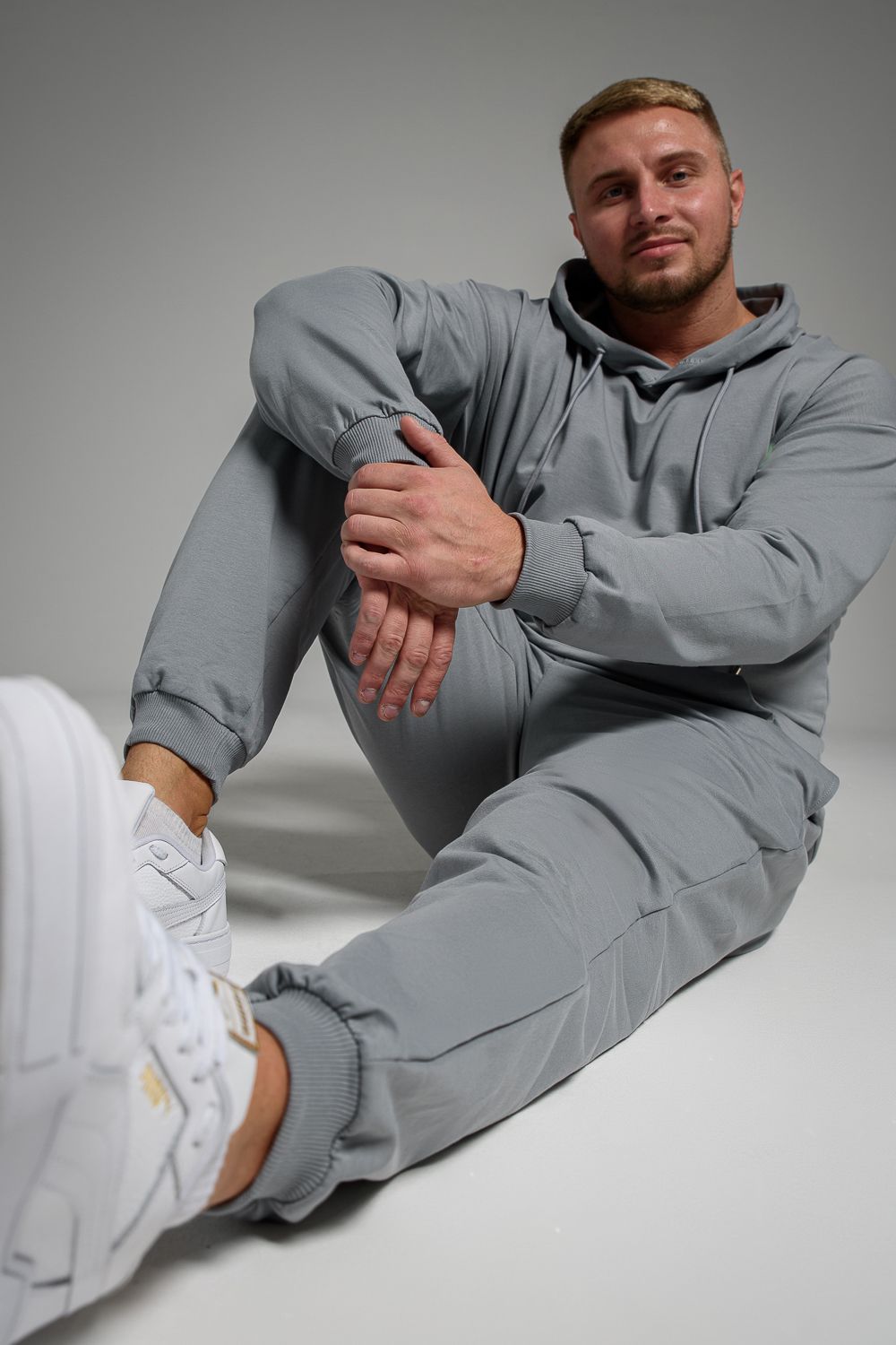 Костюм спортивный мужской с худи и джоггерами. Костюм свободного кроя состоит из толстовки с капюшоном и карманом кенгуру и брюк джоггеров на манжете с карманами в боковых швах. Костюм однотонный сшит из качественного хлопкового трикотажного материала - футера 2-х нитки. Обладает отличной эластичностью, не сковывает движений. Идеален для занятий спортом. Зимой костюм возможно носить в тренажерный зал или использовать как домашнюю одежду.