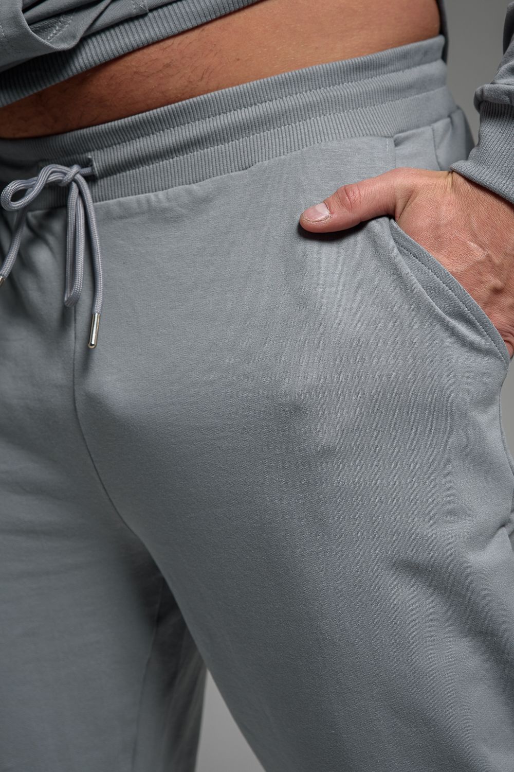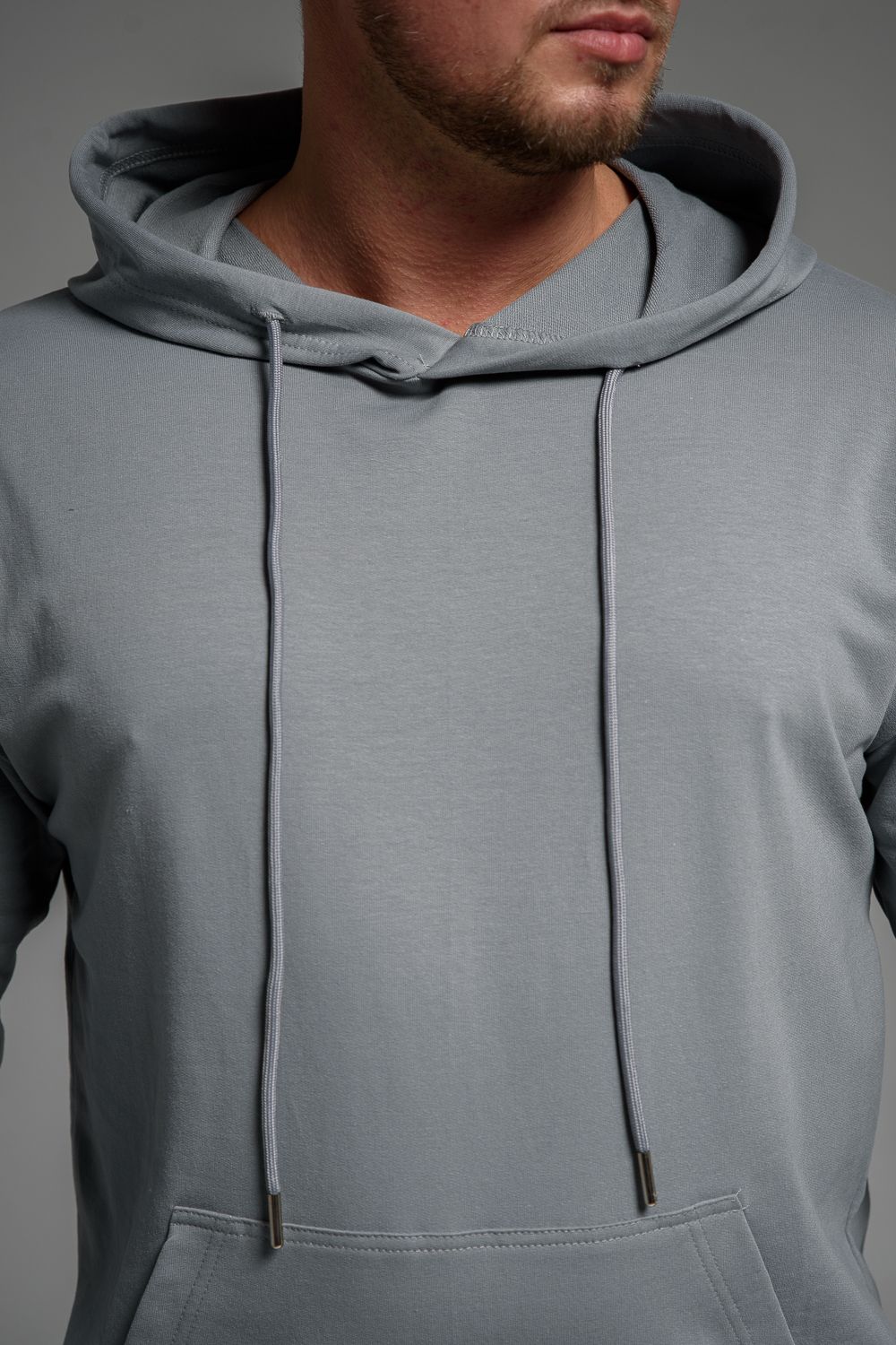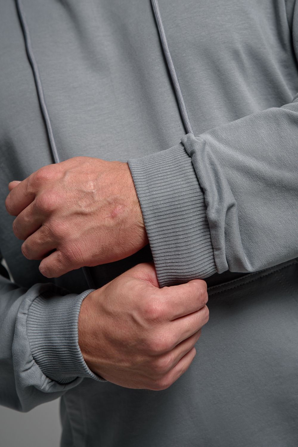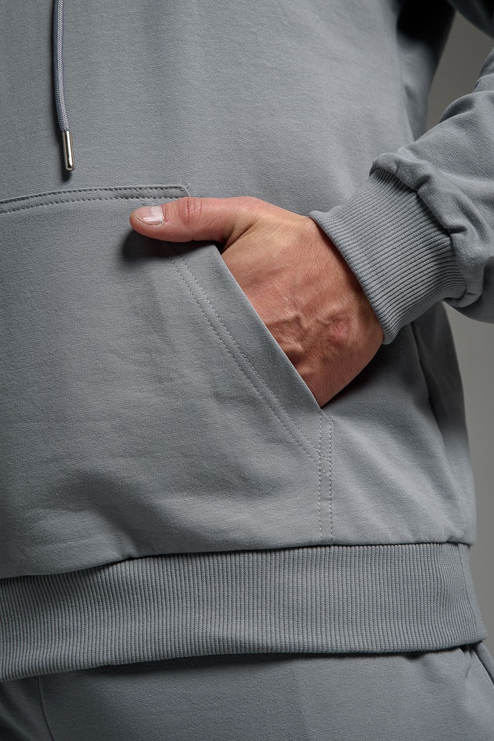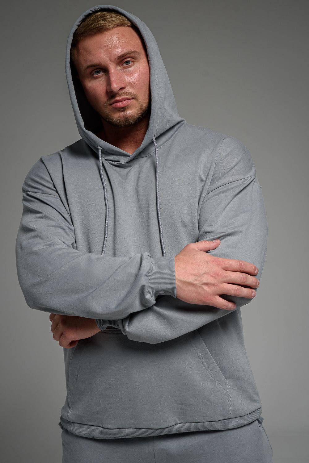 Костюм спортивный мужской с худи и джоггерами. Костюм свободного кроя состоит из толстовки с капюшоном и карманом кенгуру и брюк джоггеров на манжете с карманами в боковых швах. Костюм однотонный сшит из качественного хлопкового трикотажного материала - футера 2-х нитки. Обладает отличной эластичностью, не сковывает движений. Идеален для занятий спортом. Зимой костюм возможно носить в тренажерный зал или использовать как домашнюю одежду.