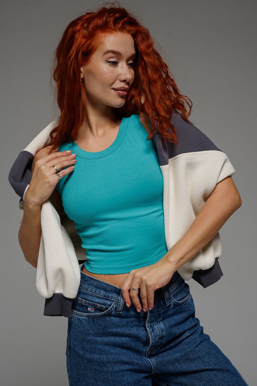 Базовый топ укороченной длины. Выполнен из фактурной ткани в рубчик из 100% полиэстера. Облегающий крой отлично садится по фигуре, подчеркивая её достоинства. Круглая горловина, широкие бретели, не просвечивает, топ максимально комфортный в носке.