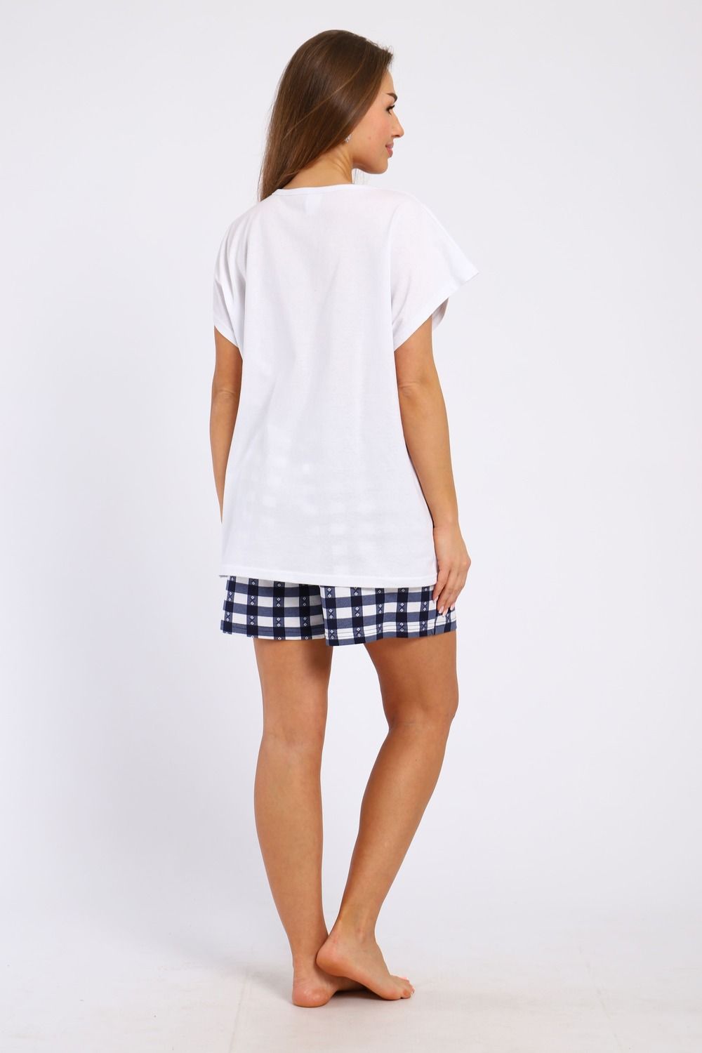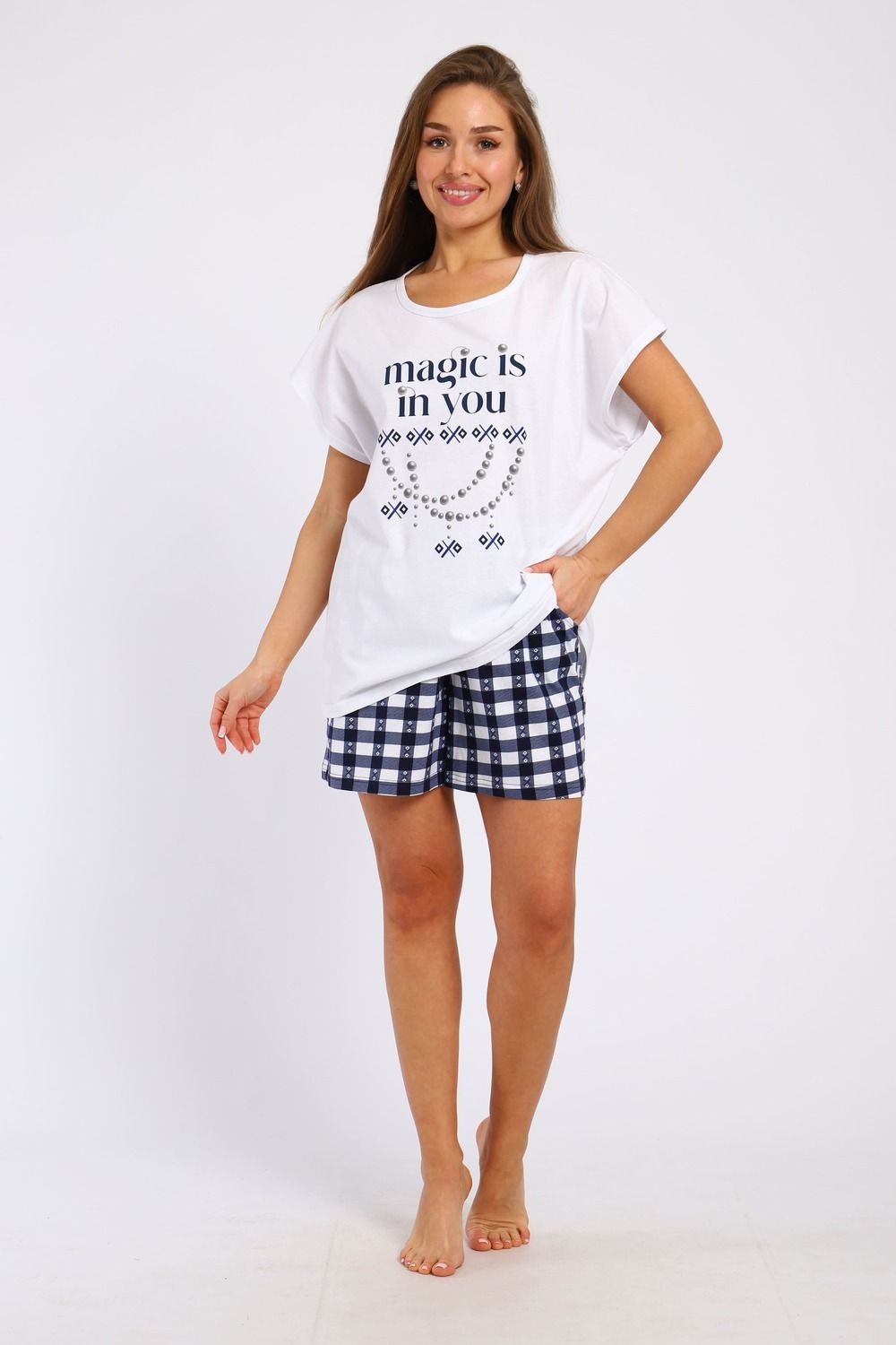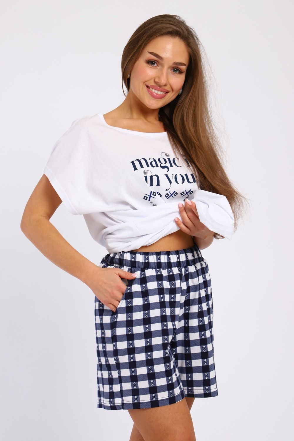 Костюм с шортами выполнен из трикотажного полотна кулирка. Костюм состоит из футболки и шорт. Футболка свободного силуэта, спущенное плечо, углубленная пройма, горловина окантована, на полочке выполнена печать. Шорты с притачным поясом на резинке, карманы в боковых швах.