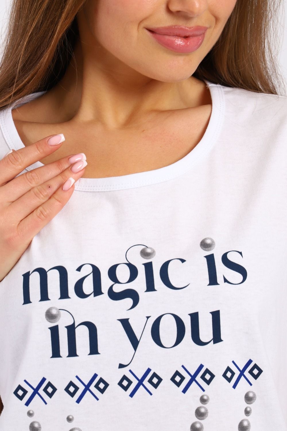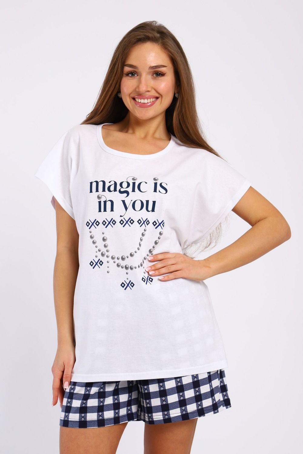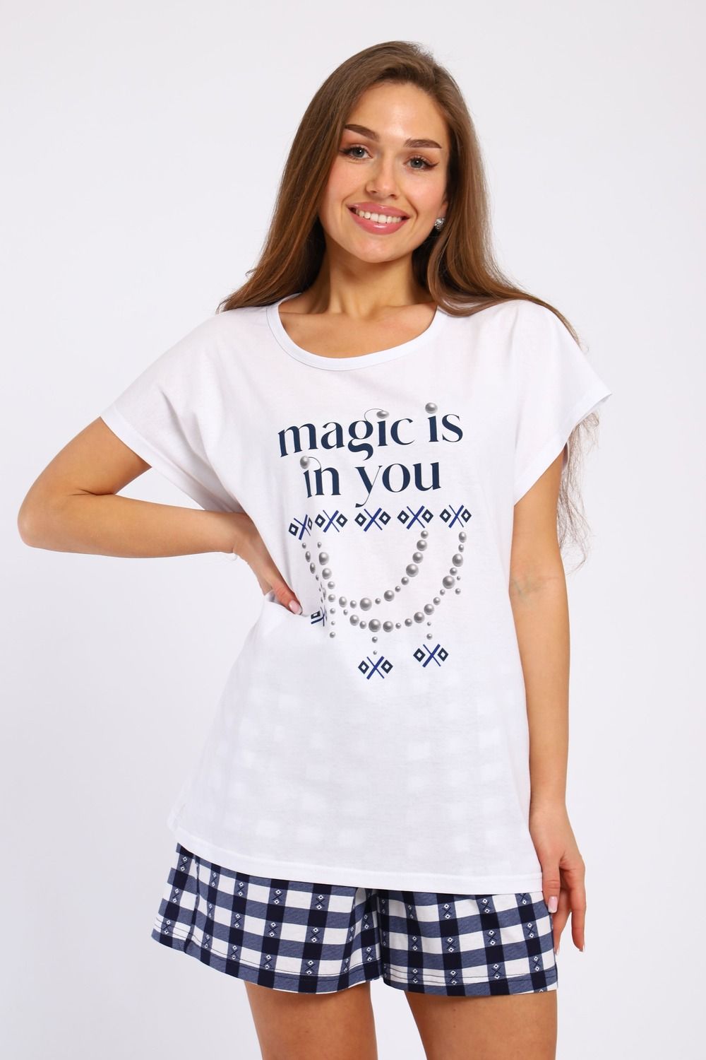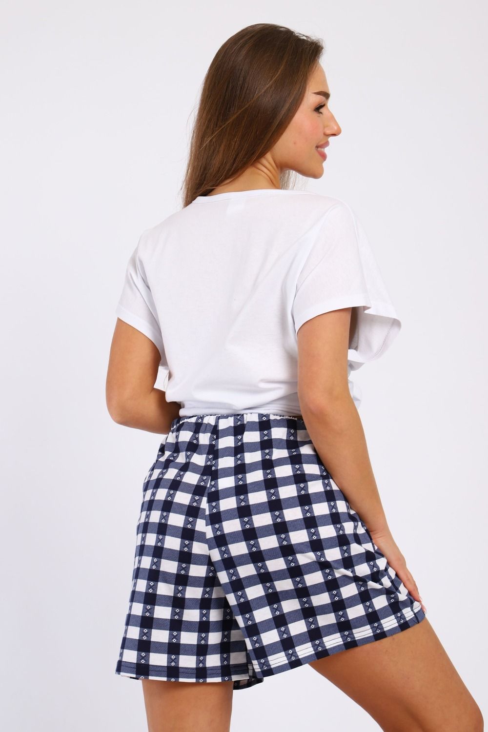 Костюм с шортами выполнен из трикотажного полотна кулирка. Костюм состоит из футболки и шорт. Футболка свободного силуэта, спущенное плечо, углубленная пройма, горловина окантована, на полочке выполнена печать. Шорты с притачным поясом на резинке, карманы в боковых швах.