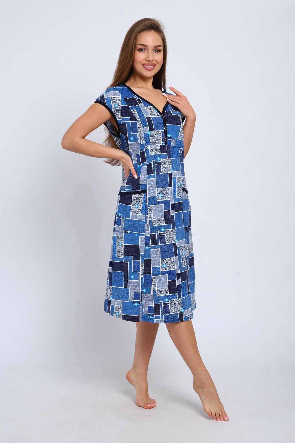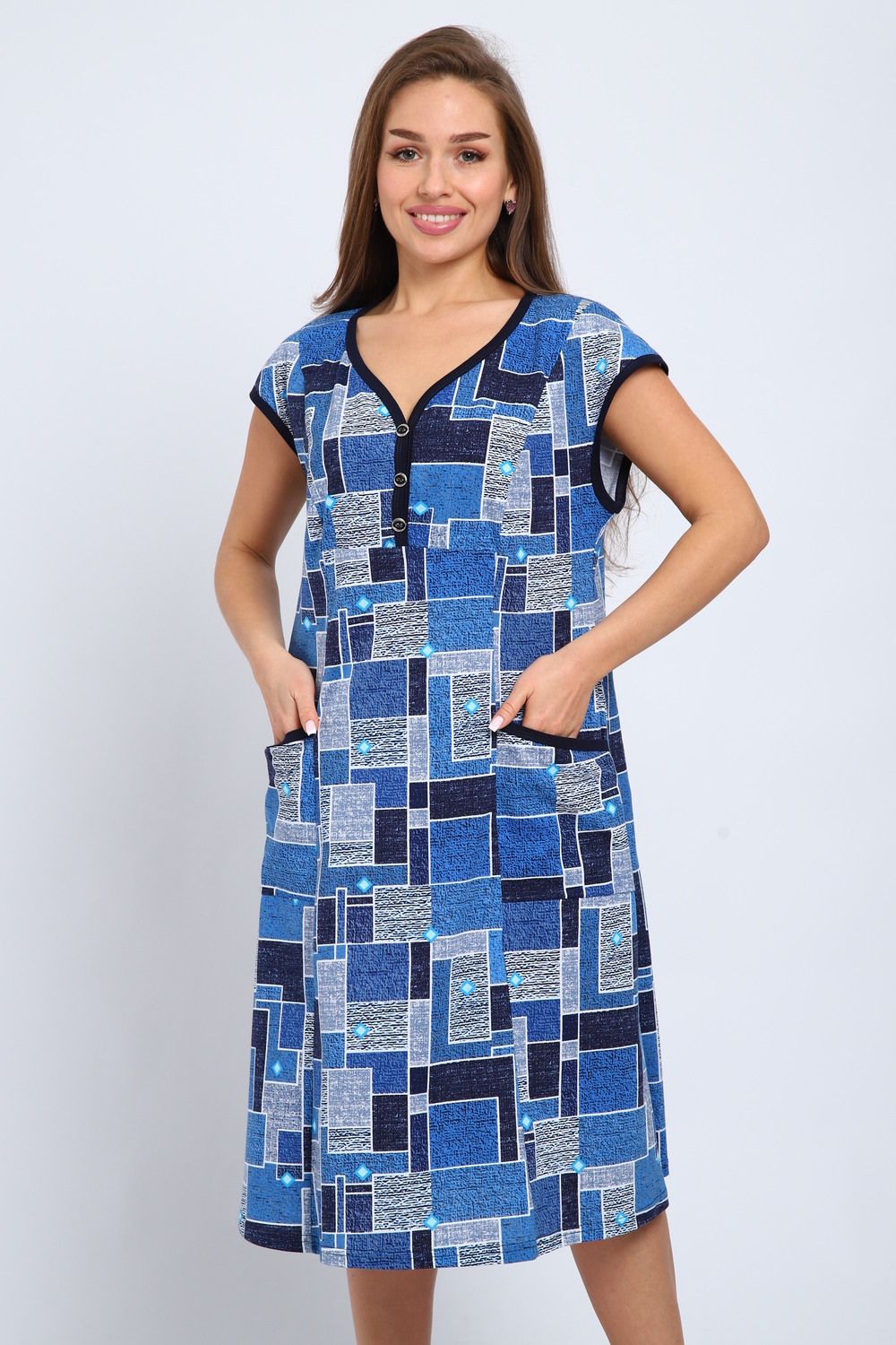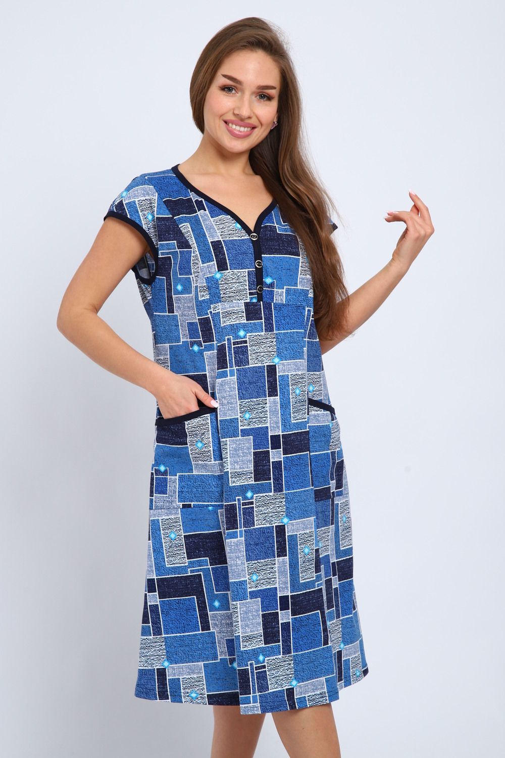 Платье женское выполнено из набивного трткотажного полотна кулирка. Силуэт свободный. Плечо спущенное. Подрез под грудь. На груди застежка на пуговицах до подреза. Карманы в боковых швах.