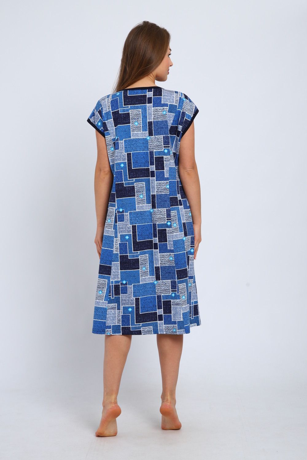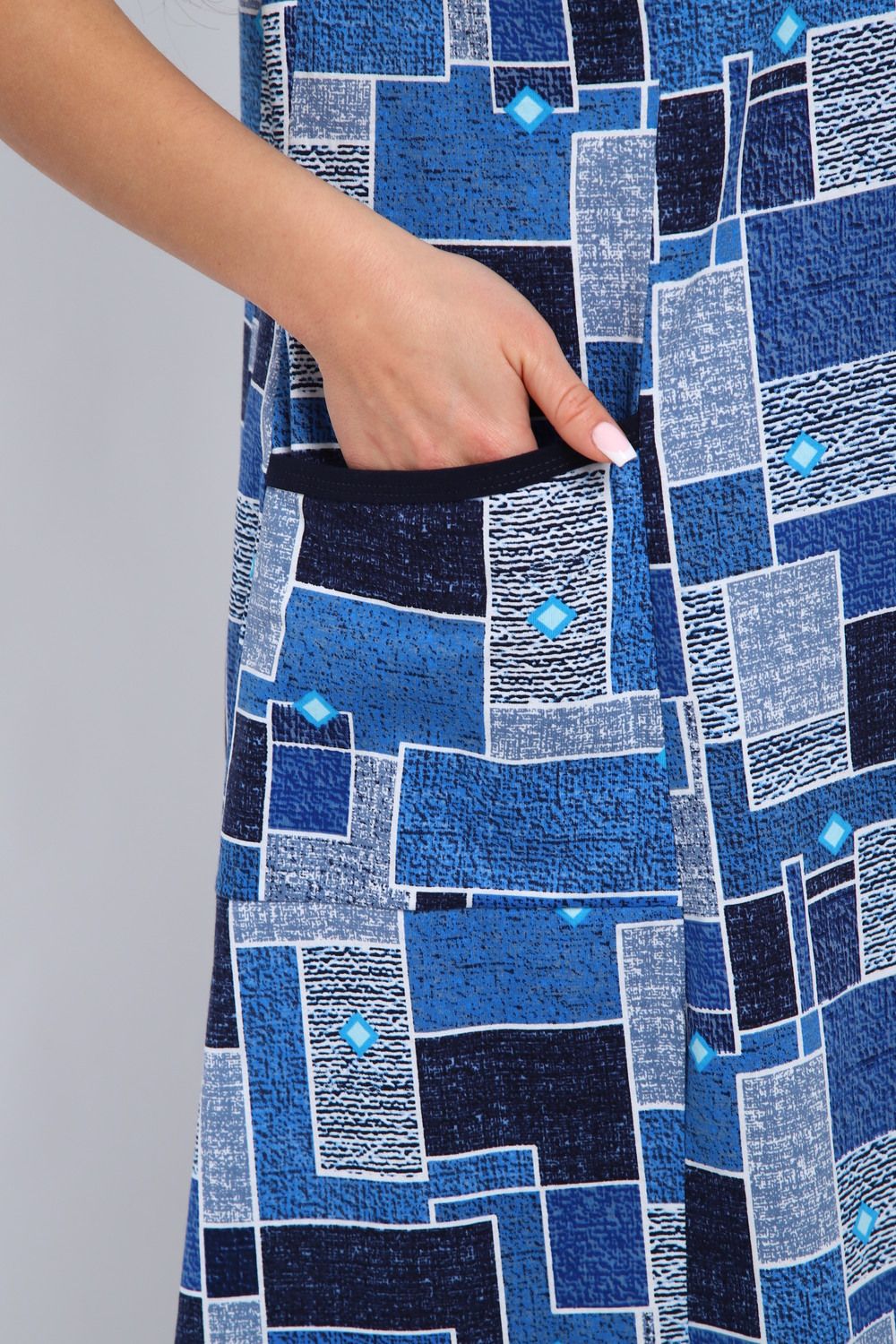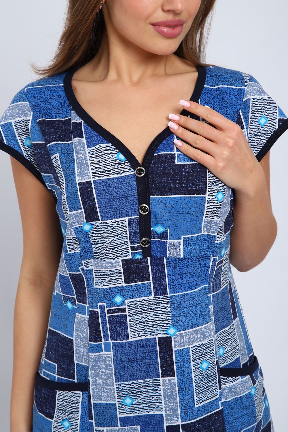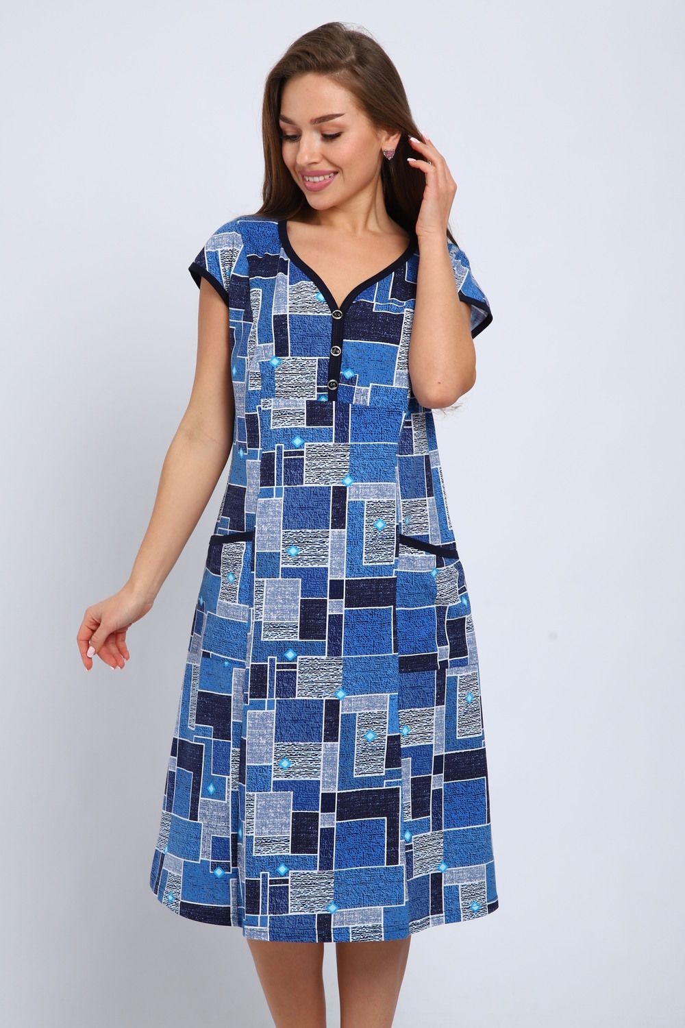 Платье женское выполнено из набивного трткотажного полотна кулирка. Силуэт свободный. Плечо спущенное. Подрез под грудь. На груди застежка на пуговицах до подреза. Карманы в боковых швах.