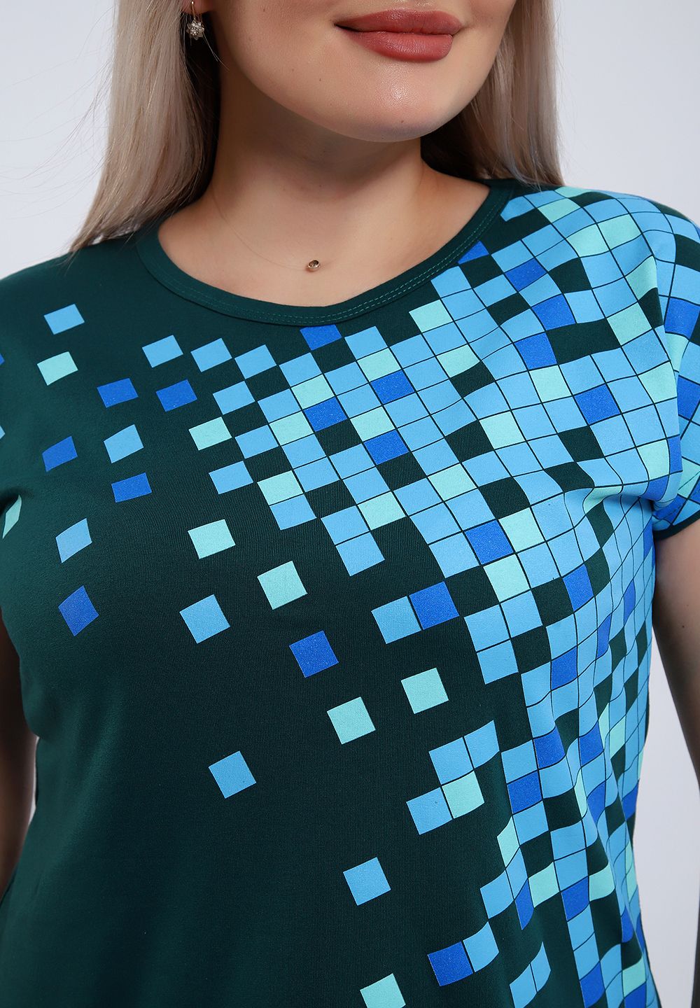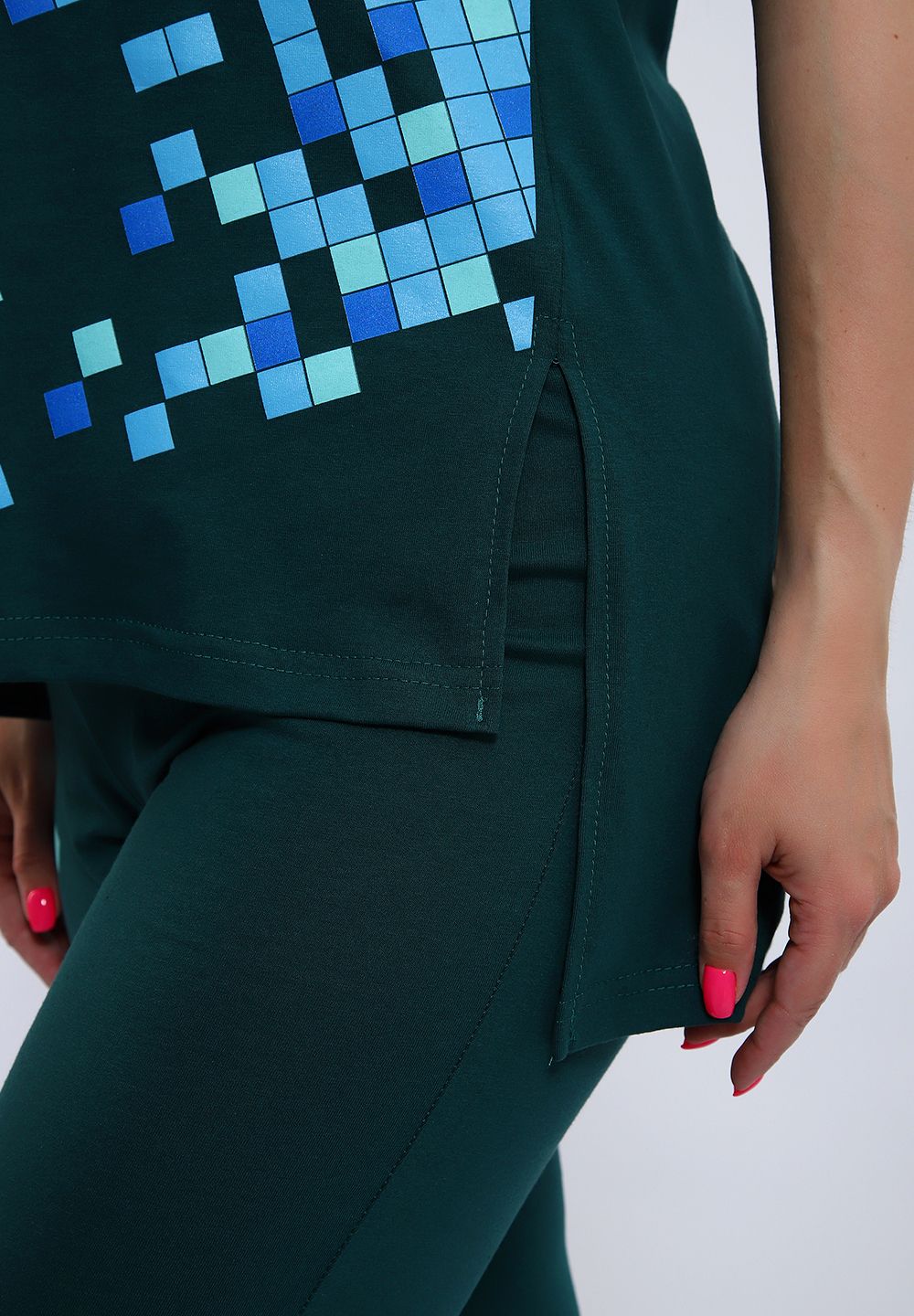 Женский костюм, состоящий из футболки с удлинённой спинкой и бриджей, выполнен из лёгкого и приятного на ощупь материала — 100% хлопка в исполнении кулирной глади. Элегантный геометрический принт "Пиксели".