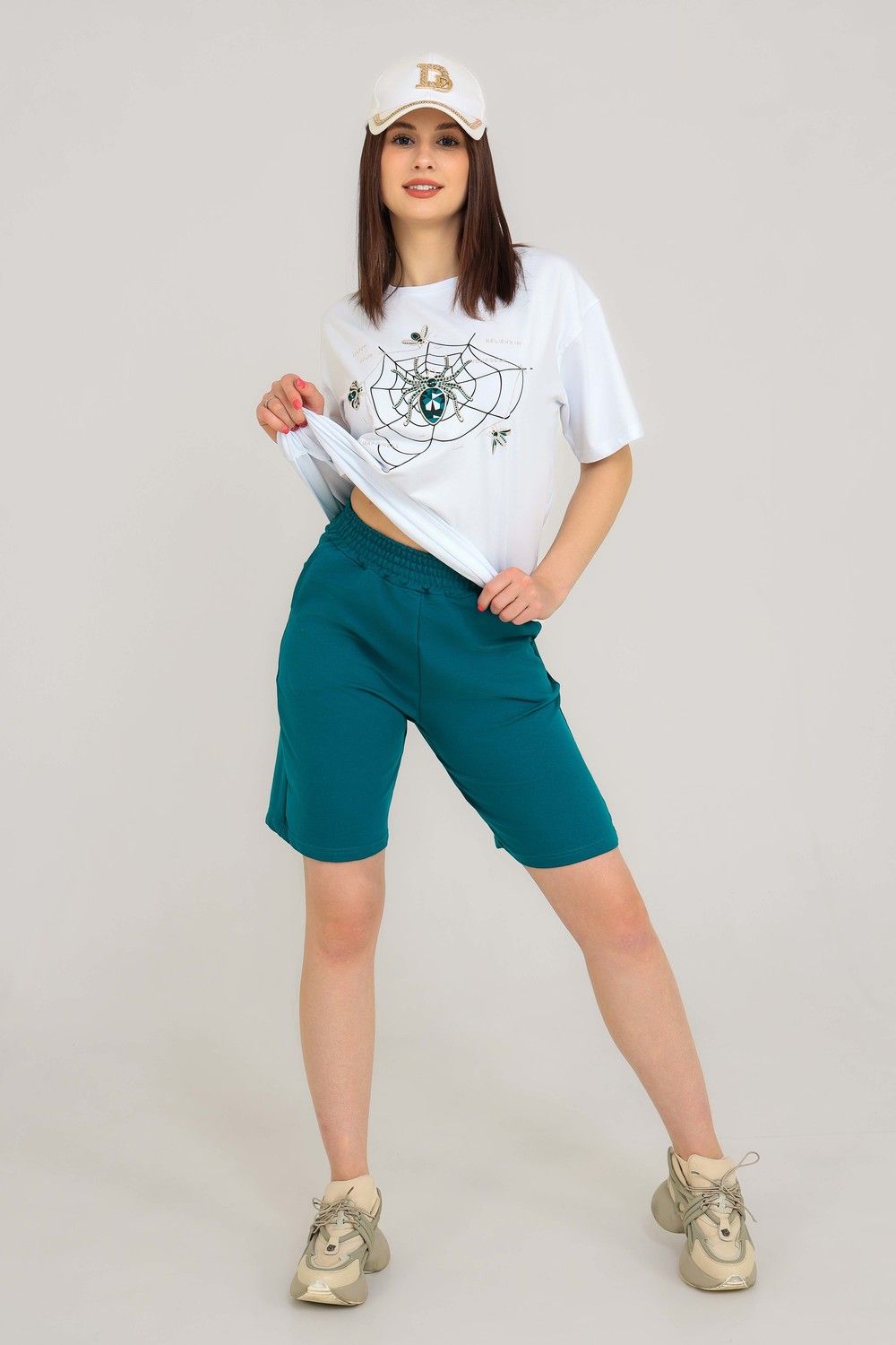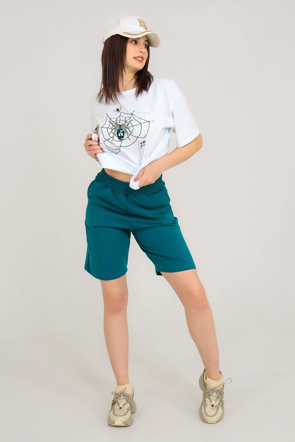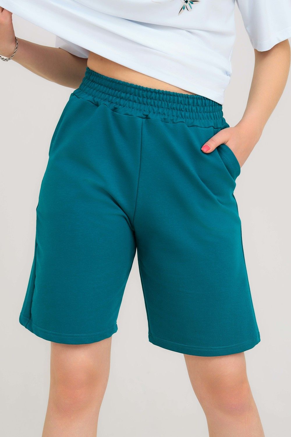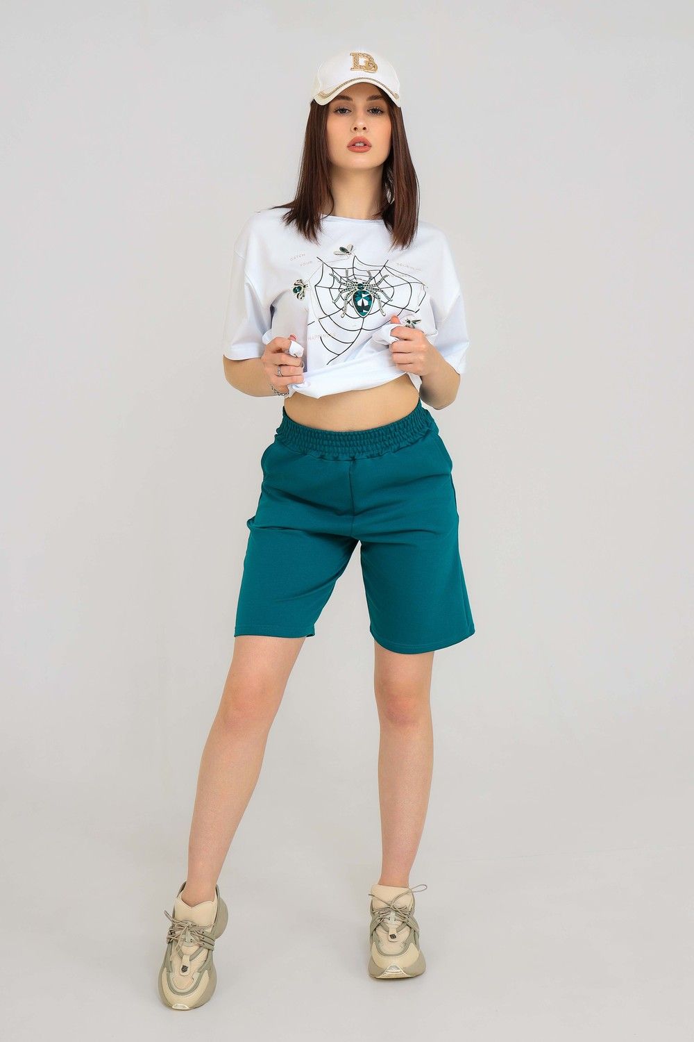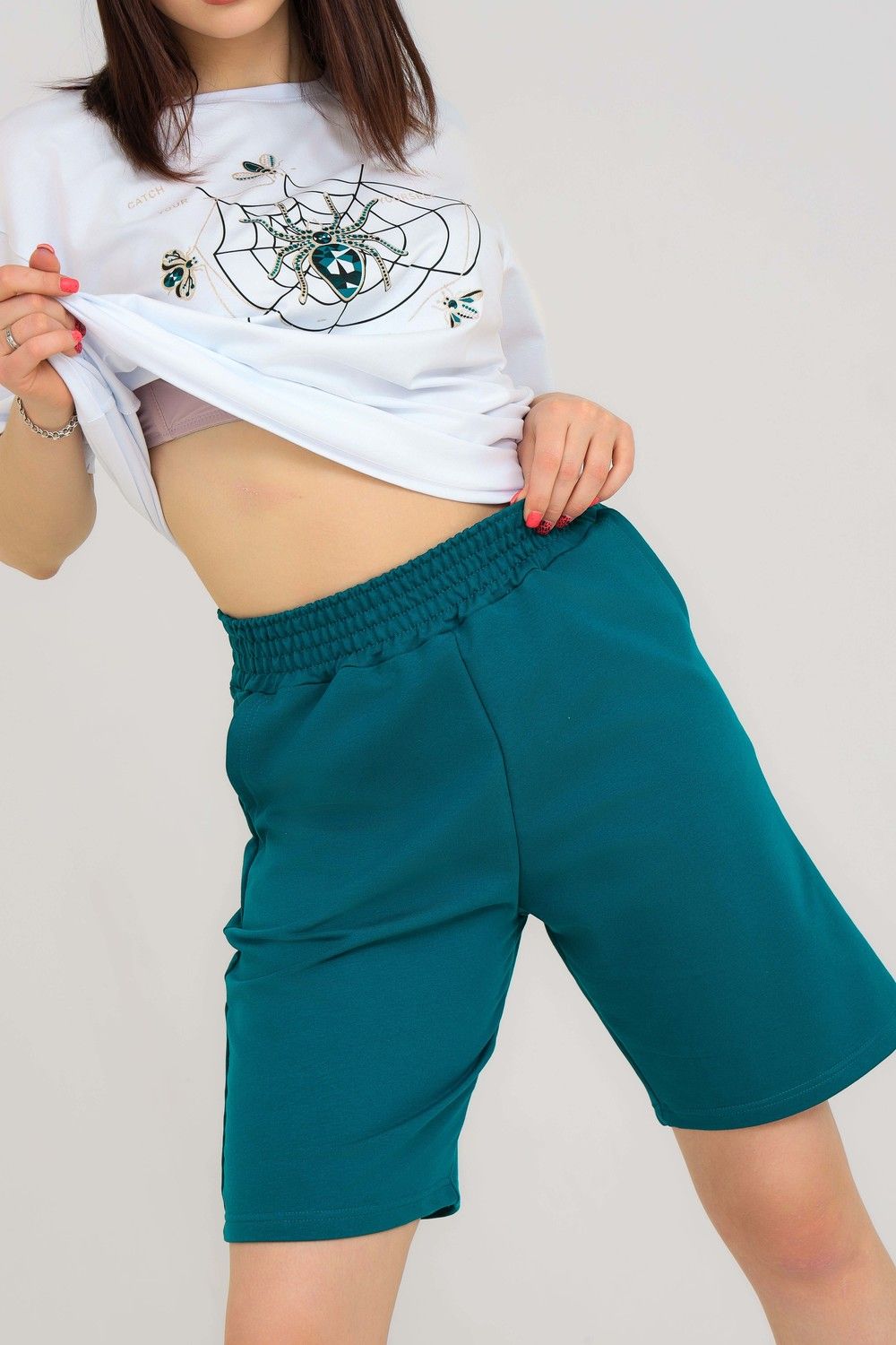 Стильные шорты-бермуды для путешествий, прогулок, фитнеса и повседневного использования. Особенностями данной модели являются высокая посадка и свободный крой, благодаря чему нет скованности движениям. Пояс прошит на поясной машине. Удобные карманы с отрезным бочком. Шорты-бермуды цвета петроль хорошо сочетаются с футболкой № 21580, на которой паучок изображён в такой же цветовой гамме.