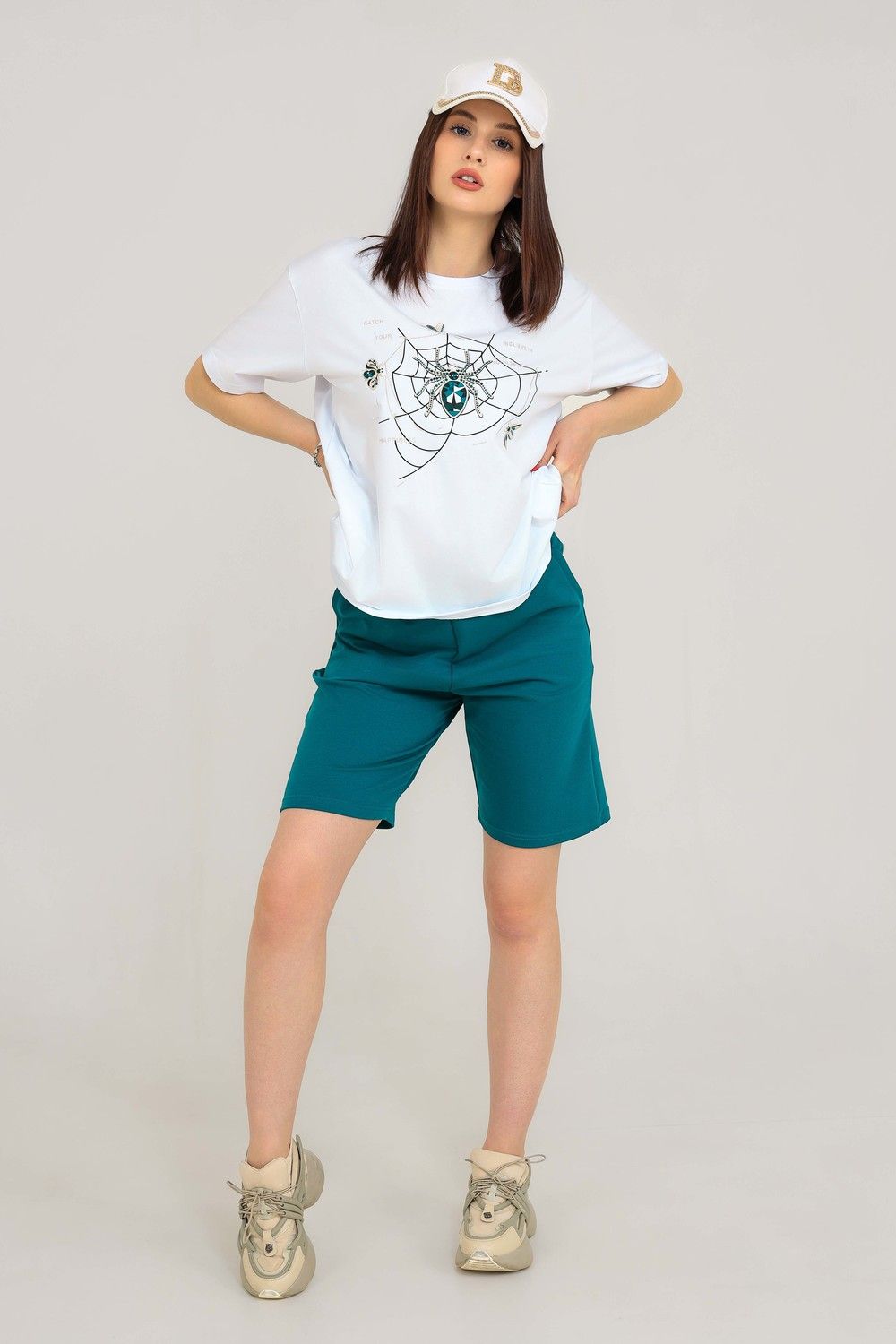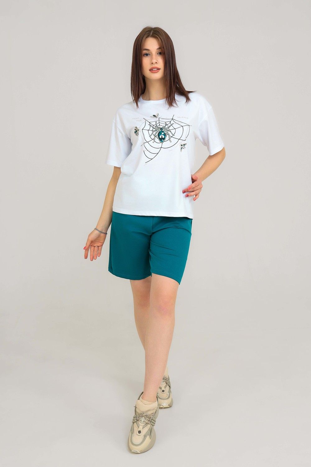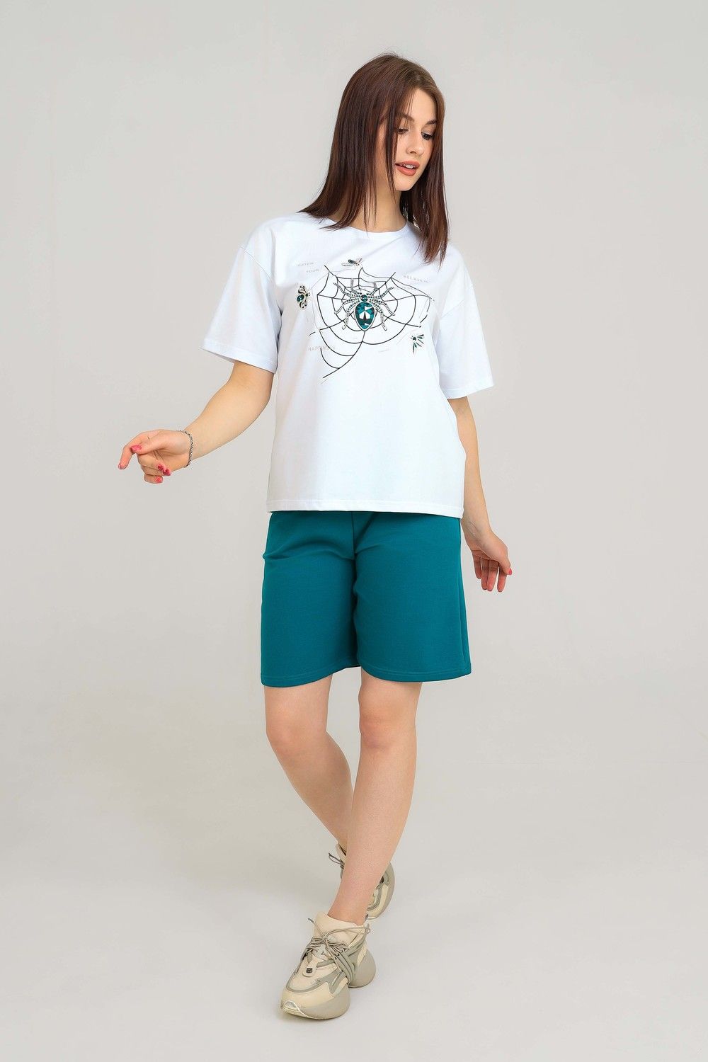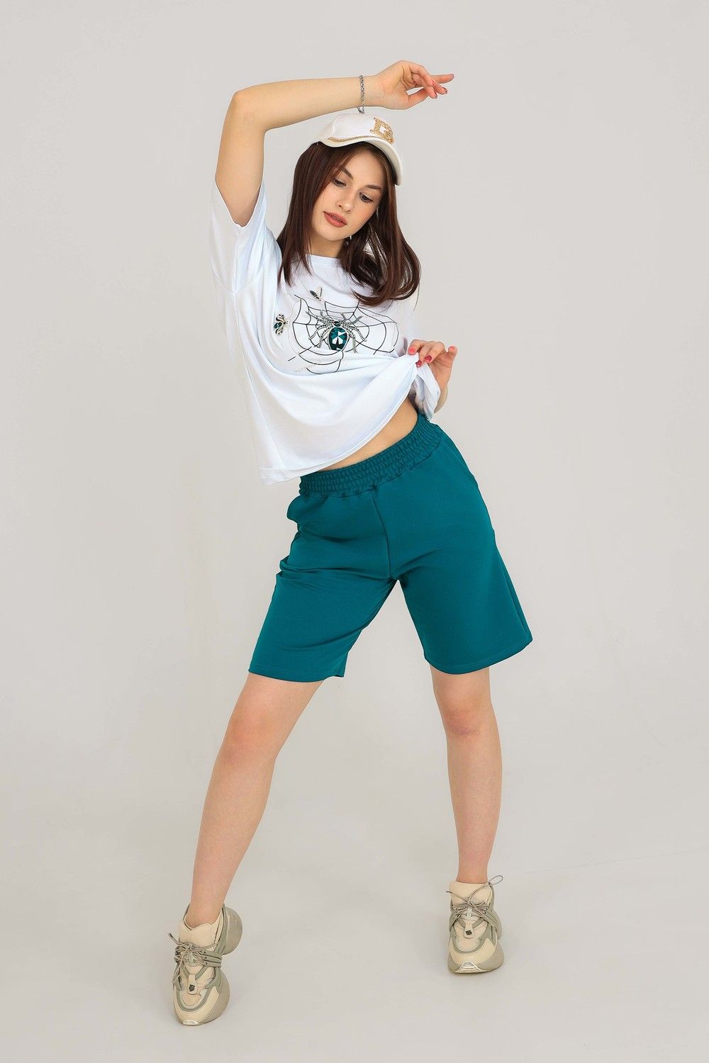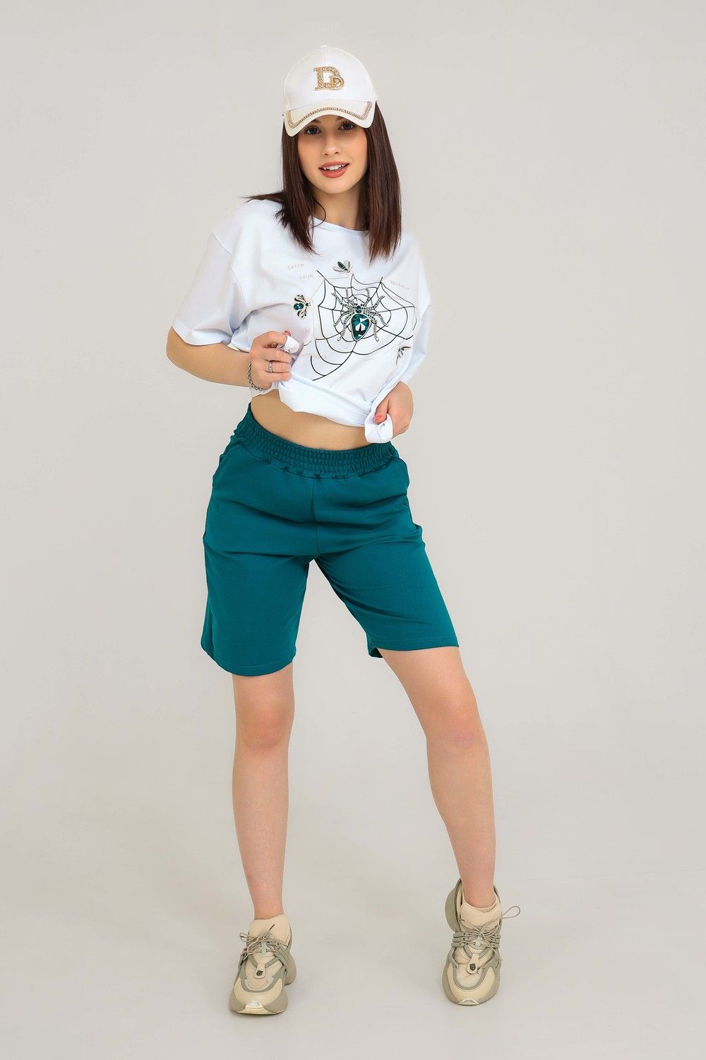 Стильные шорты-бермуды для путешествий, прогулок, фитнеса и повседневного использования. Особенностями данной модели являются высокая посадка и свободный крой, благодаря чему нет скованности движениям. Пояс прошит на поясной машине. Удобные карманы с отрезным бочком. Шорты-бермуды цвета петроль хорошо сочетаются с футболкой № 21580, на которой паучок изображён в такой же цветовой гамме.