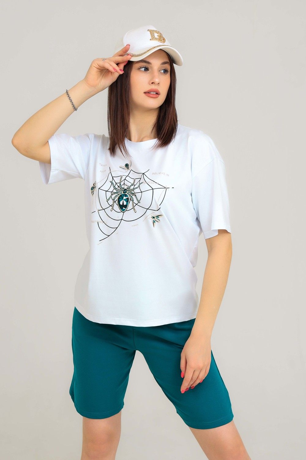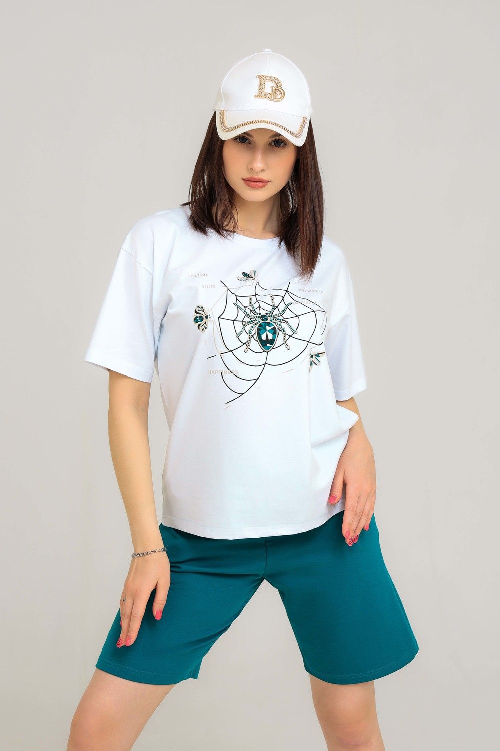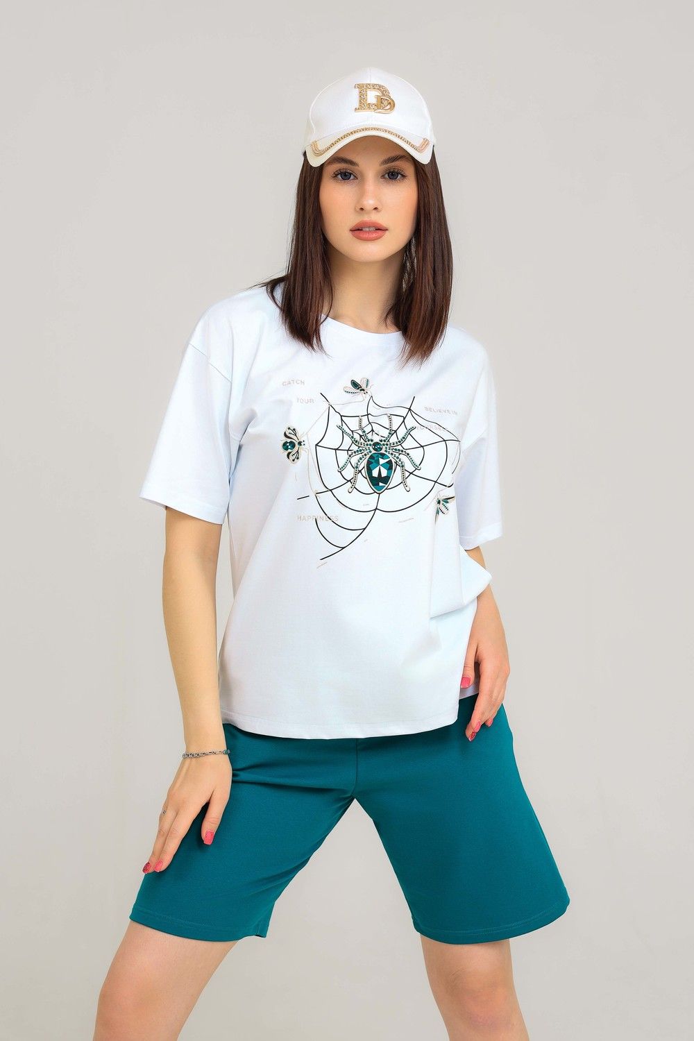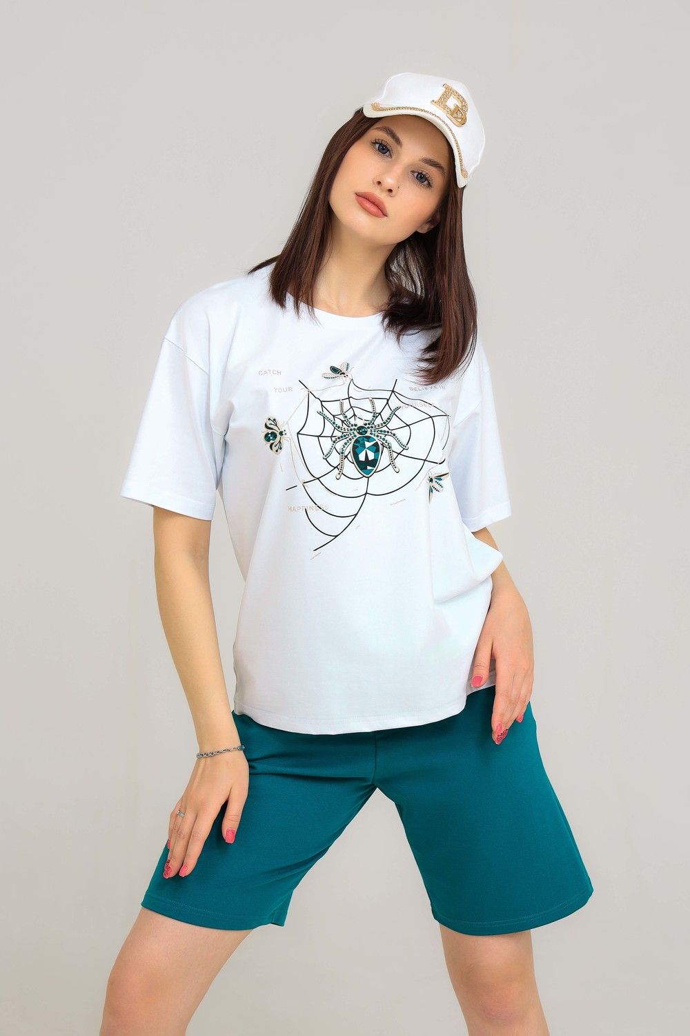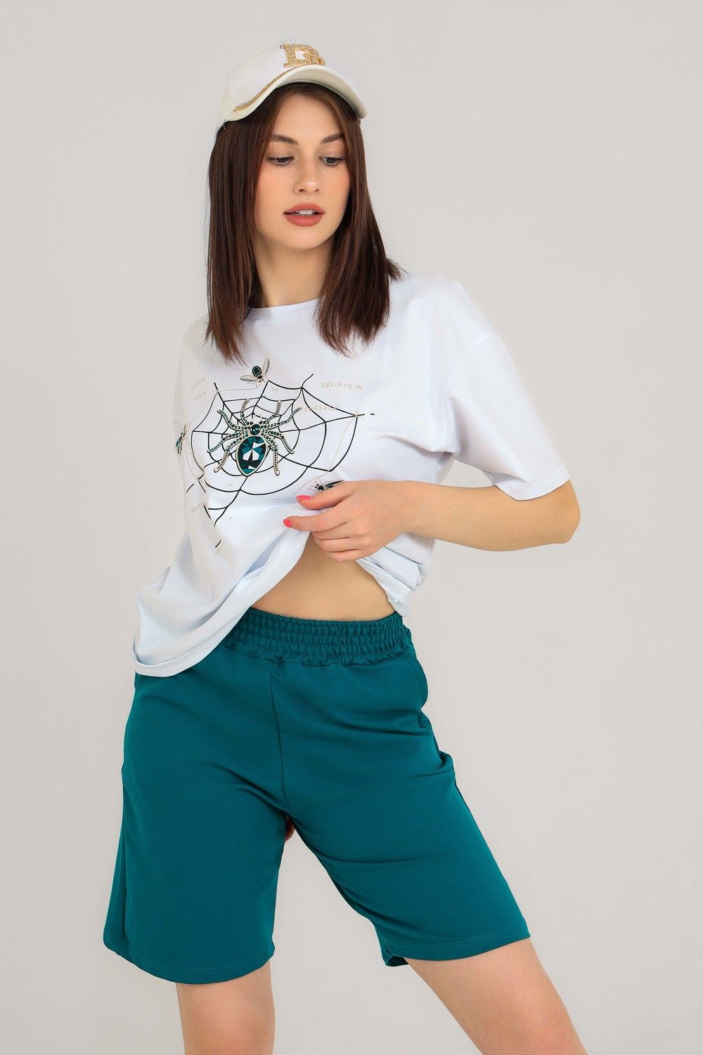 Стильные шорты-бермуды для путешествий, прогулок, фитнеса и повседневного использования. Особенностями данной модели являются высокая посадка и свободный крой, благодаря чему нет скованности движениям. Пояс прошит на поясной машине. Удобные карманы с отрезным бочком. Шорты-бермуды цвета петроль хорошо сочетаются с футболкой № 21580, на которой паучок изображён в такой же цветовой гамме.