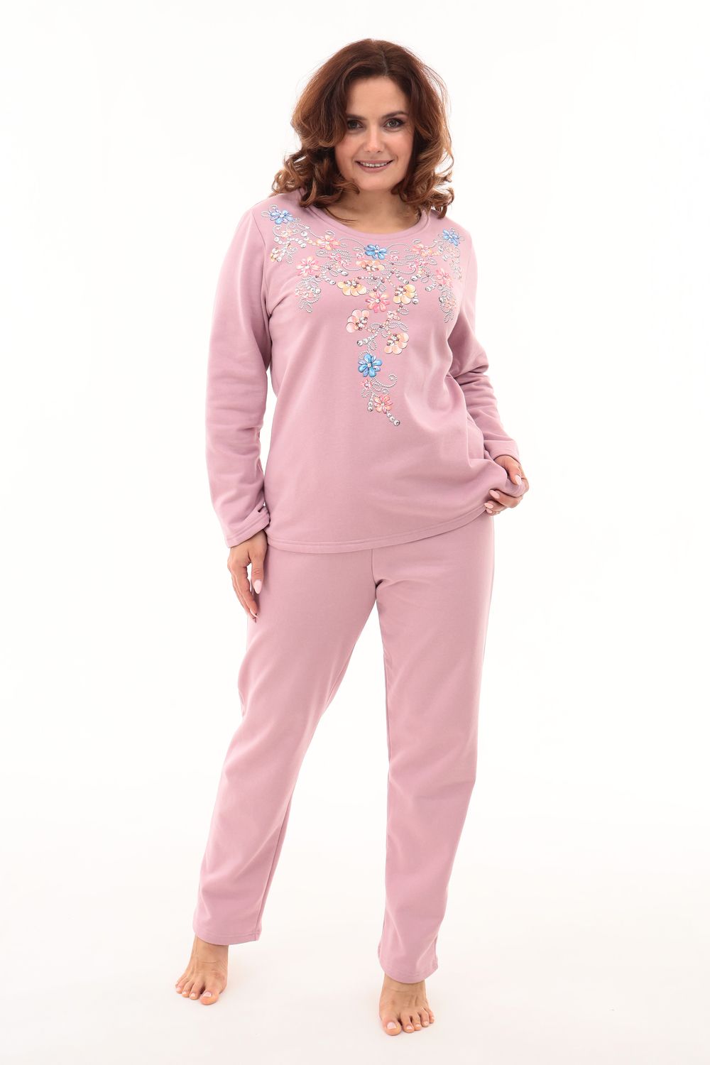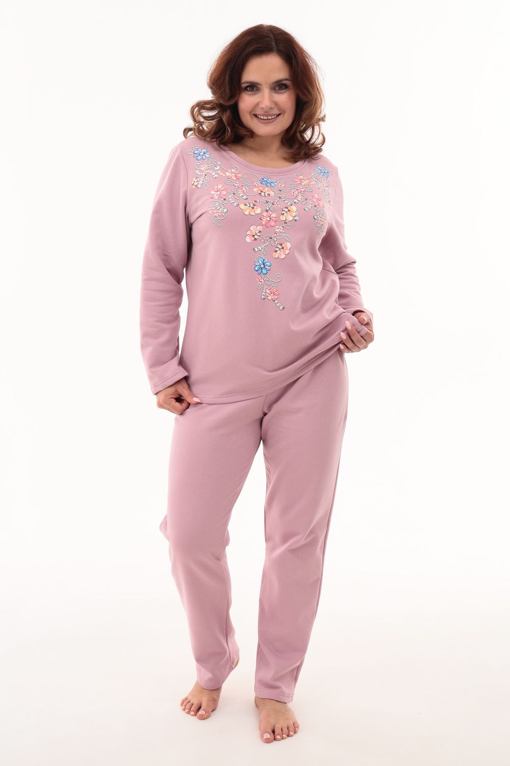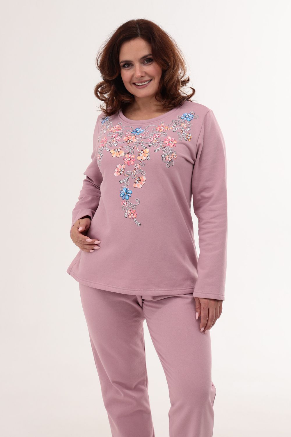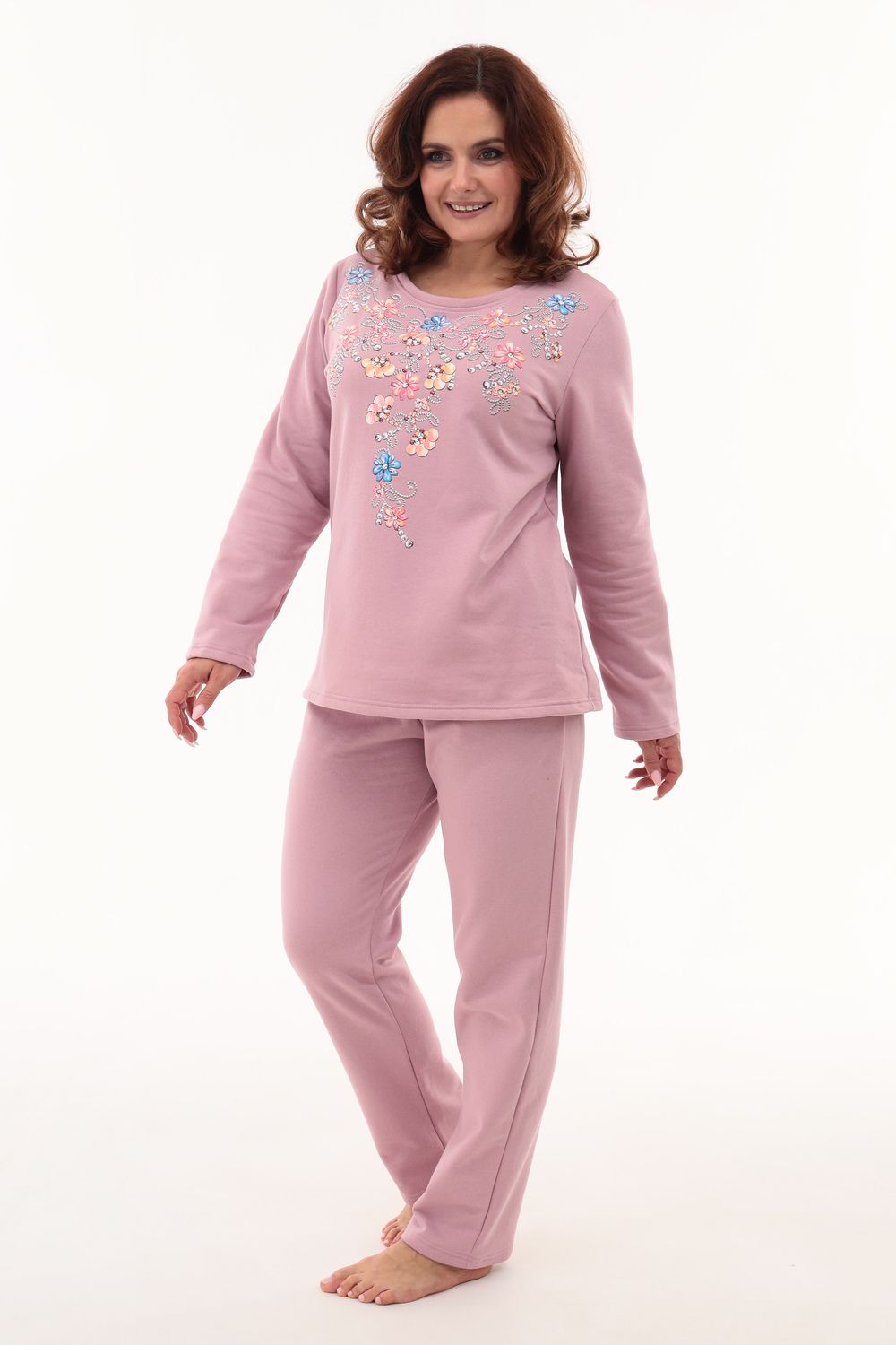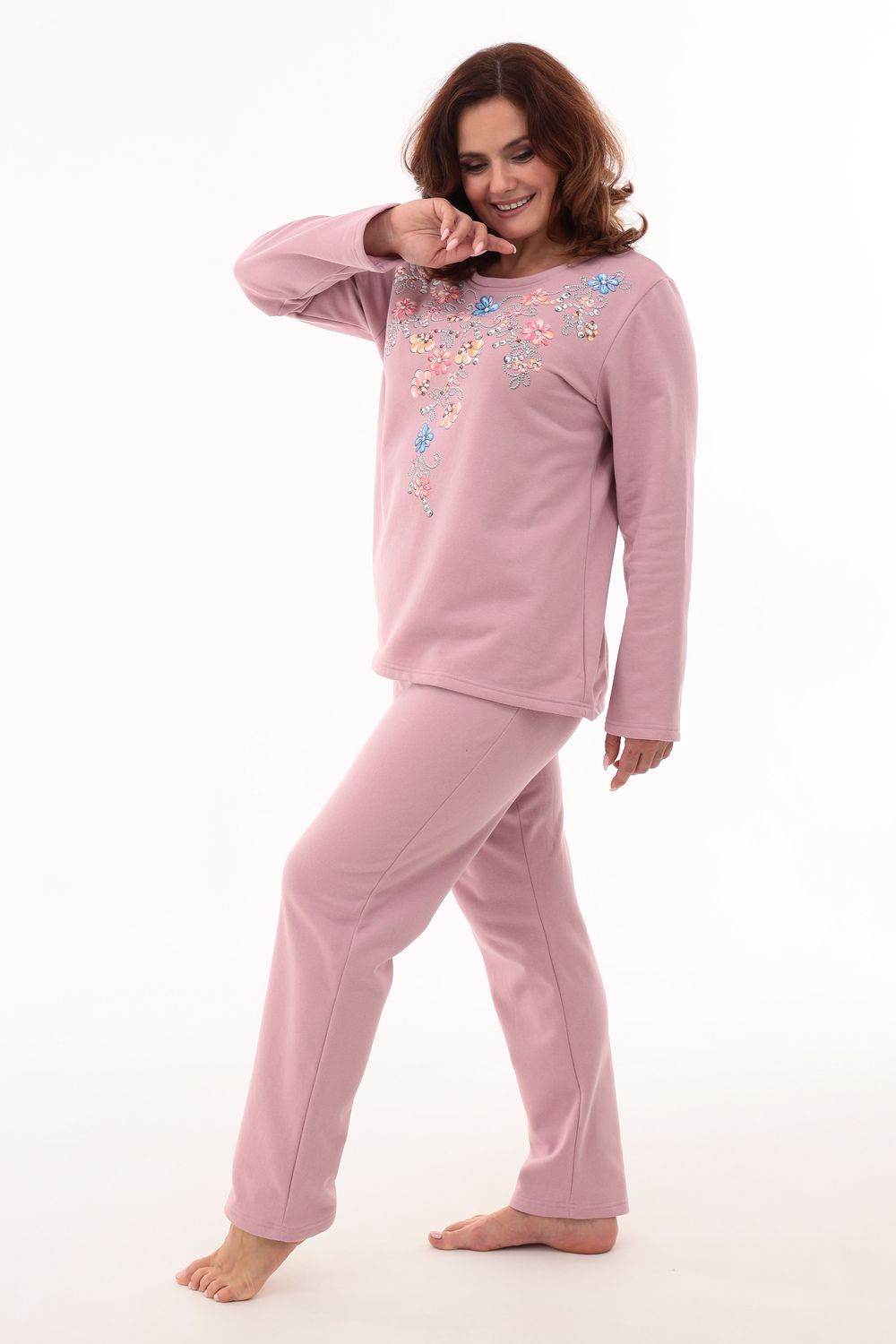 Женская пижама из футера 2-х нитки с начёсом. Дизайн позволяет использовать данную модель как пижаму для сна, так и в качестве костюма для дома. Брюки и лонгслив свободного кроя. Нежный изящный принт в виде россыпи жемчуга и цветов. В измерениях обхвата талии указан размер резинки, которая растягивается без проблем до стандартных измерений фигуры. Очень удобная высокая посадка брюк. Длинные рукава для уюта и тепла.