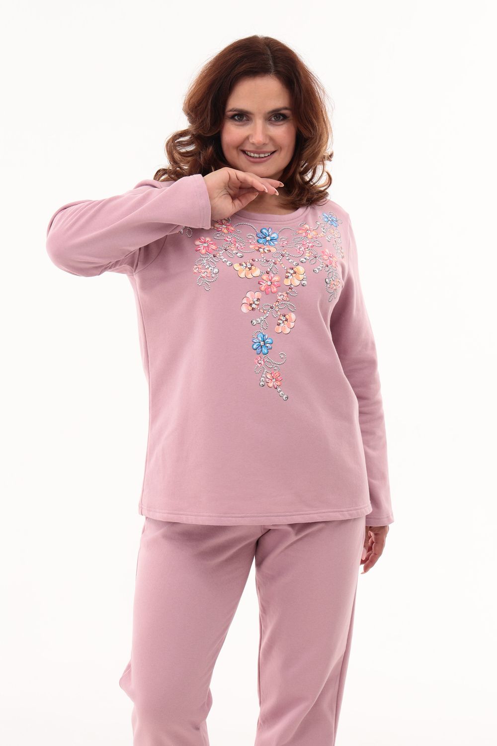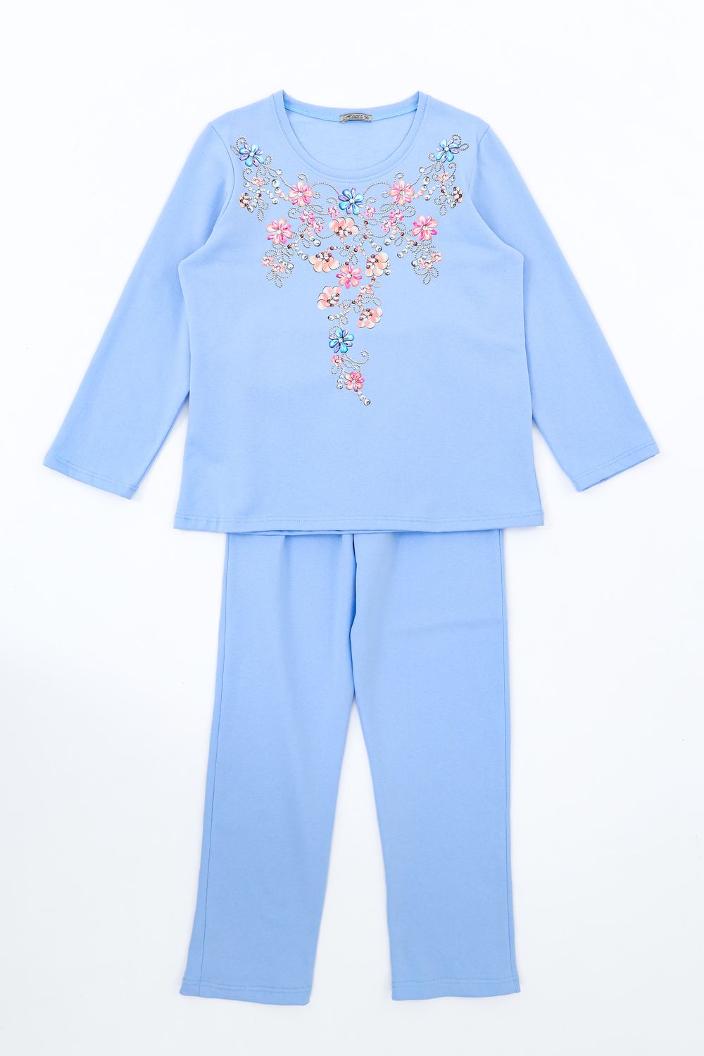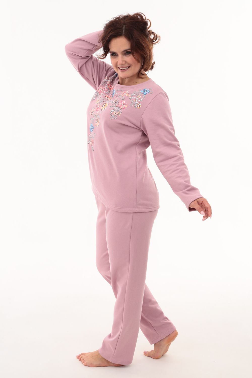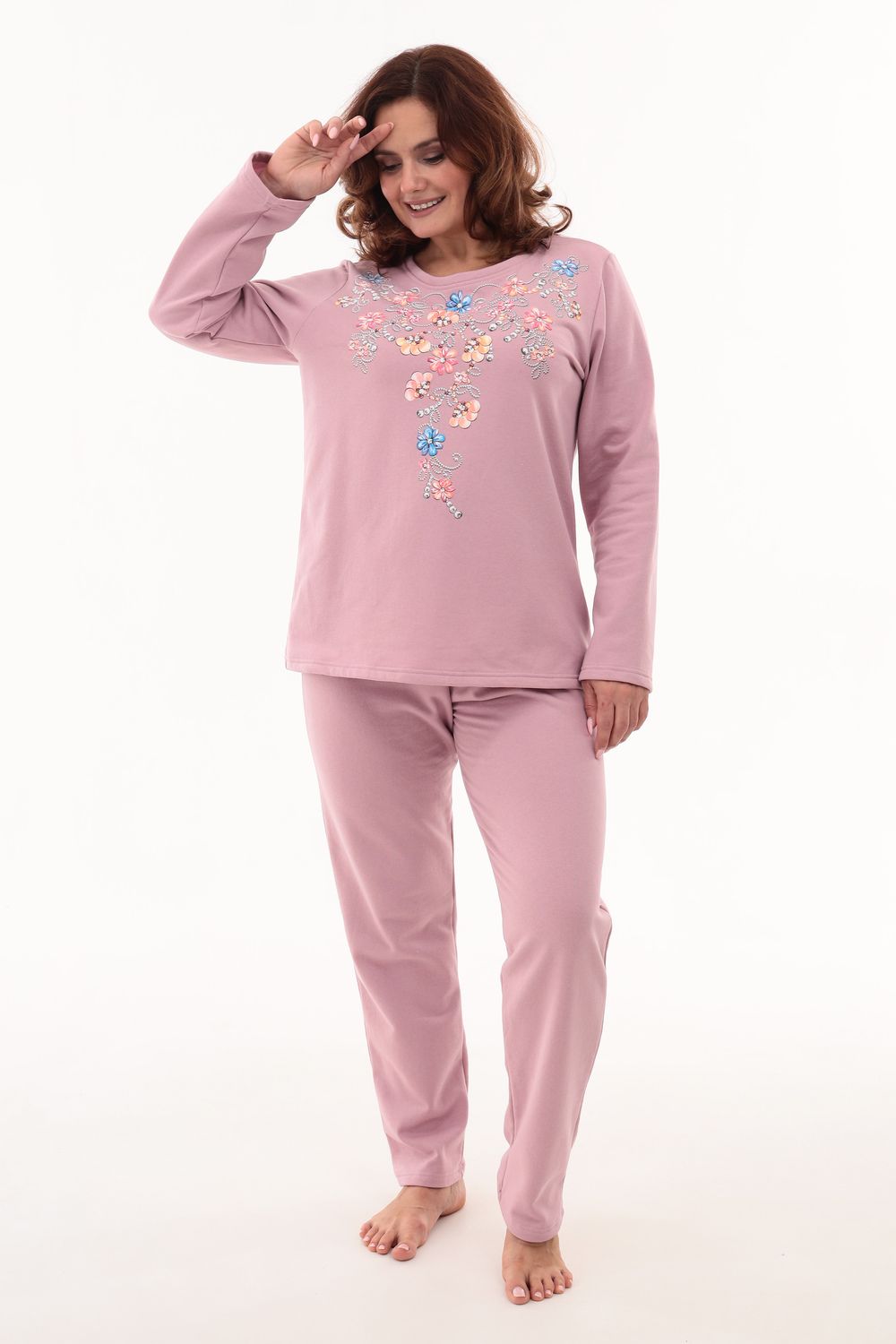Женская пижама из футера 2-х нитки с начёсом. Дизайн позволяет использовать данную модель как пижаму для сна, так и в качестве костюма для дома. Брюки и лонгслив свободного кроя. Нежный изящный принт в виде россыпи жемчуга и цветов. В измерениях обхвата талии указан размер резинки, которая растягивается без проблем до стандартных измерений фигуры. Очень удобная высокая посадка брюк. Длинные рукава для уюта и тепла.