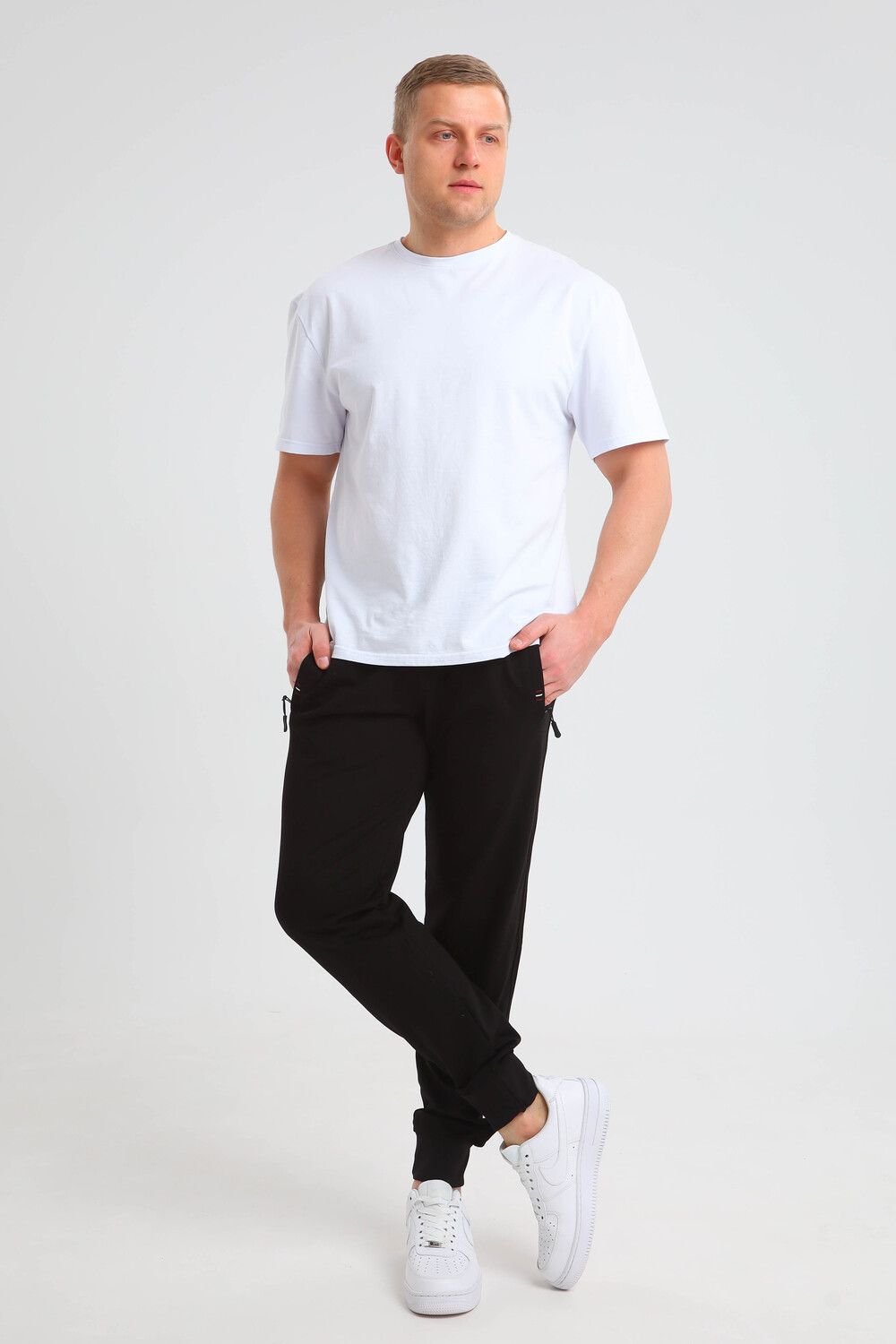 Мужские, спортивные брюки. Пояс на резинке, по бокам два кармана с молнией. Низ на манжетах. Они изготовлены из высококачественного трикотажа, за счет чего штаны не вытягиваются на месте колен и не теряют свой вид. Удобная, приятная к телу ткань и не ограничивает движения. Подойдут для спорта, отдыха и повседневной носки.
