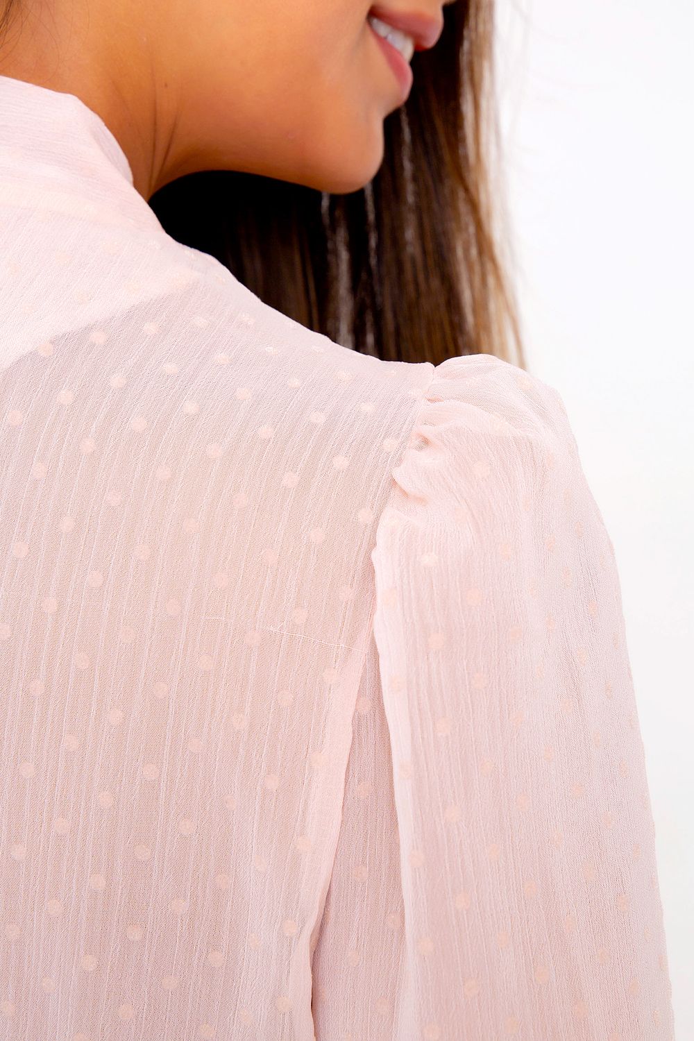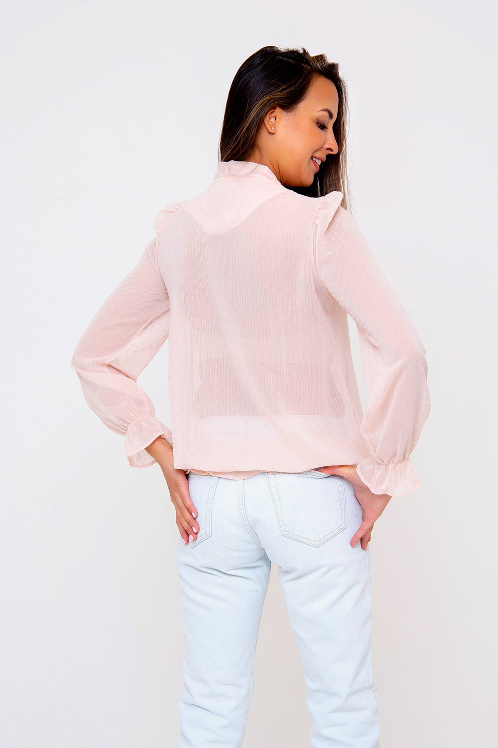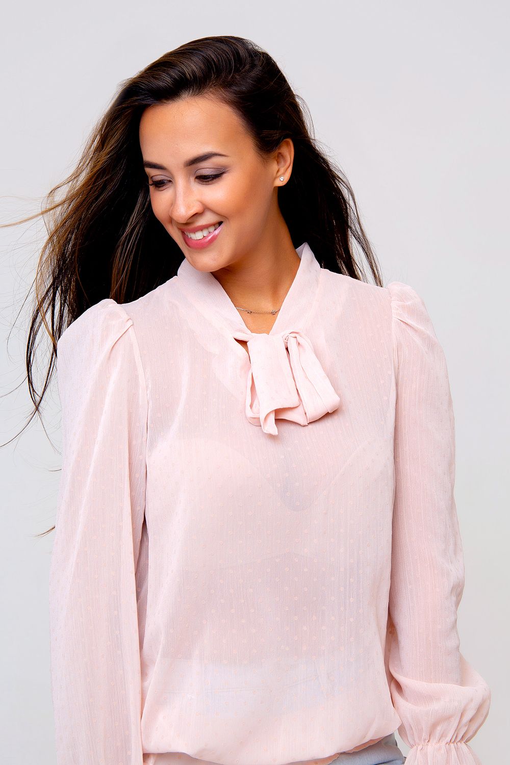 Лёгкая блуза нежнейшего оттенка. Модель выполнена из полупрозрачного материала, что придаёт лёгкости и воздушности образу. Горловина оформлена бантом, который добавляет ещё большего шарма и изысканности. Рукав 3/4. Изделие дополнено резинками на рукавах и по краю изделия. Состав: 100% полиэстер. Длина изделия см. Рост модели на фото 173 см.
